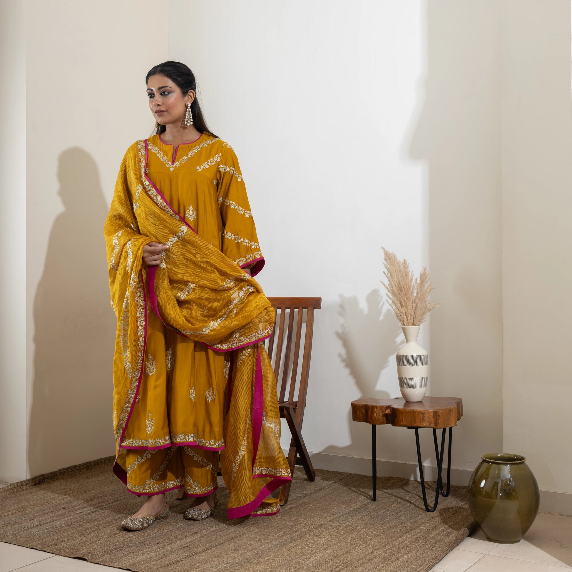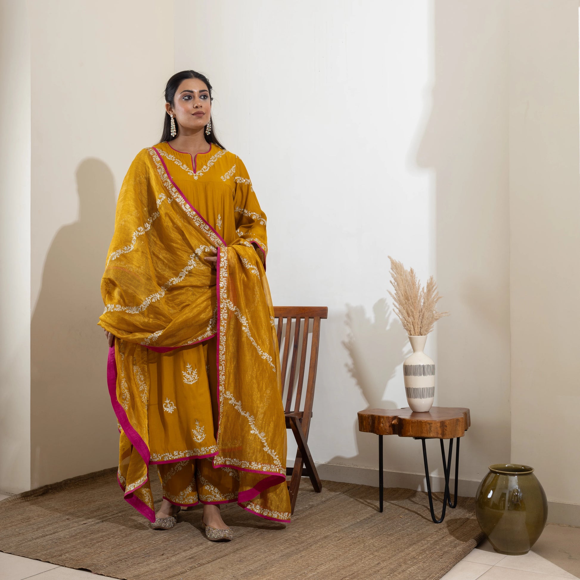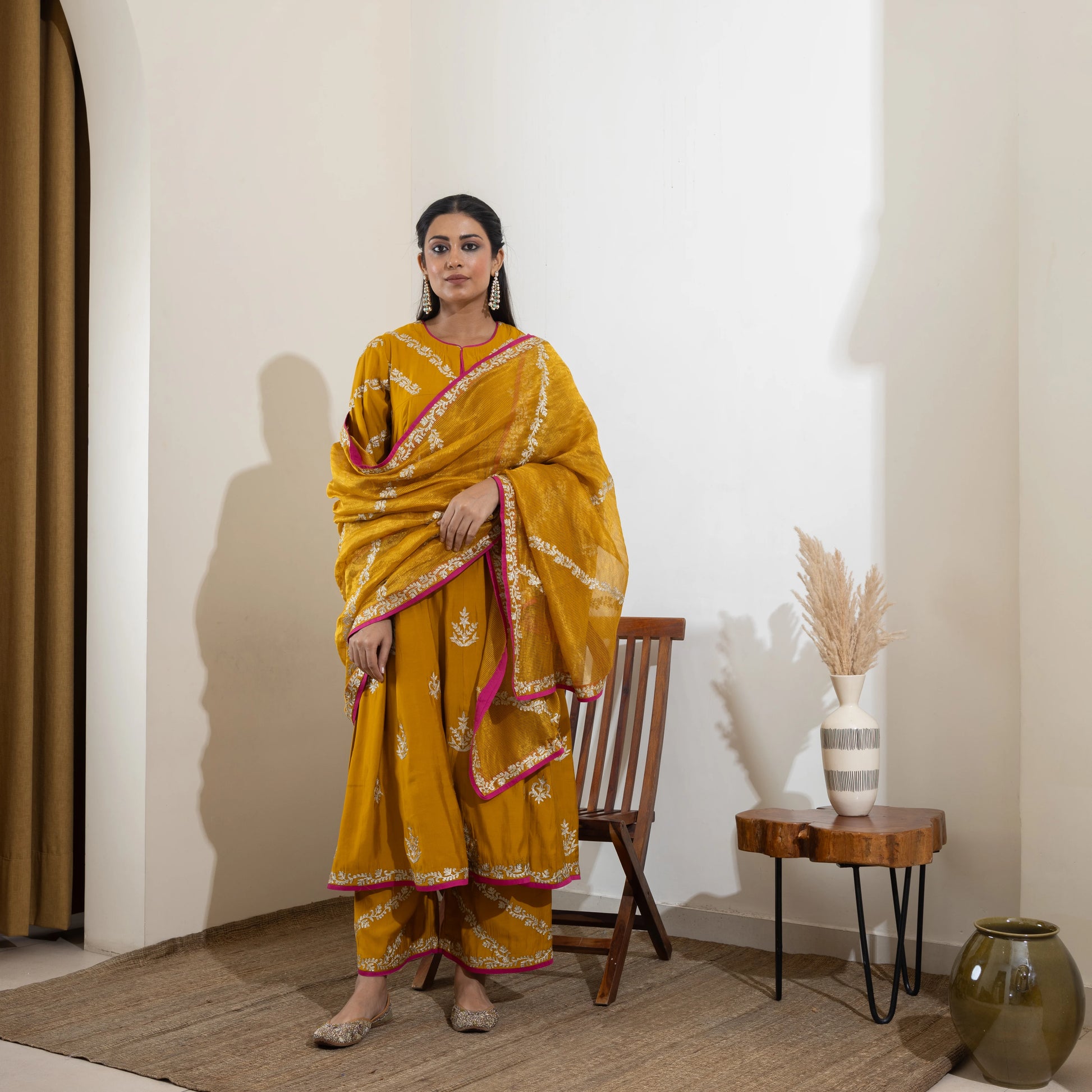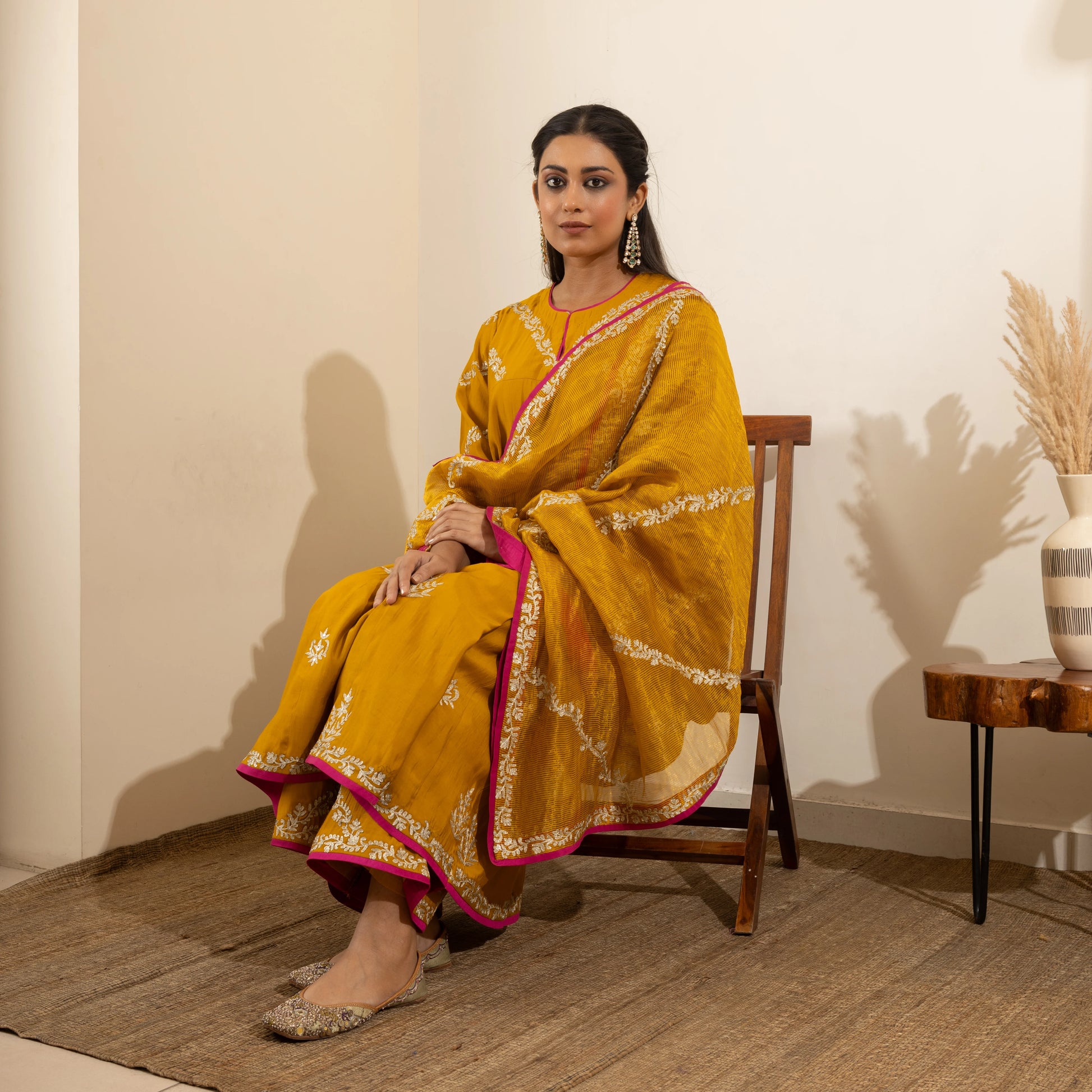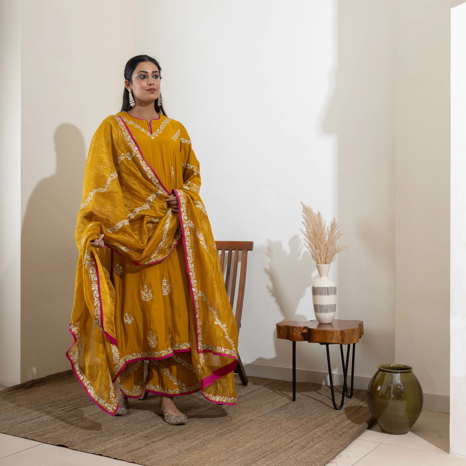 Mustard yellow Anarkali with Aari zari and hand sequin embroidery, paired with a gold-striped Banarasi tissue dupatta and embroidered pants. Customizable in any color.