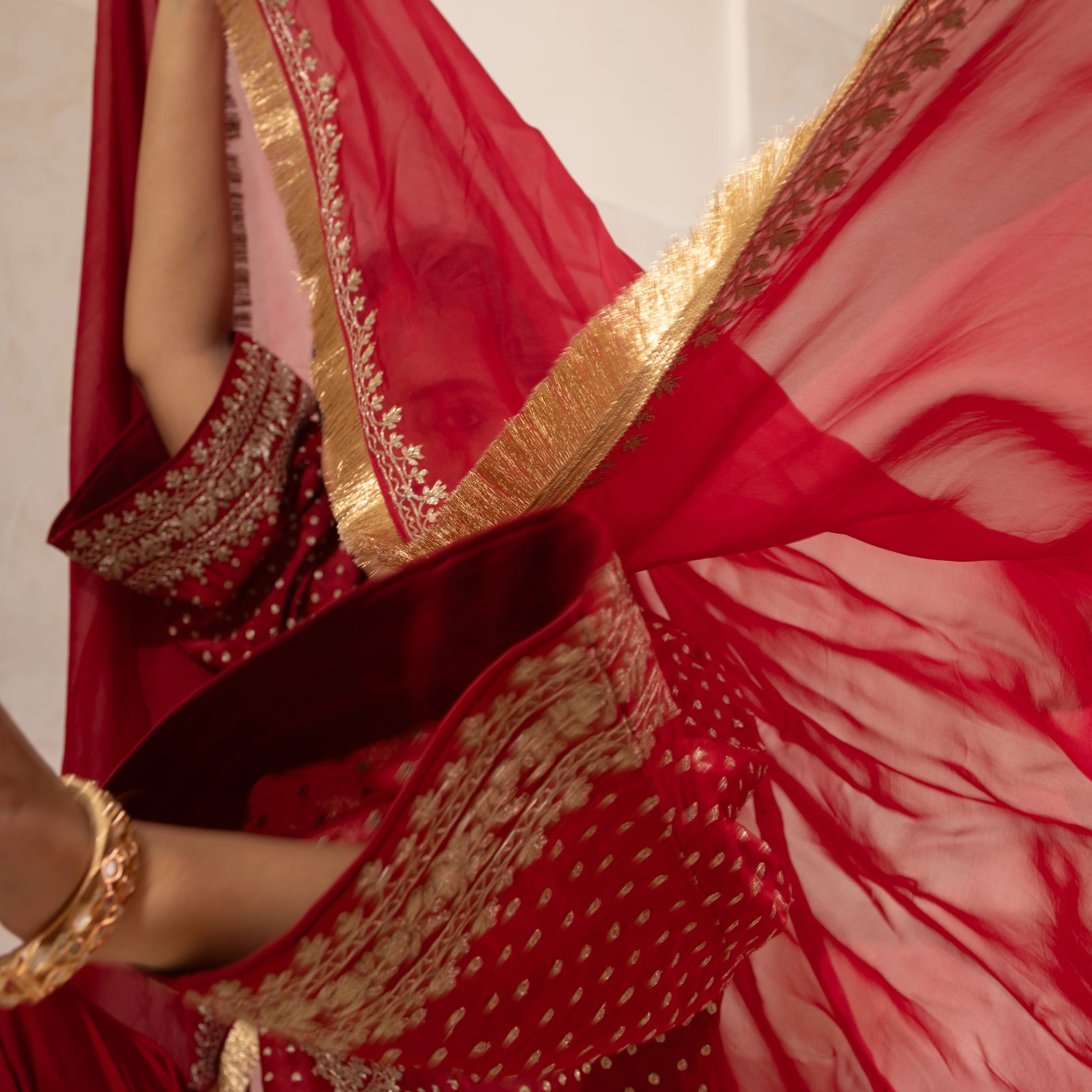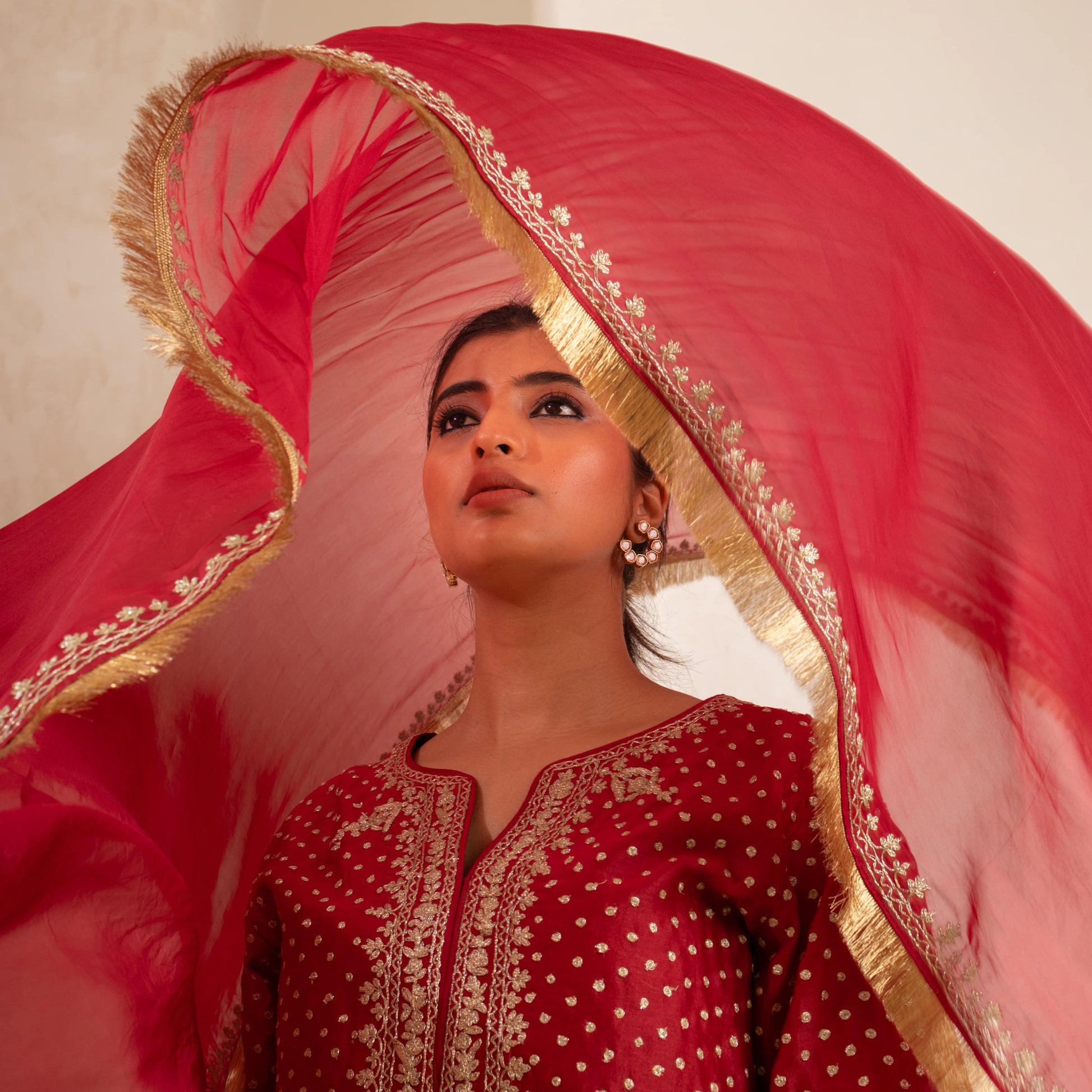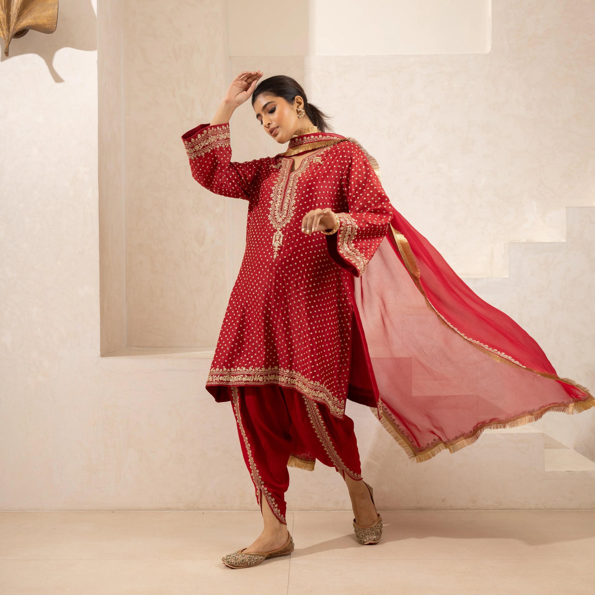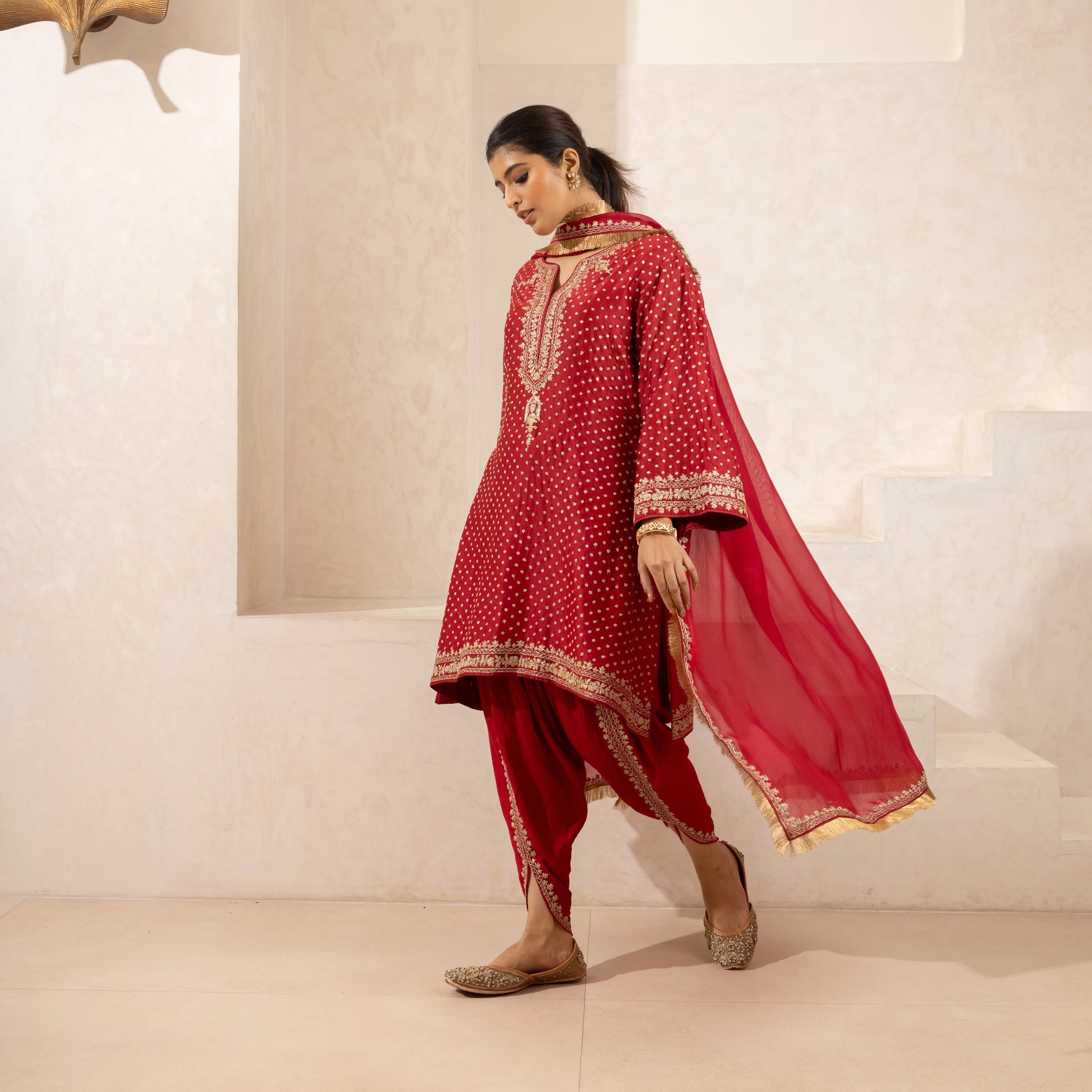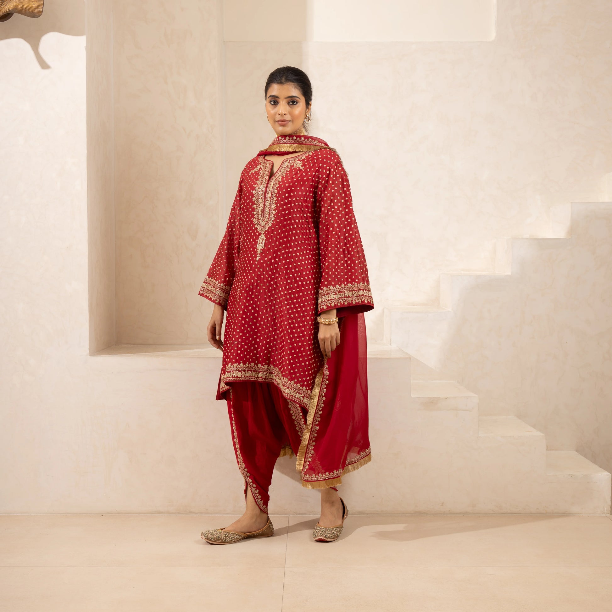 A Chanderi silk kurta and dhoti set in red, featuring fine Dori embroidery, paired with an embroidered dupatta. Available in red and customizable in any color.