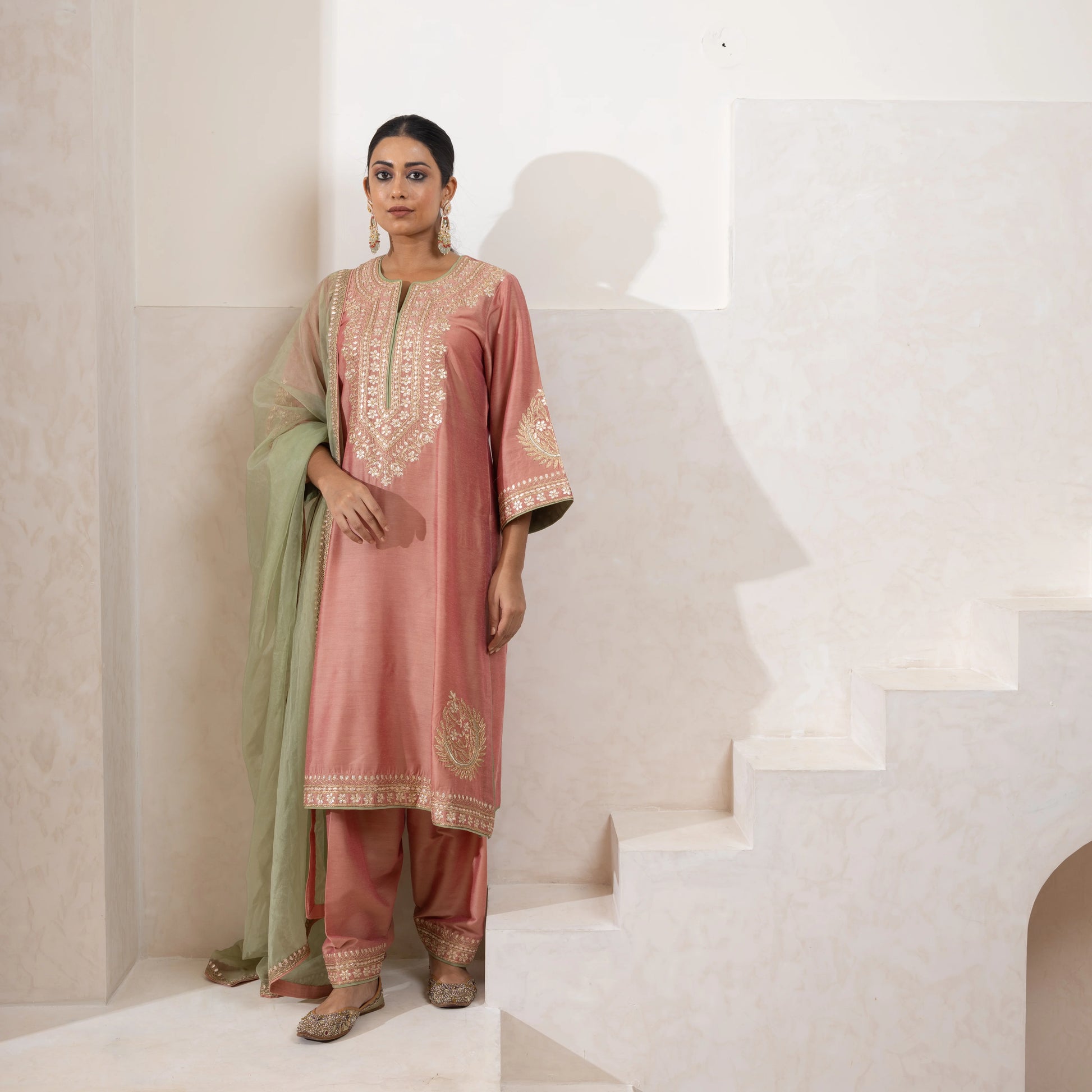A peach and mint green kurta set adorned with fine Dori and gota patti embroidery, paired with a Pakistani salwar and an organza dupatta. Customizable in any color.