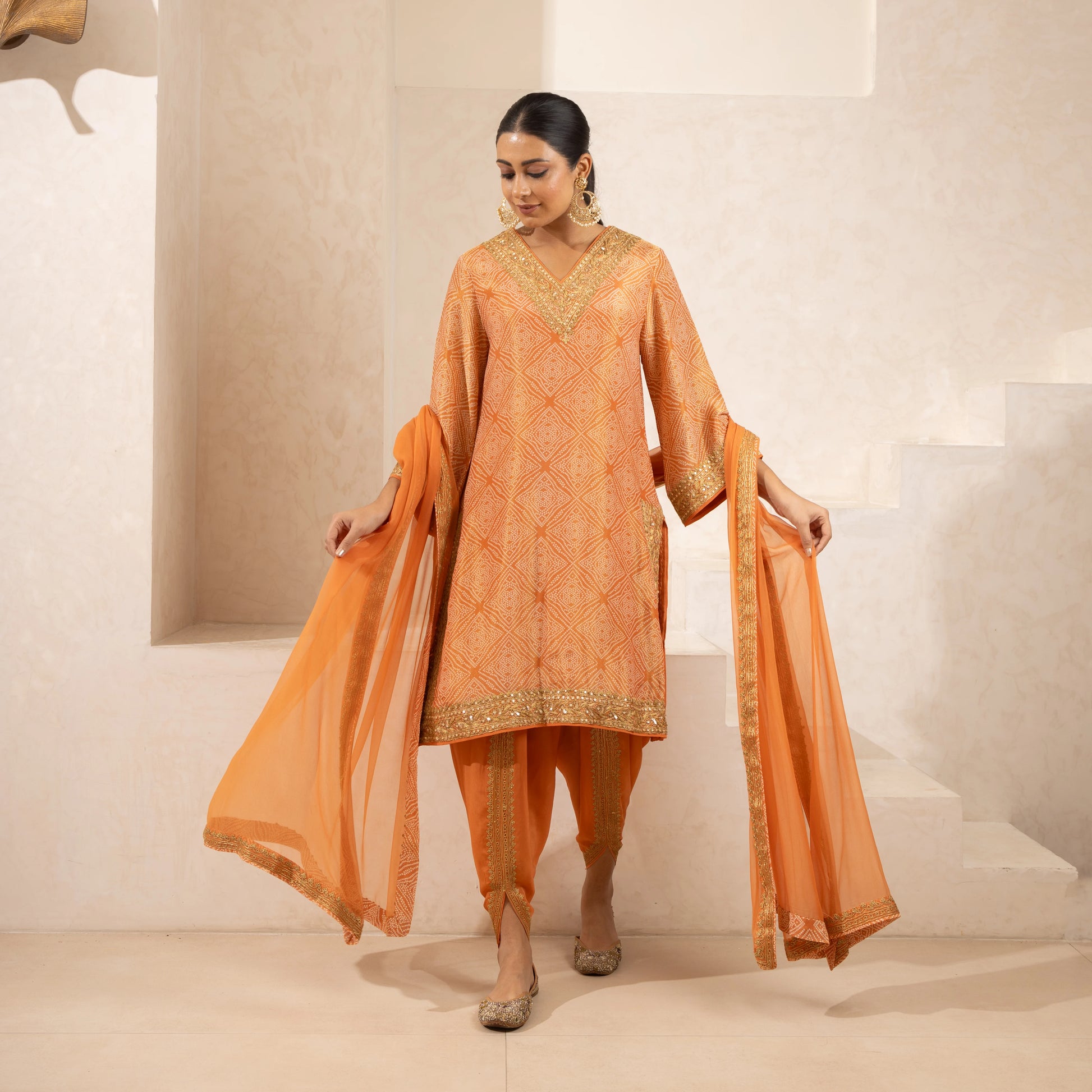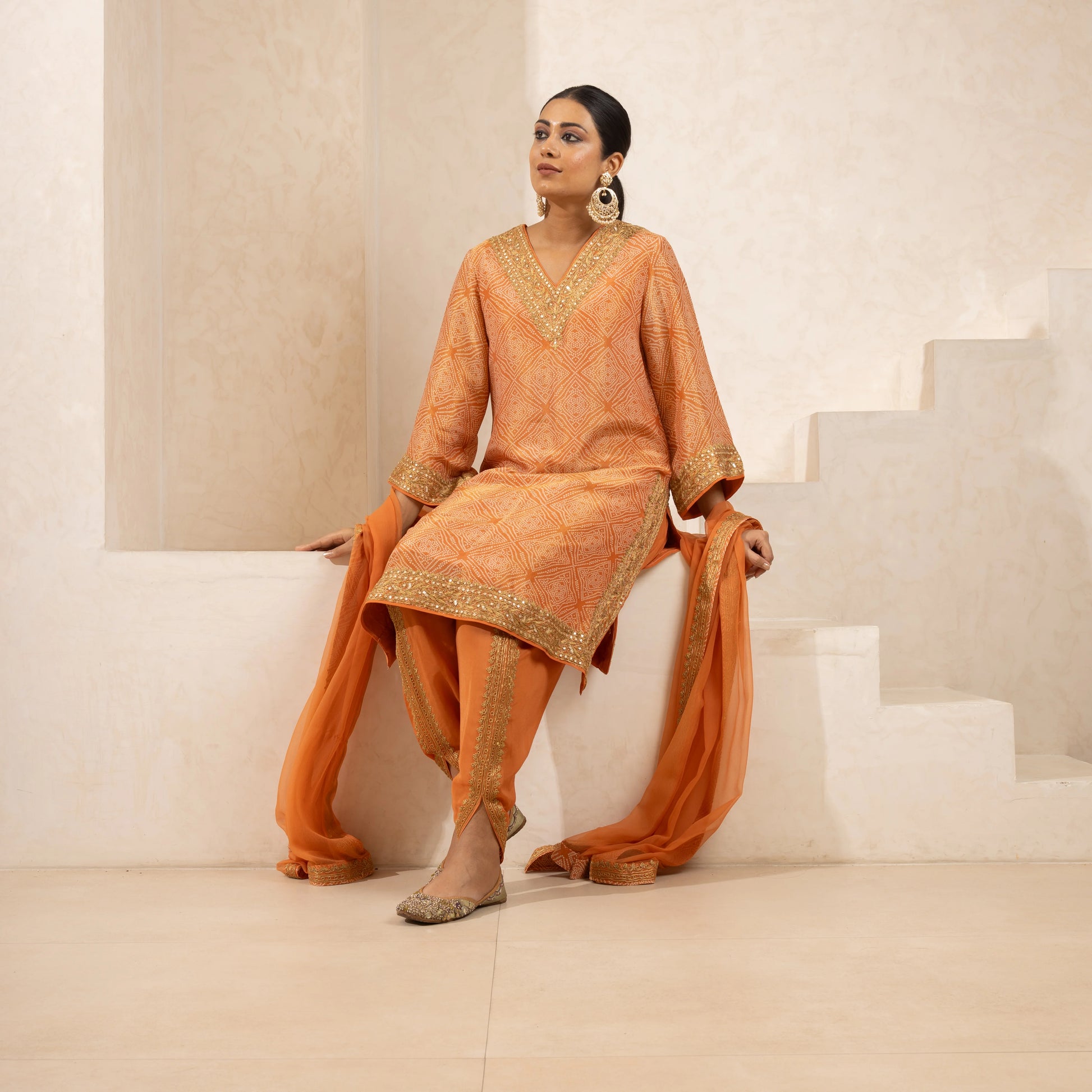 A rust Bandhani-printed kurta and dhoti set, featuring fine Dori embroidery for a touch of traditional elegance.