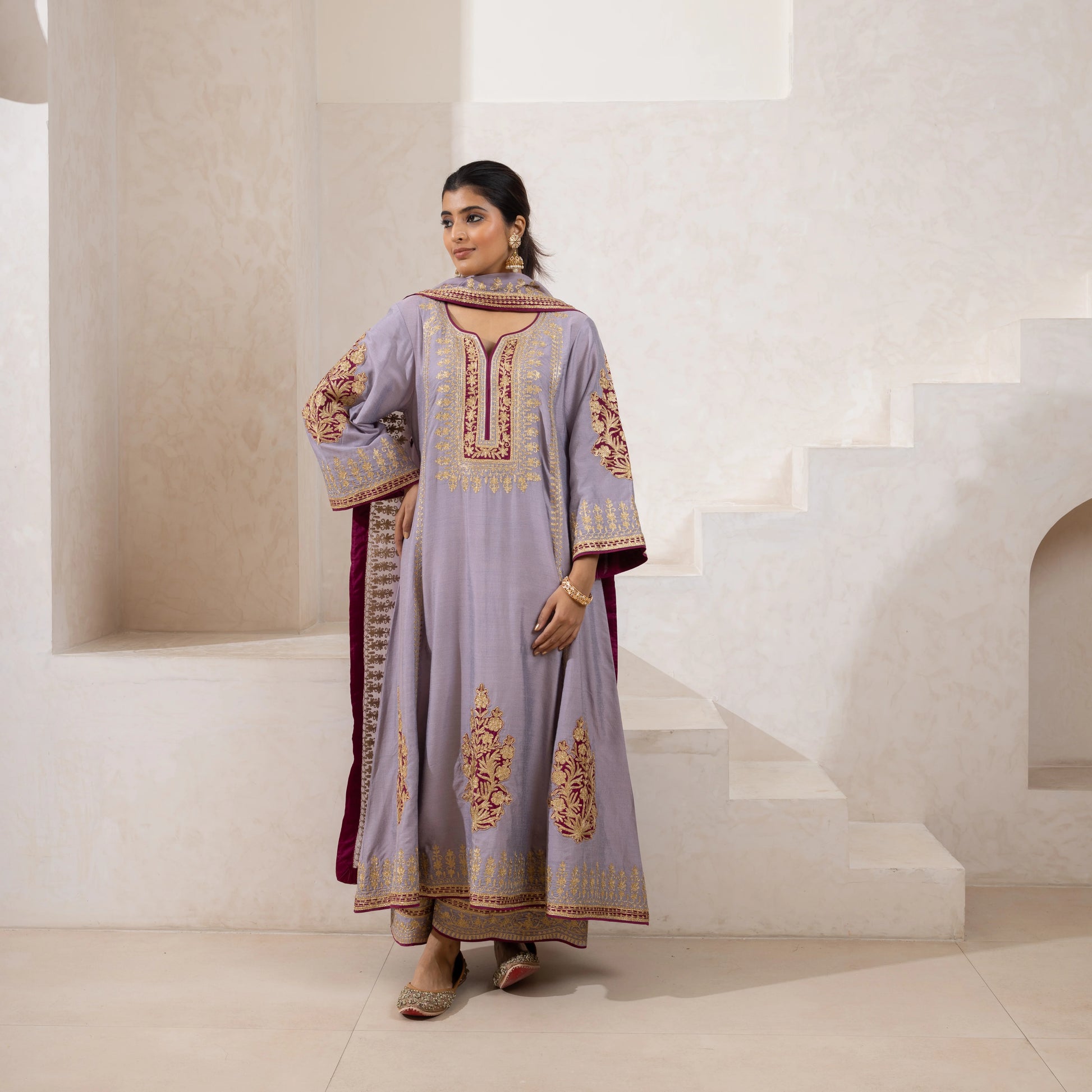 Appliqué and Aari zari-embroidered kurta set in pure cotton silk, paired with an embroidered Farshi and an organza dupatta. Customizable in any color.