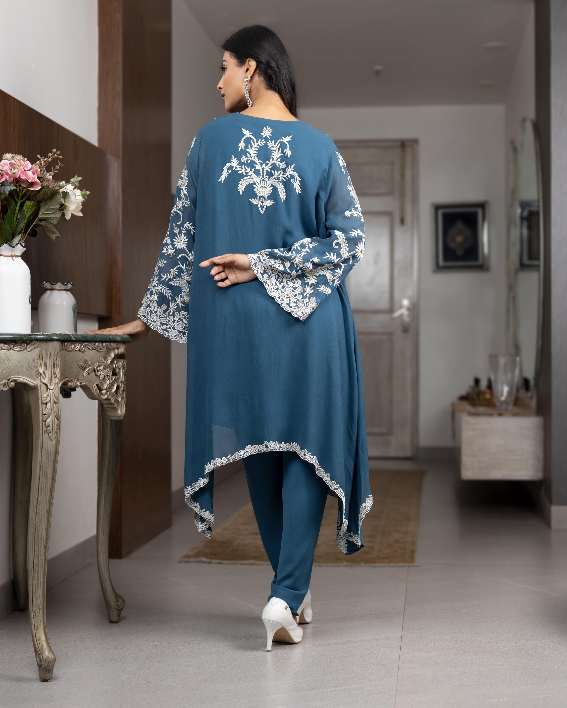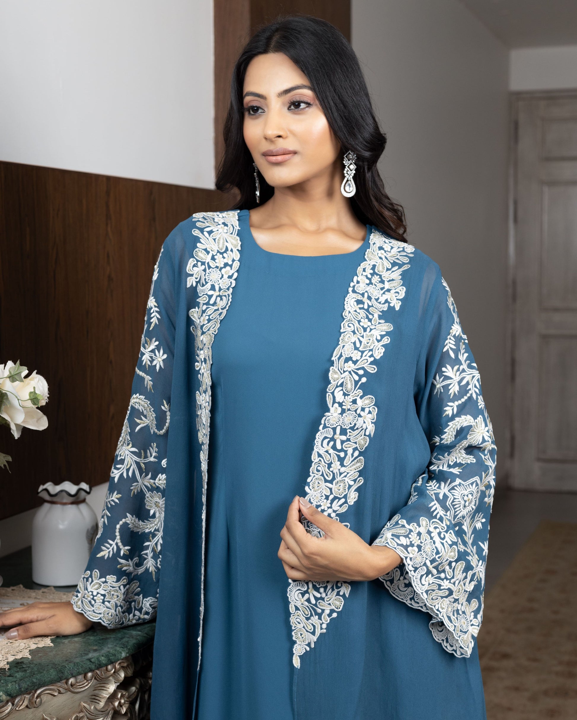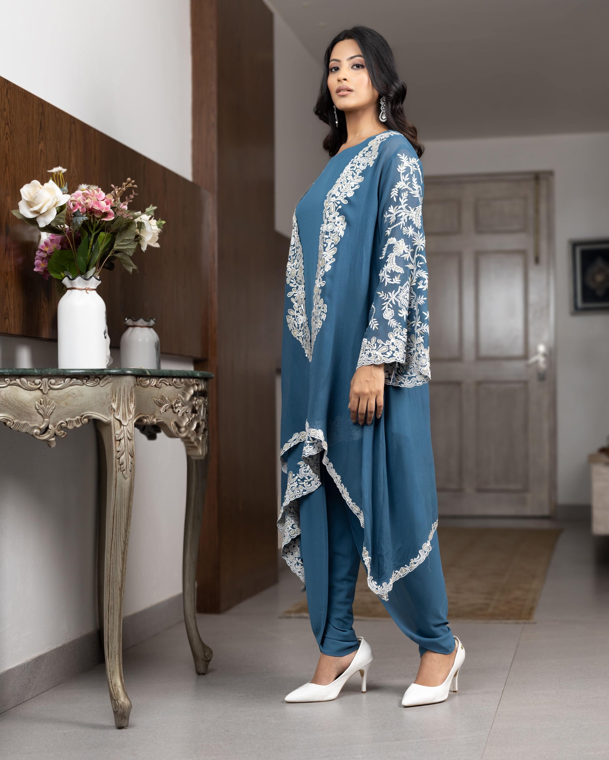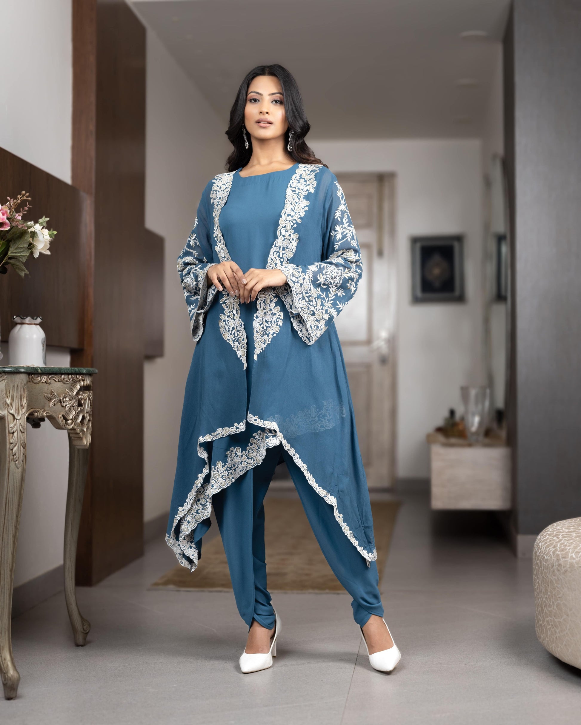 Asymmetrical jacket with thread and zari embroidery paired with an embroidered inner and dhoti.