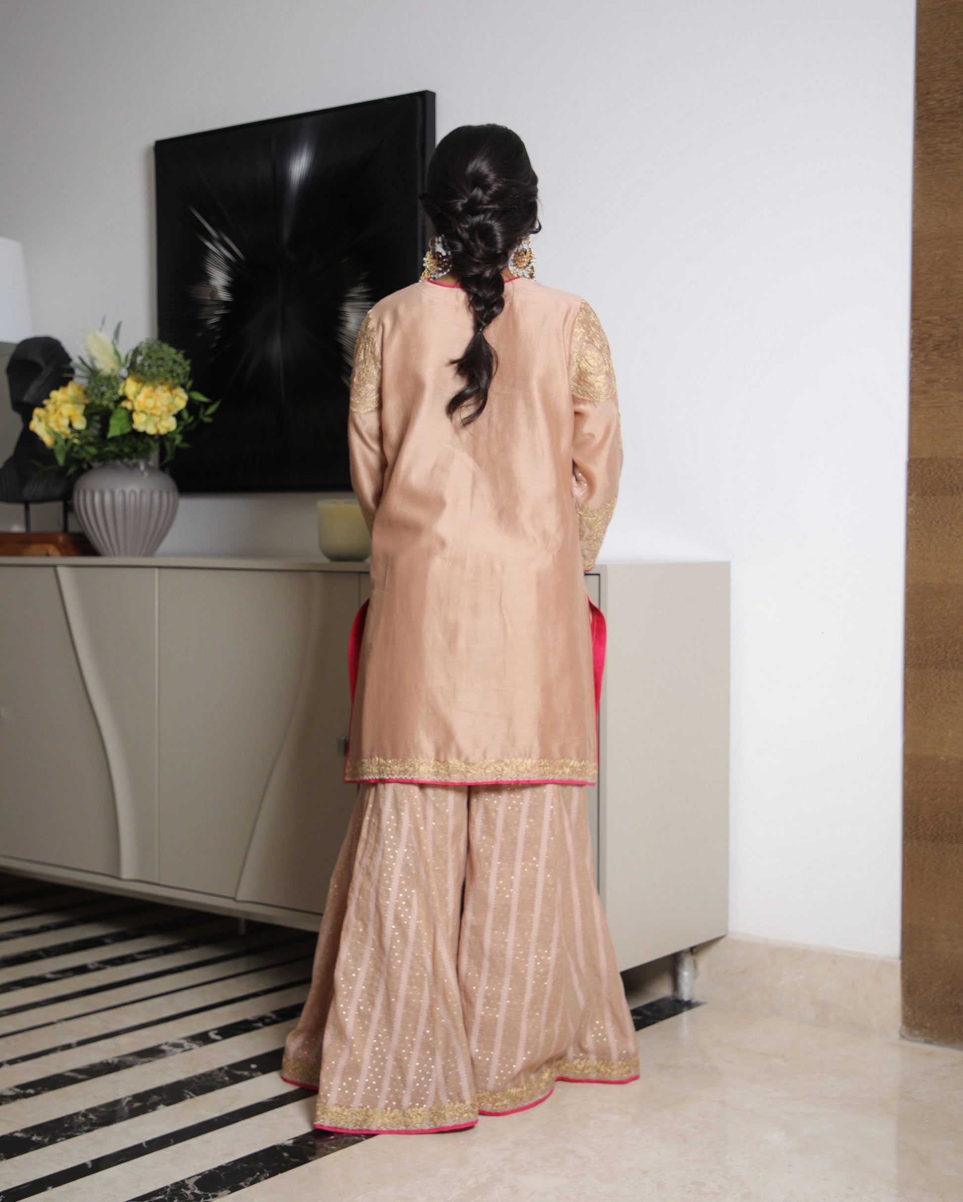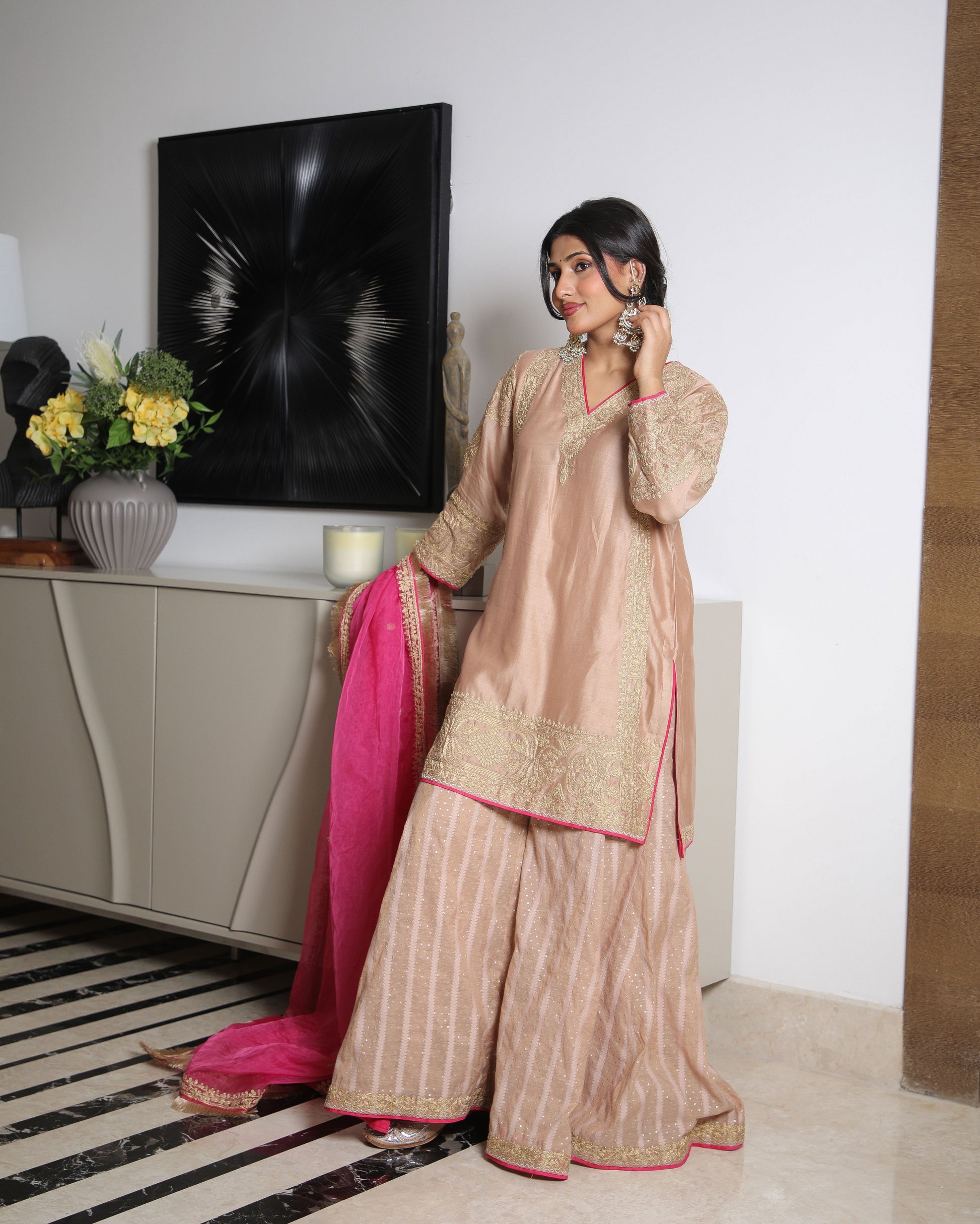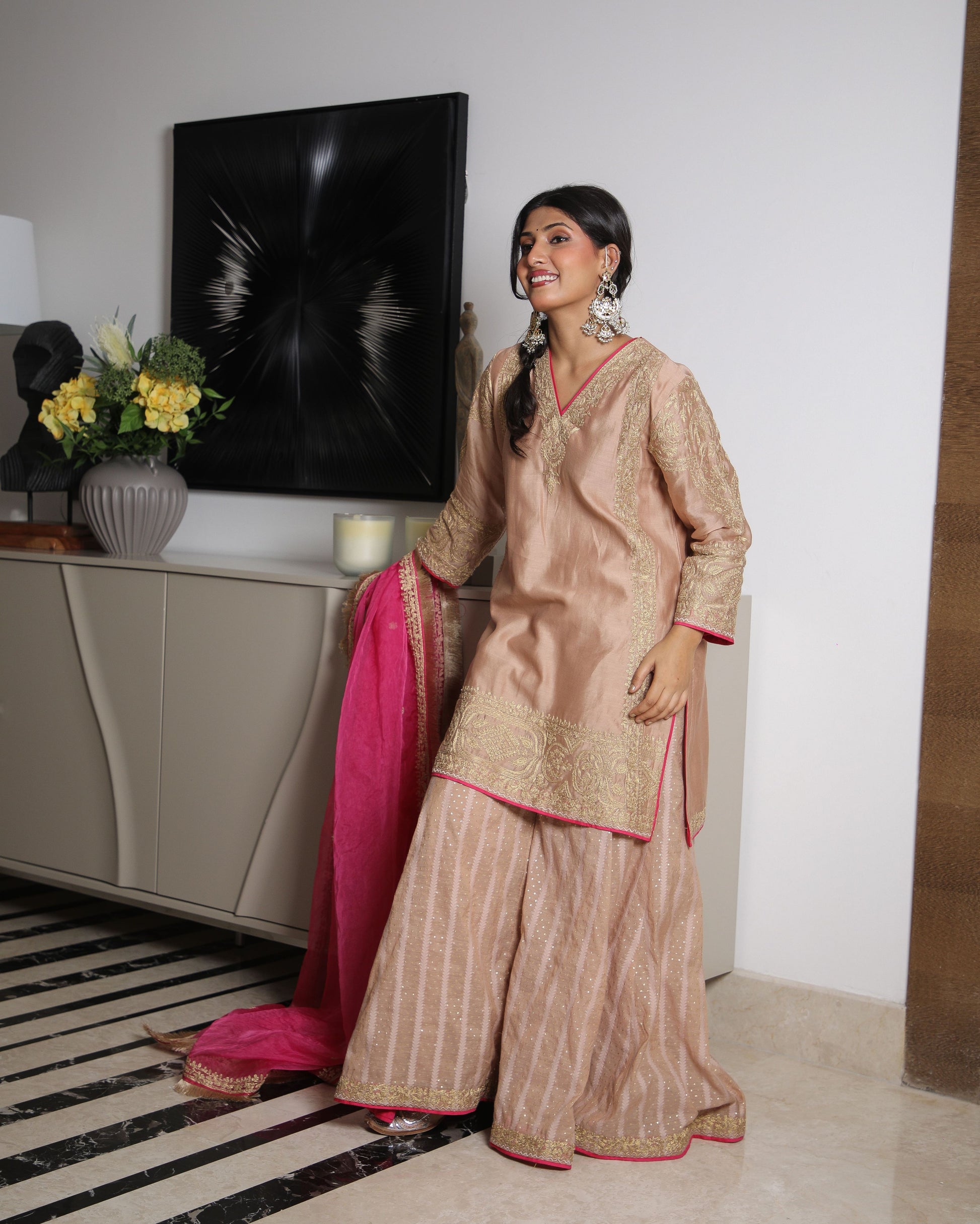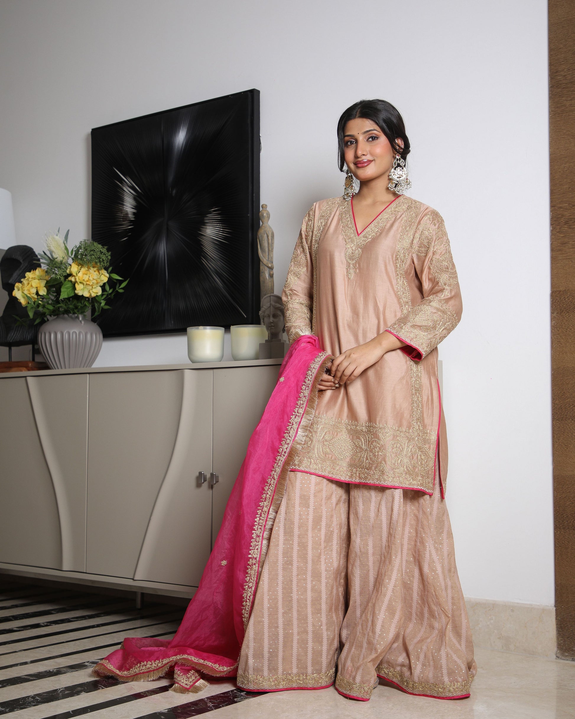 Banarasi Chanderi sharara set with a finely dori-embroidered kurta, styled with a contrasting dupatta — festive elegance redefined.