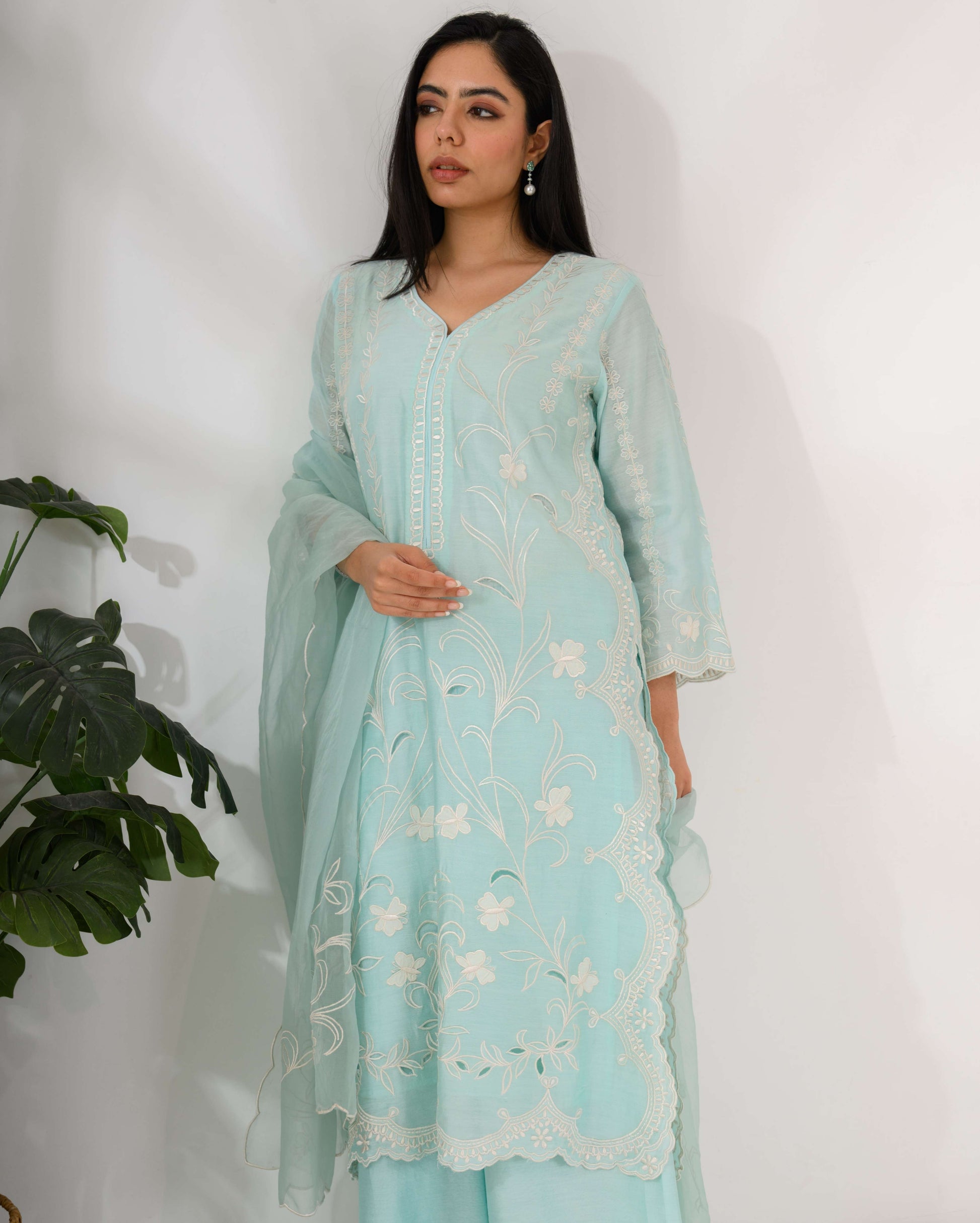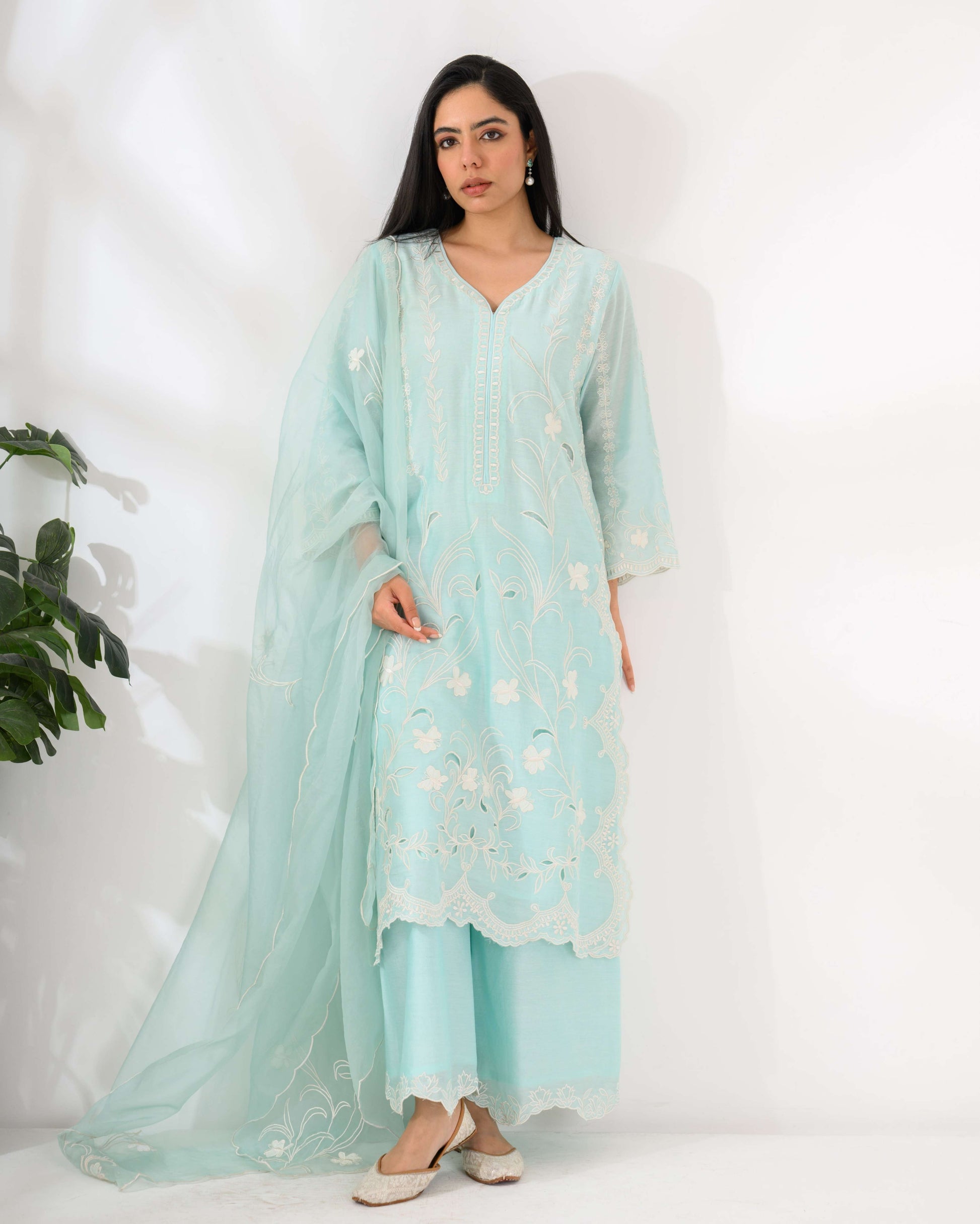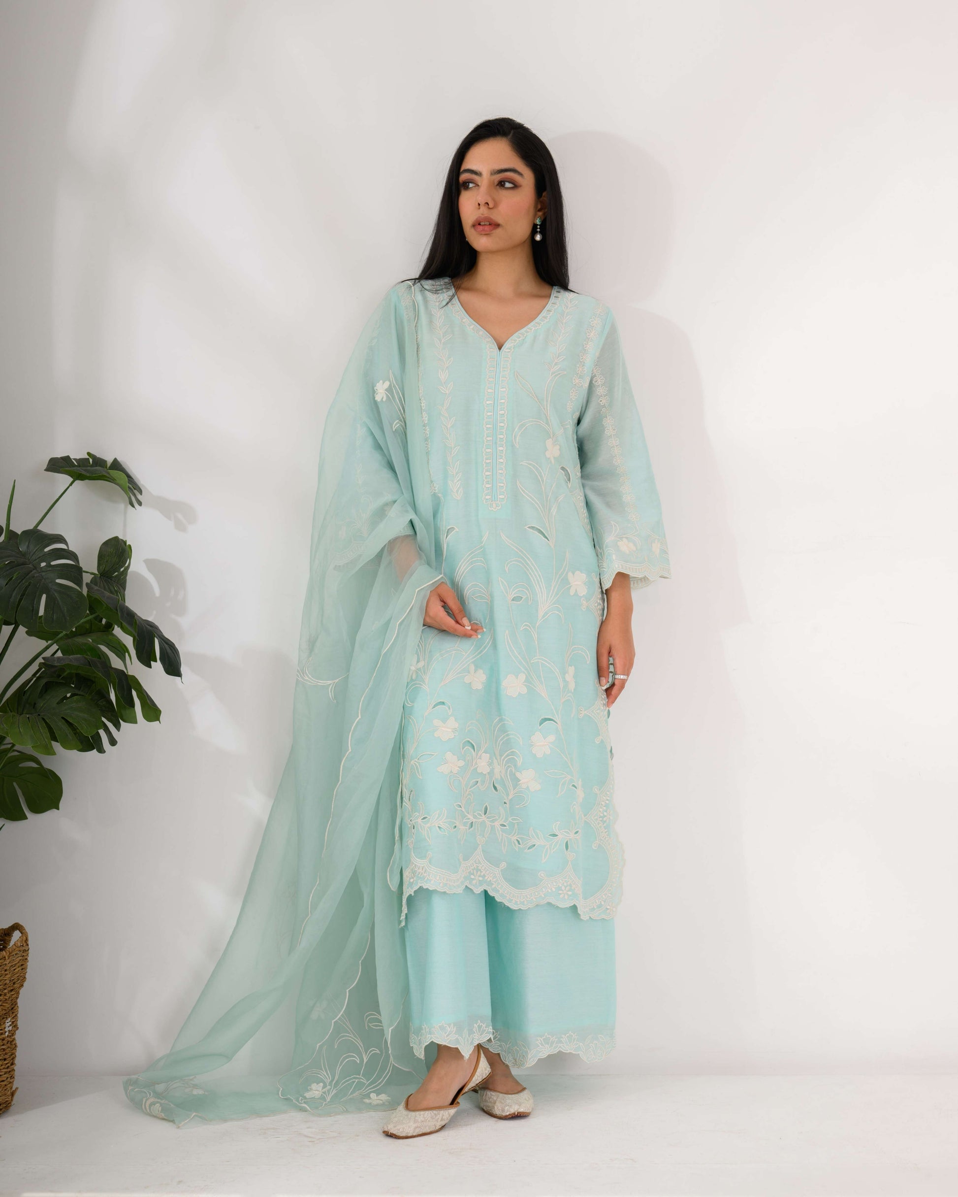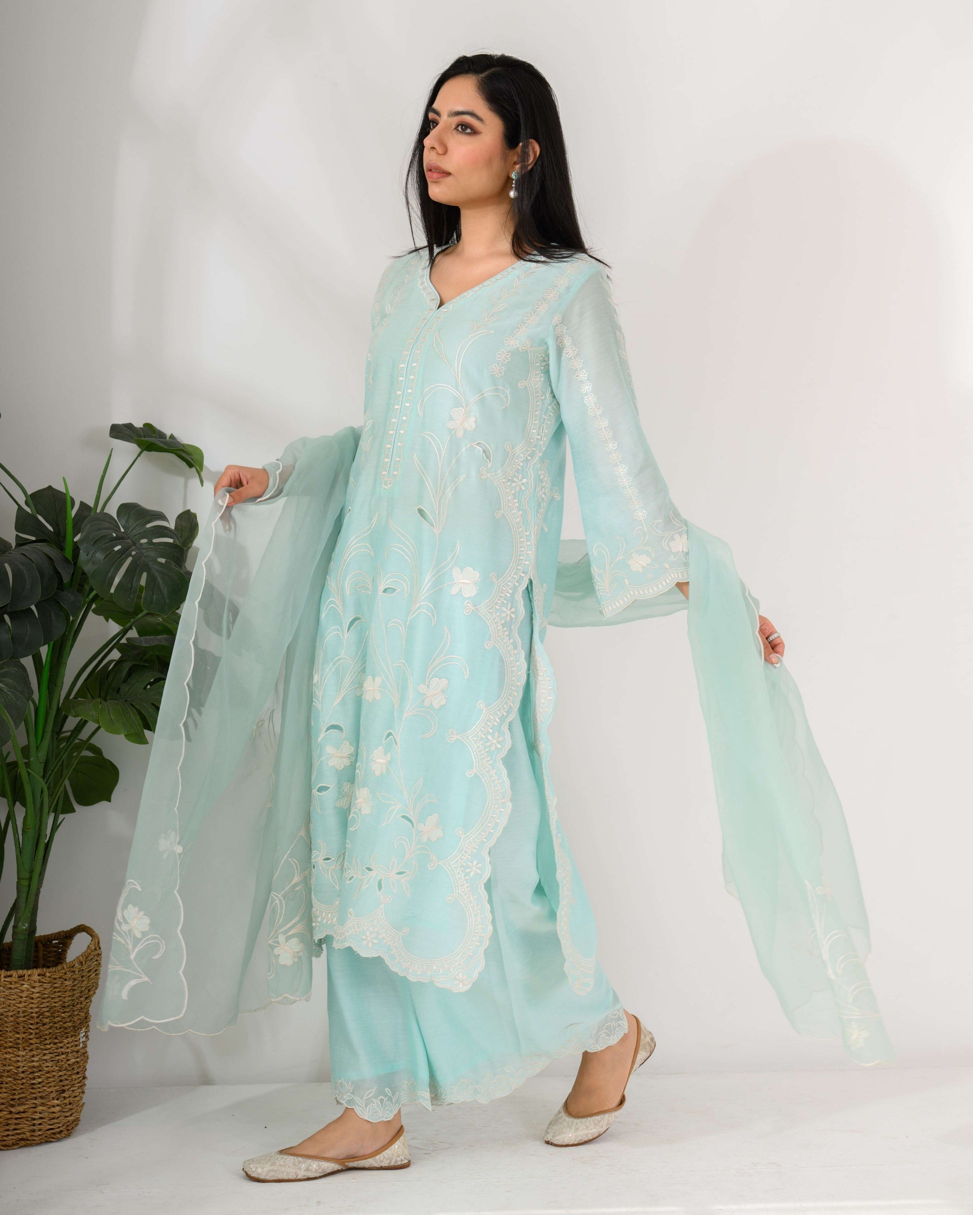 Chanderi Silk Kurta Set – Pure Chanderi silk kurta featuring fine thread and cutwork floral embroidery, paired with an organza dupatta.