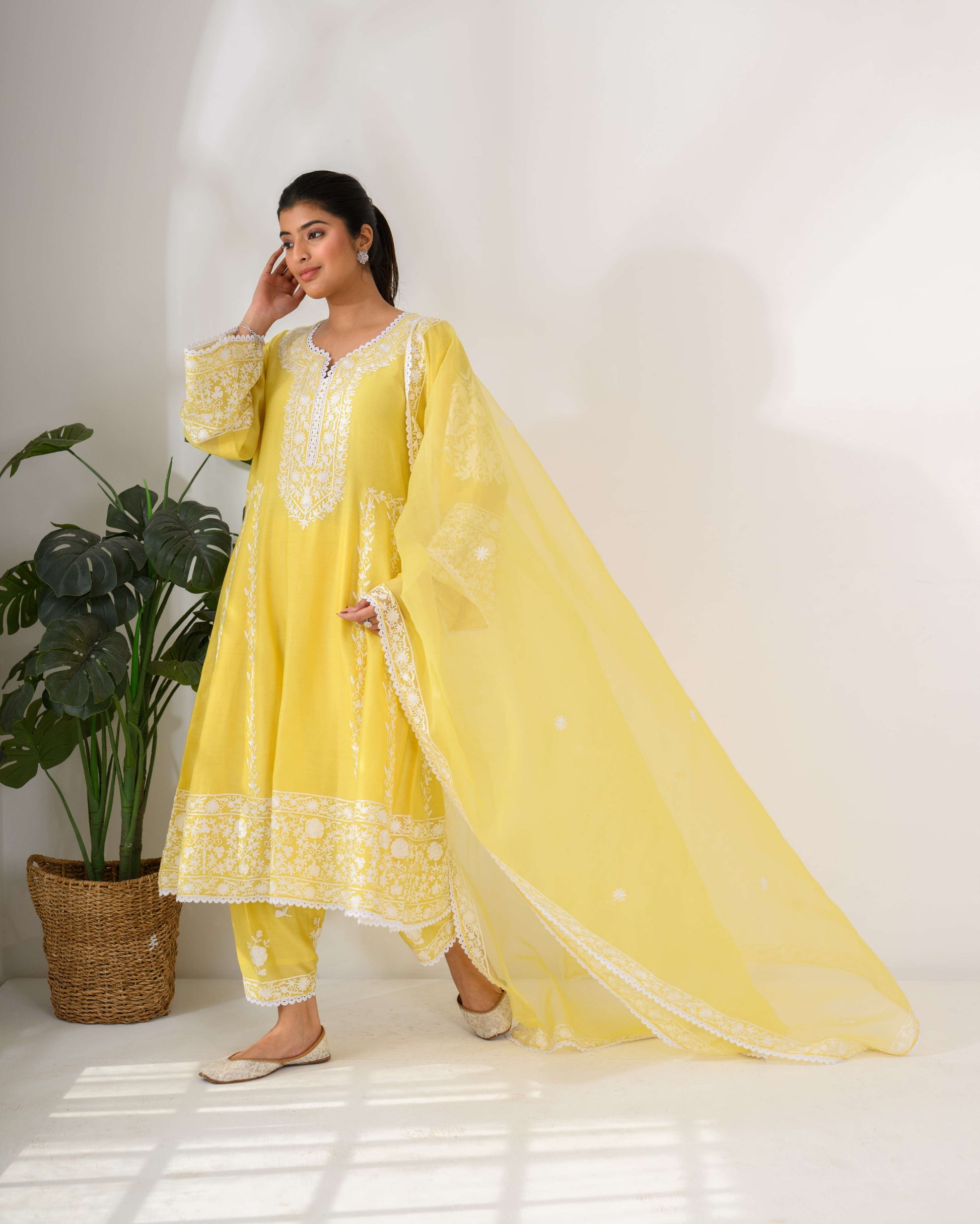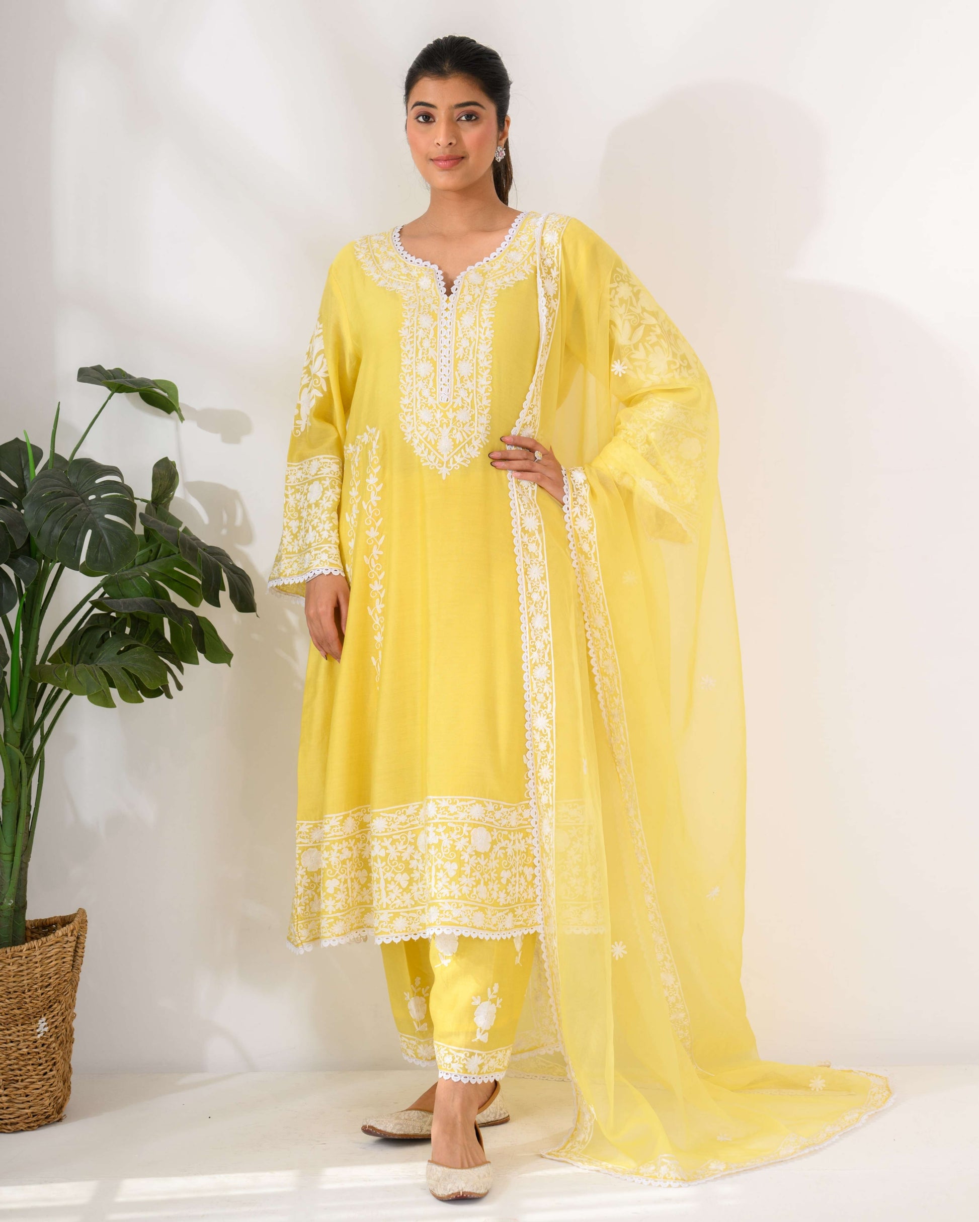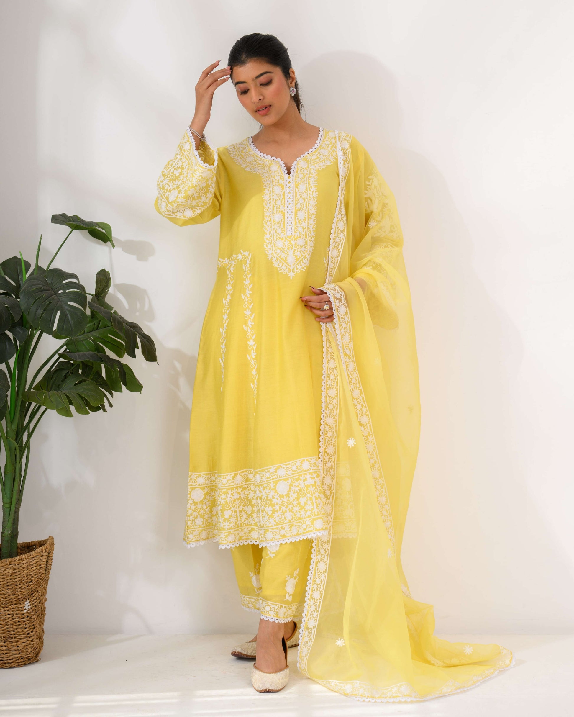 Chanderi Silk Kurta Set – Pure Chanderi silk kurta with fine Kashmiri Aari embroidery, paired with Pakistani salwar and an embroidered organza dupatta.