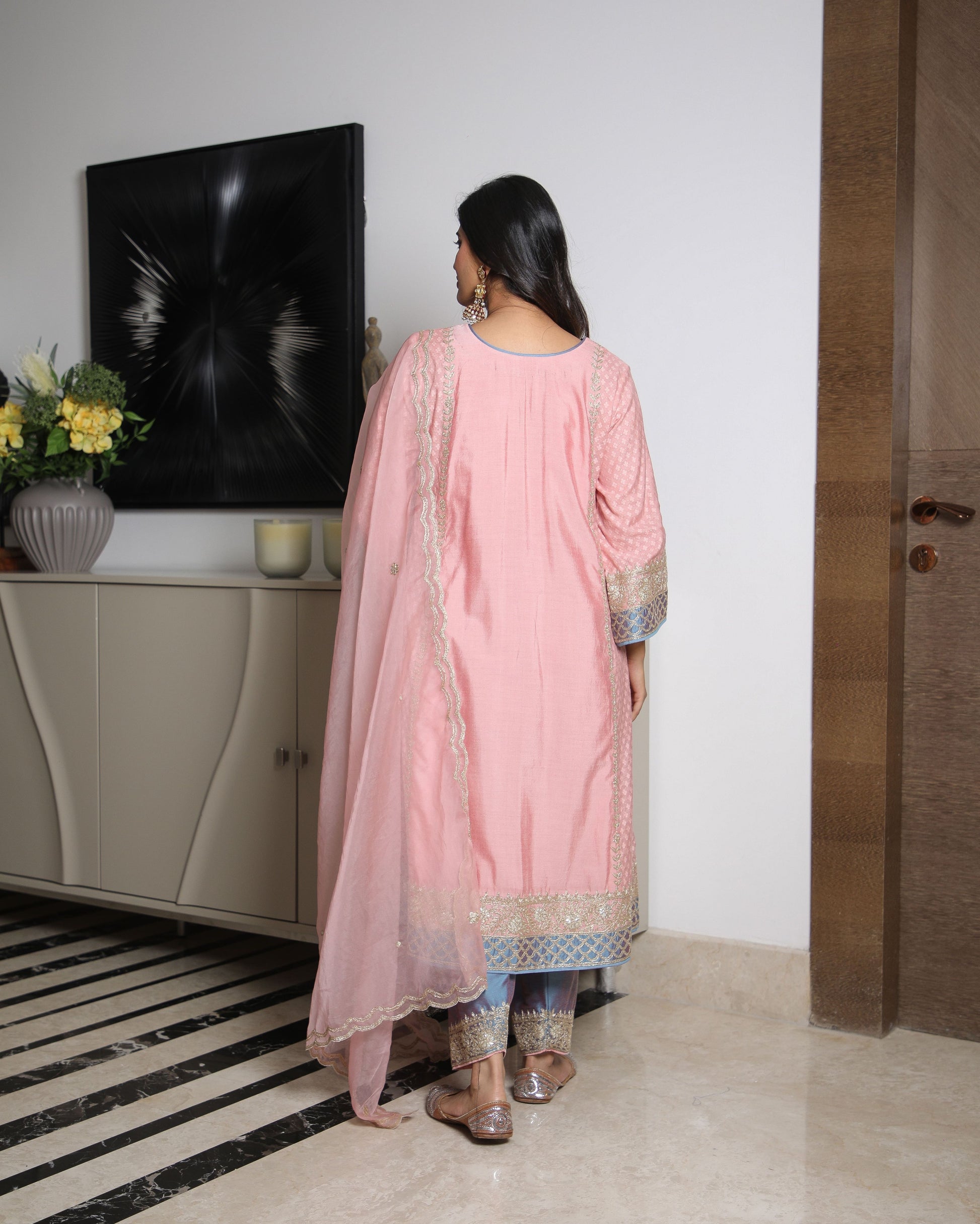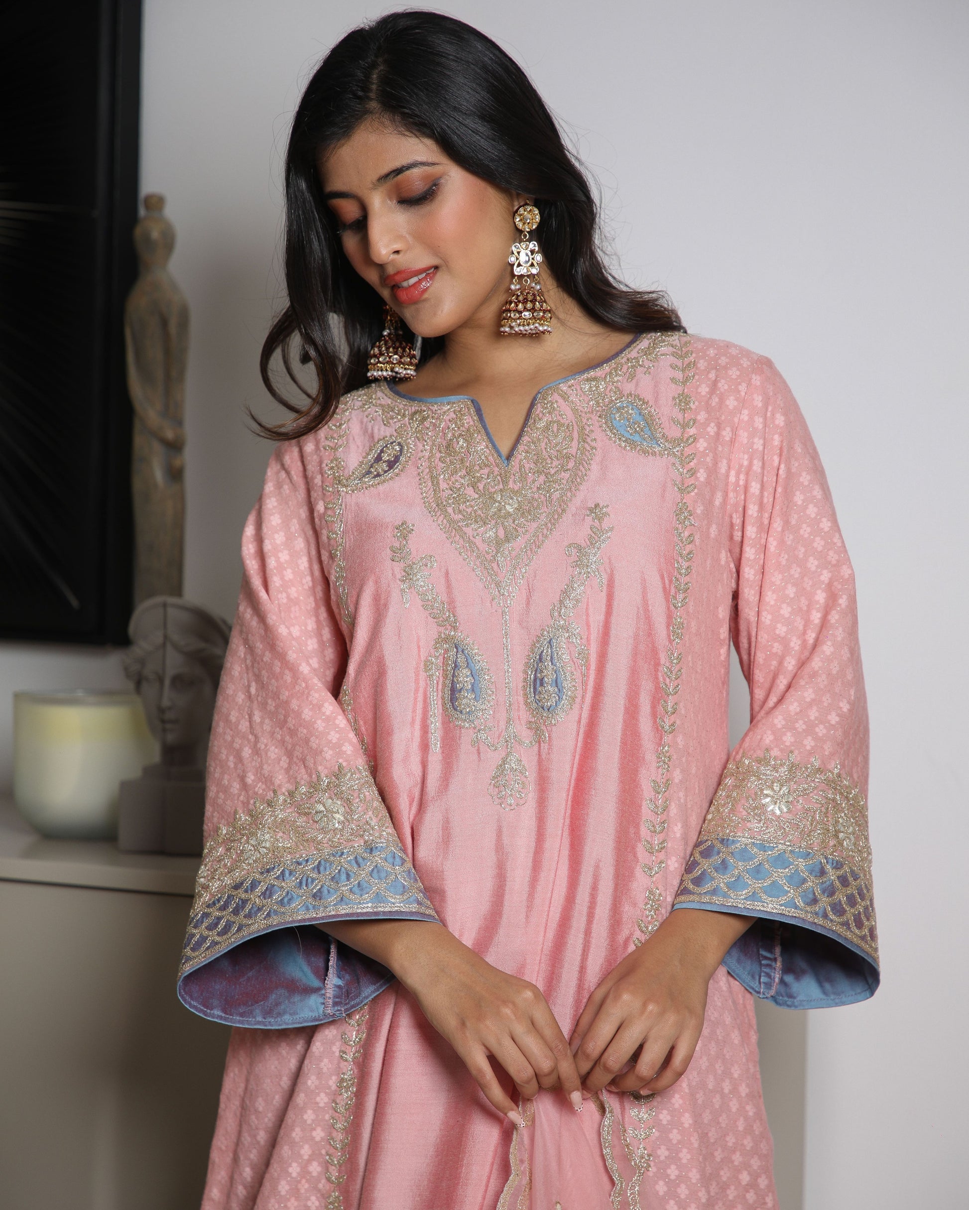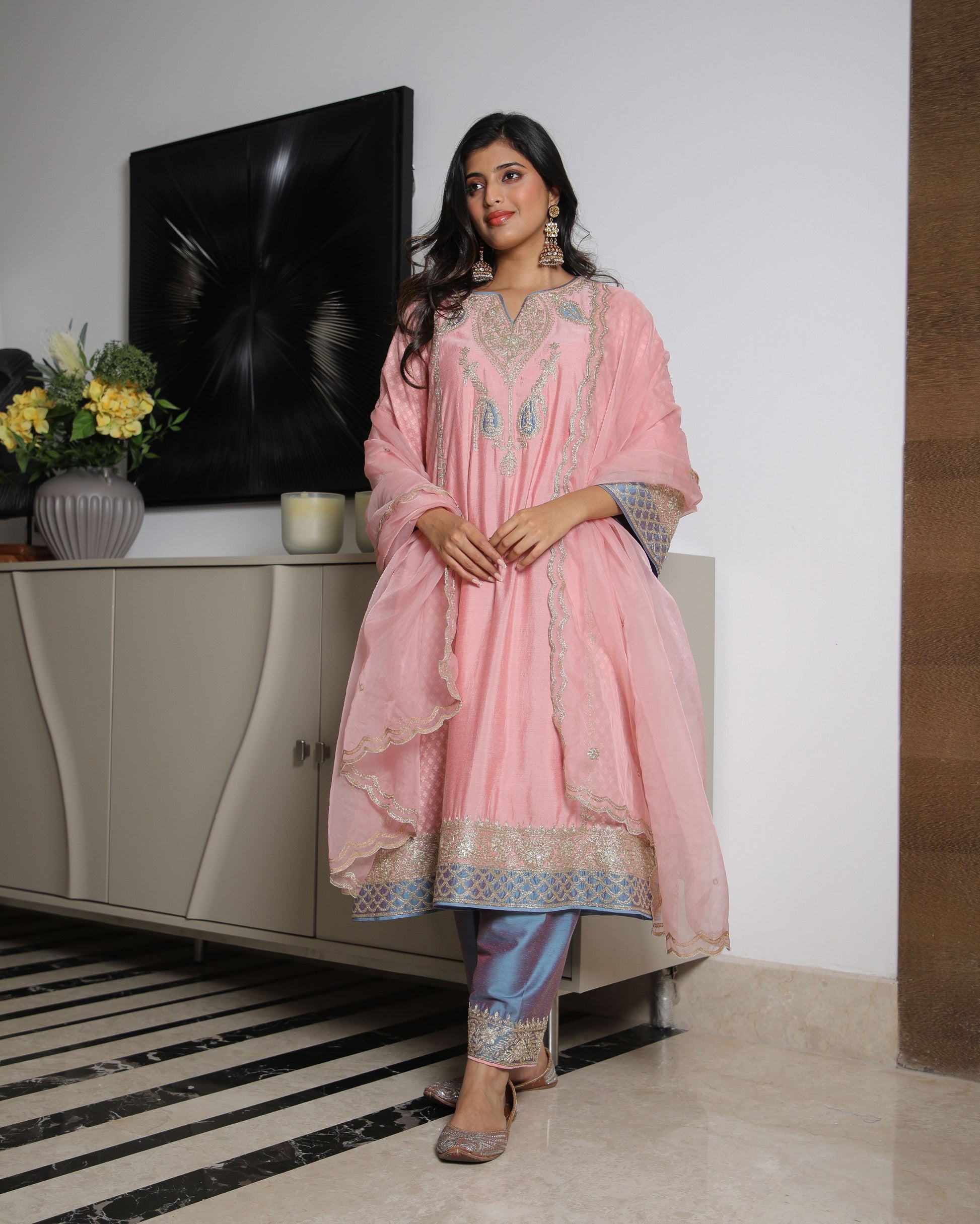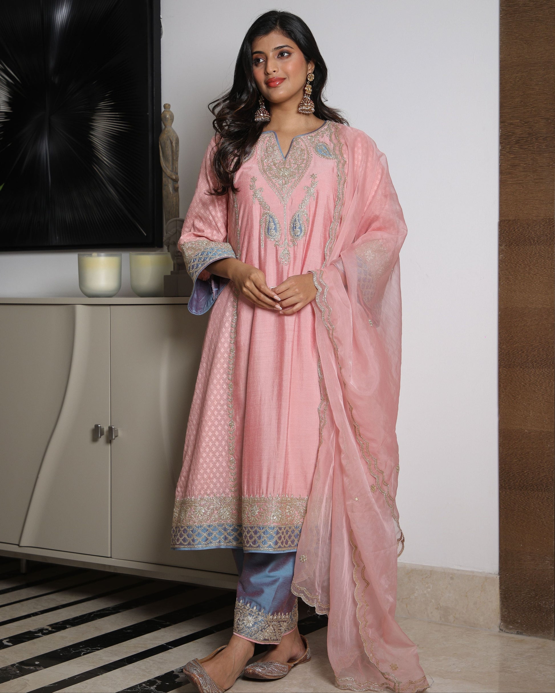 Pure Chanderi tissue kurta set with delicate dori and gota patti embroidery, paired with a pure tissue dupatta and palazzos — timeless festive elegance.