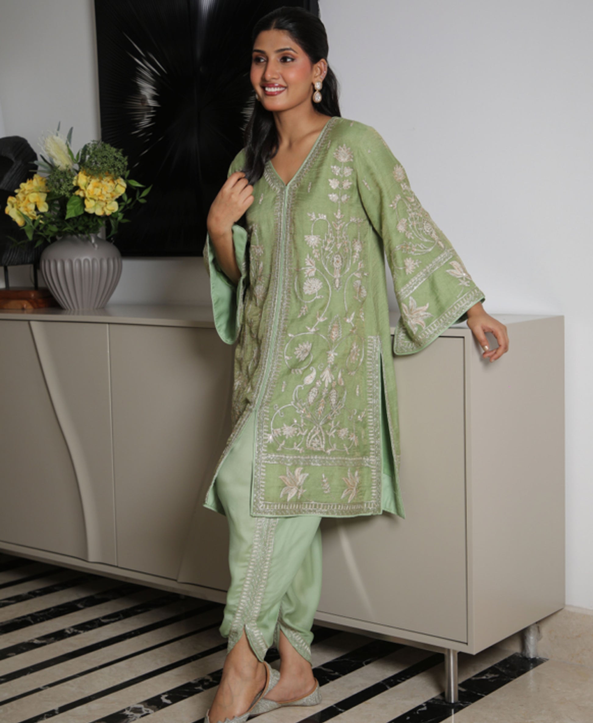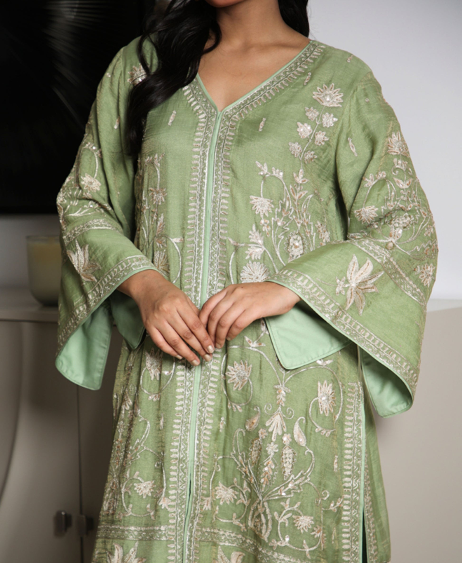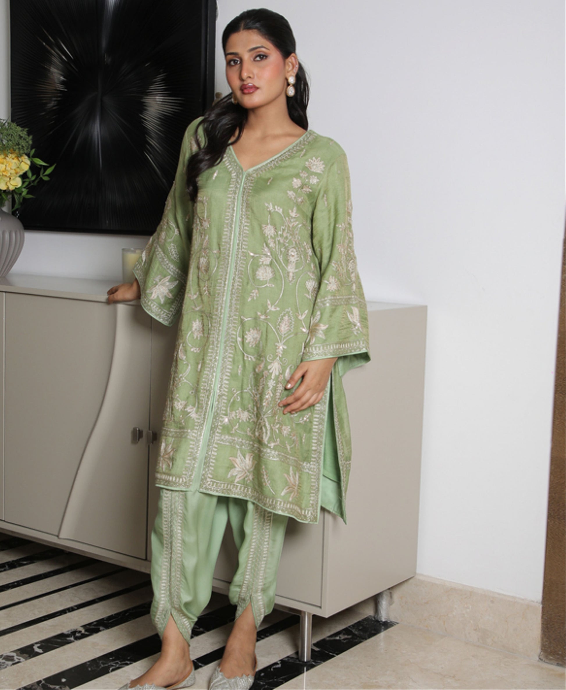 Pure Chanderi tissue kurta set with fine hand and thread embroidery, paired with an embroidered satin dhoti — a refined blend of tradition and modernity