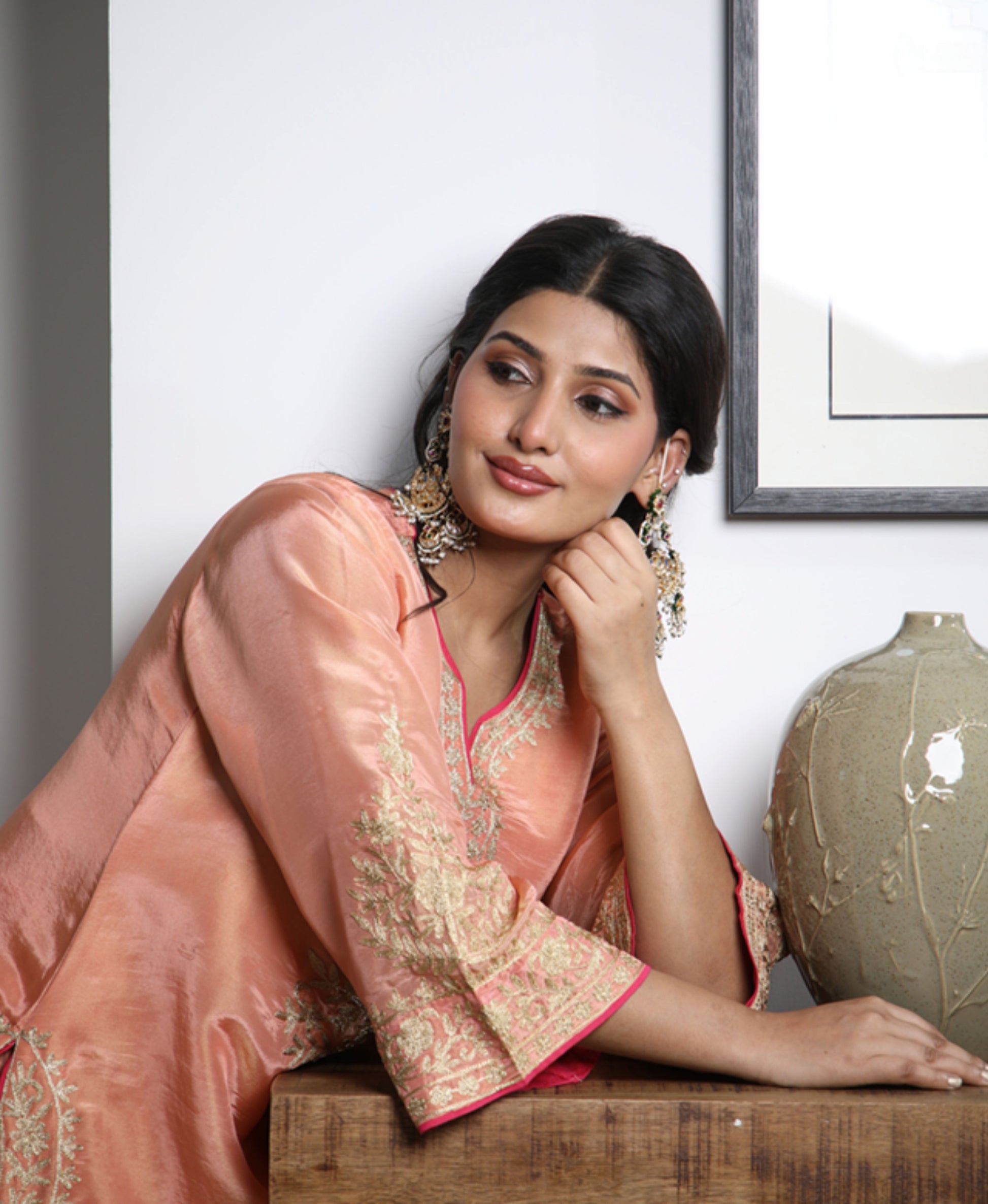 Crinkled tissue sharara adorned with fine dori embroidery — a perfect blend of texture and tradition.