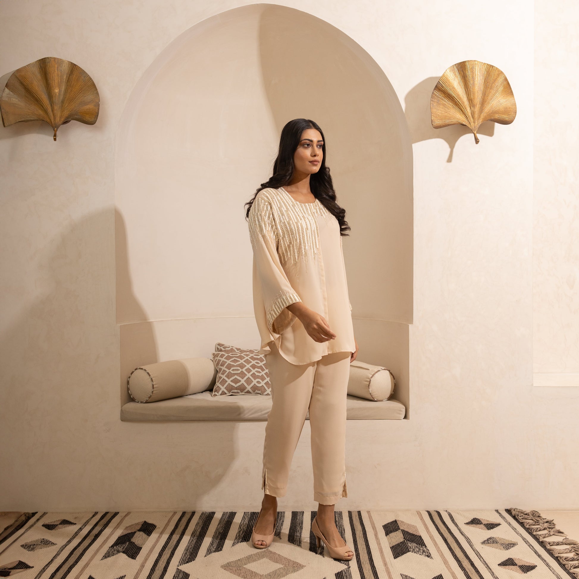 Delicately hand-embroidered georgette set, customizable in various colors.