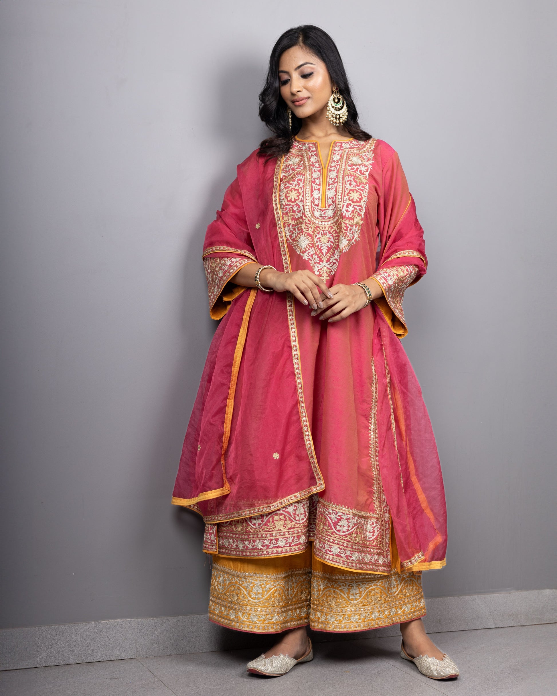 Introducing our double toned aari embroidered kurtas with embroidered farshis adorned with embroidered organza dupatta. Can be customised in other colours too.