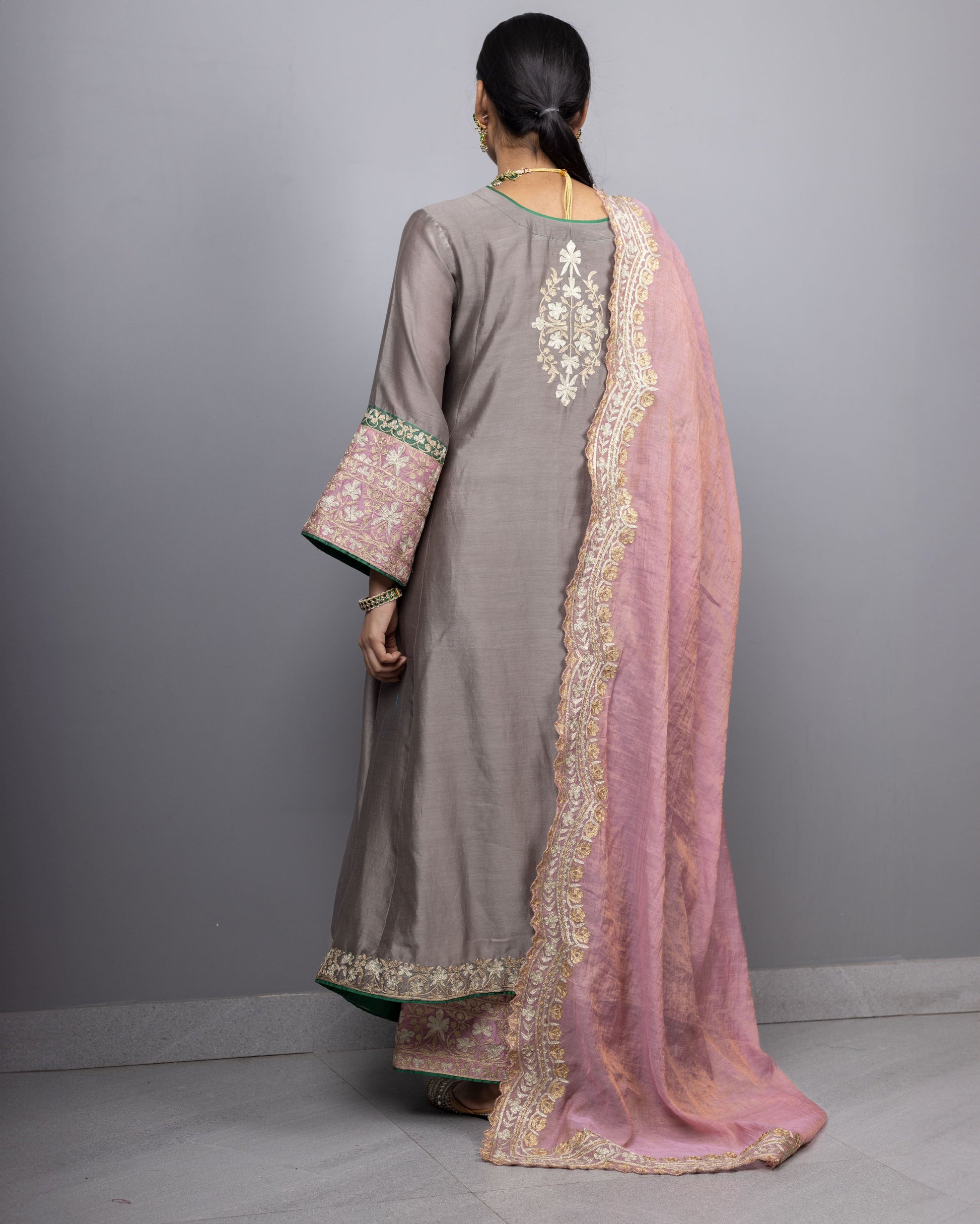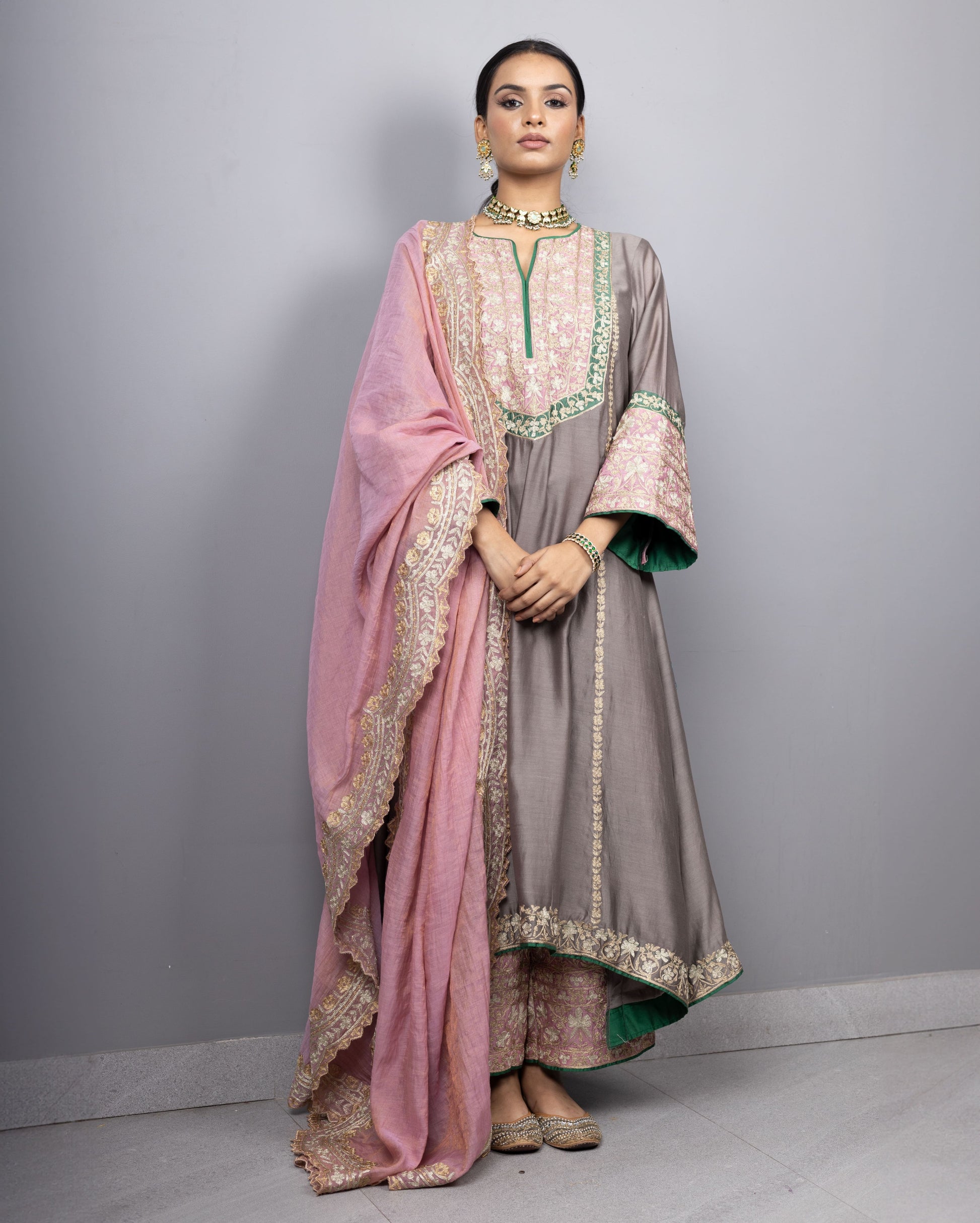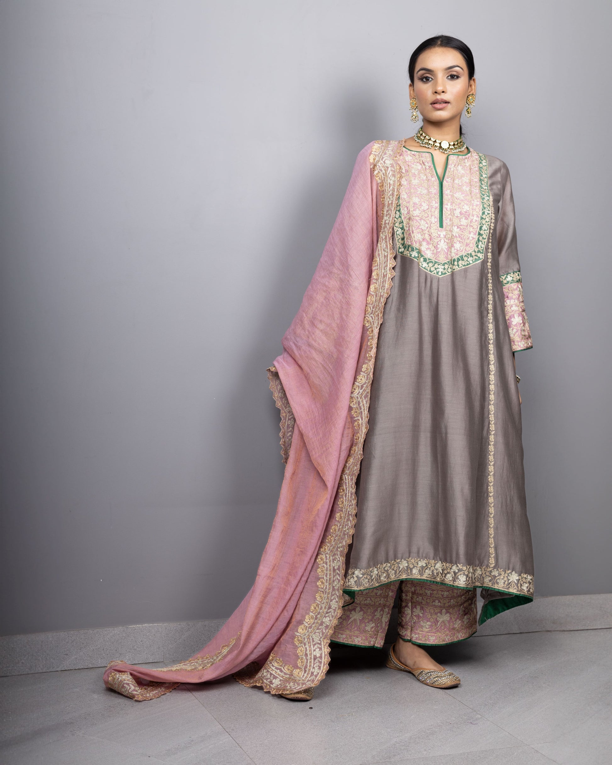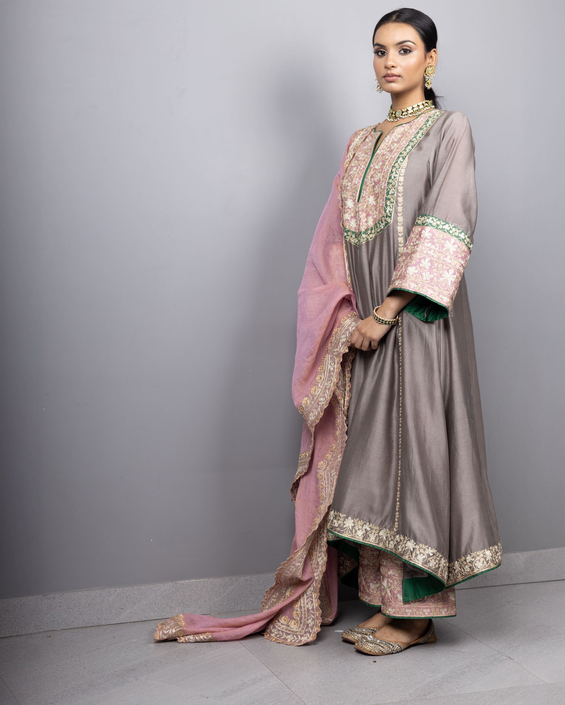 Double toned aari embroidered A-line kurta in pure chanderi silk paired with embroidered tissue chanderi dupatta Can be customised in other colours.