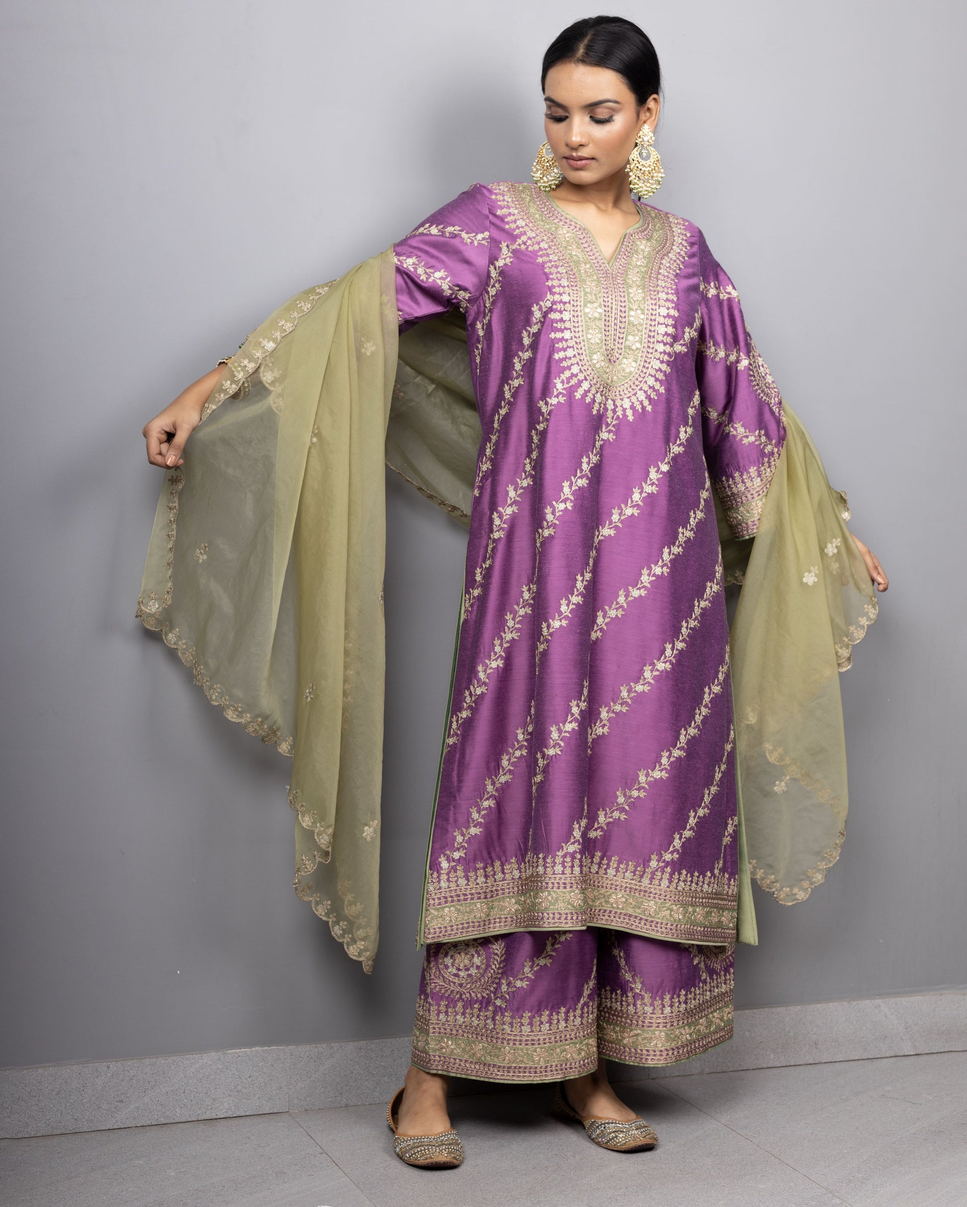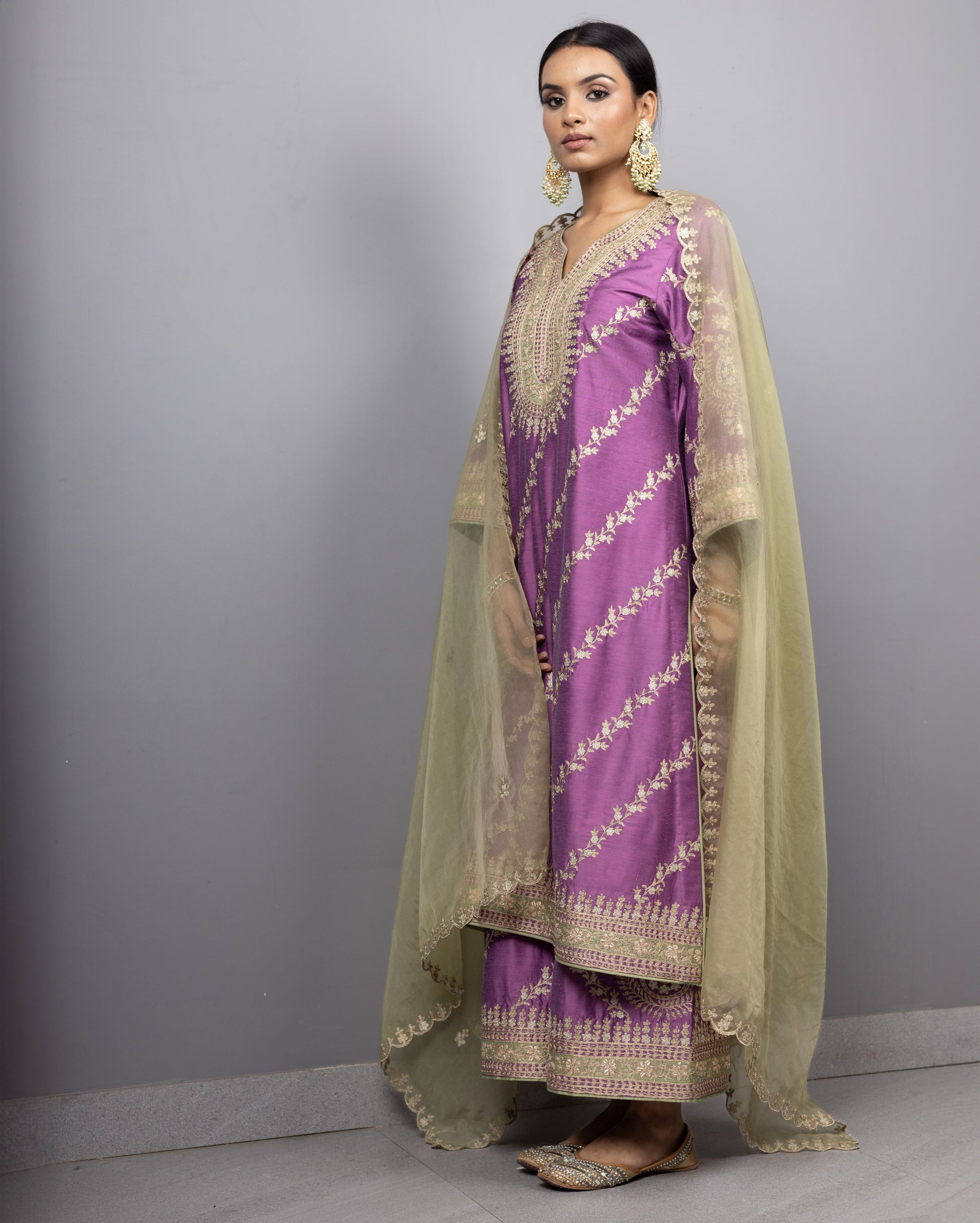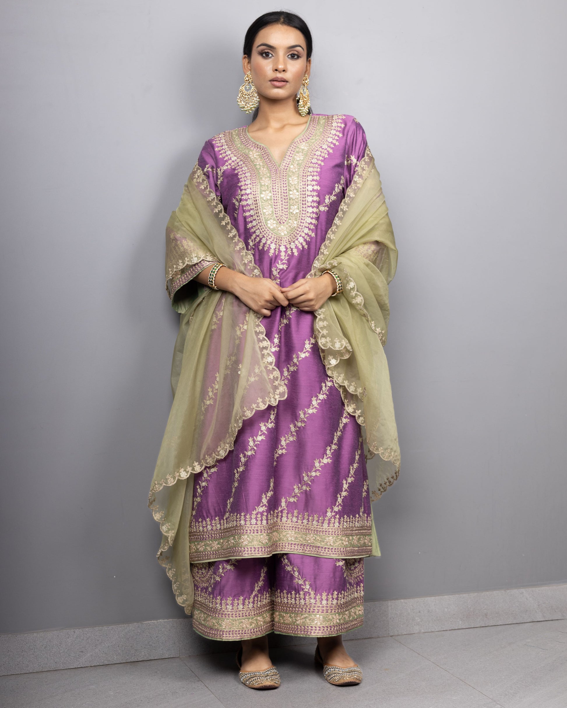 Gota pati and aari embroidered straight kurta paired with contrast embroided organza dupatta and embroidered farshi. Can be customised in more colours.