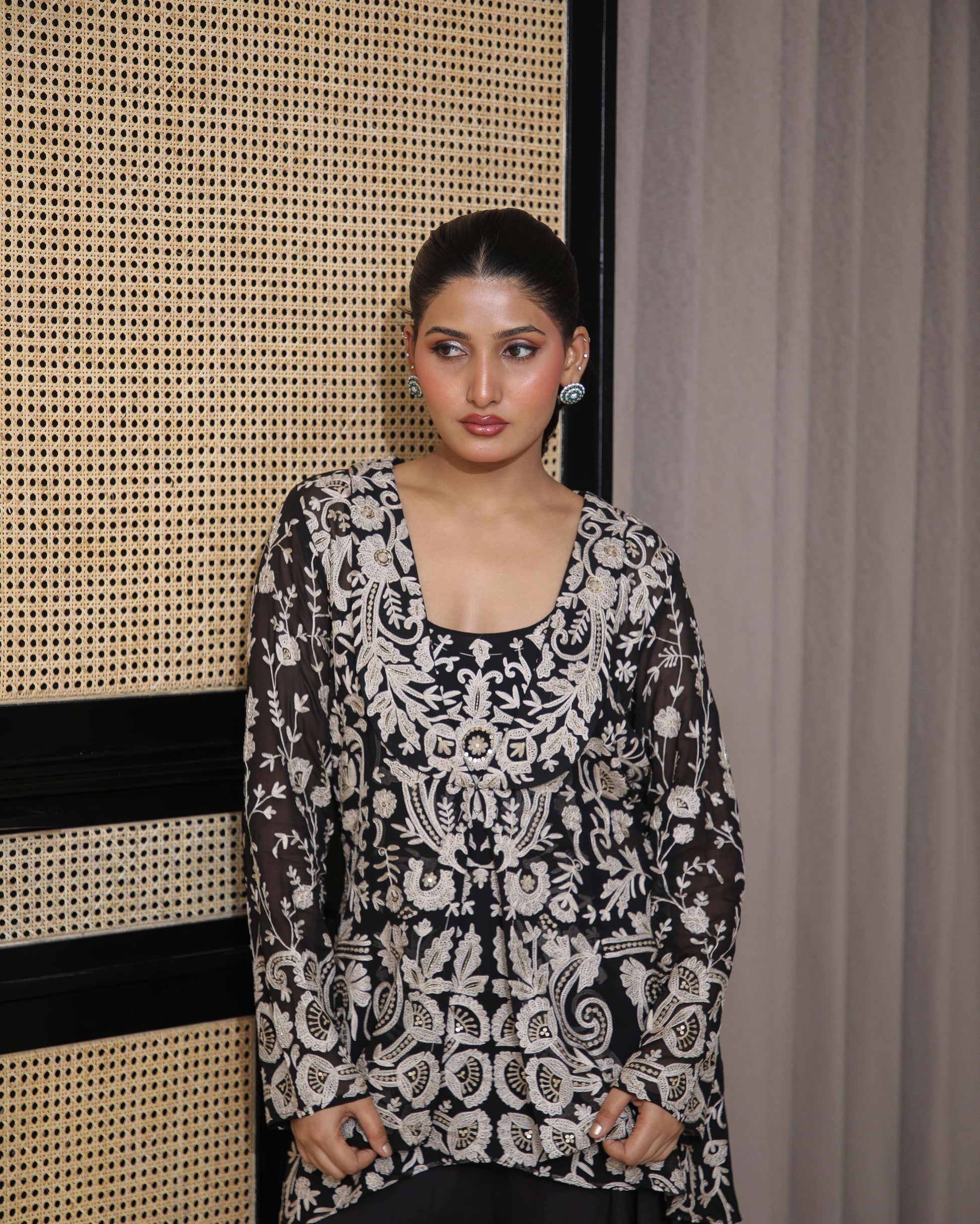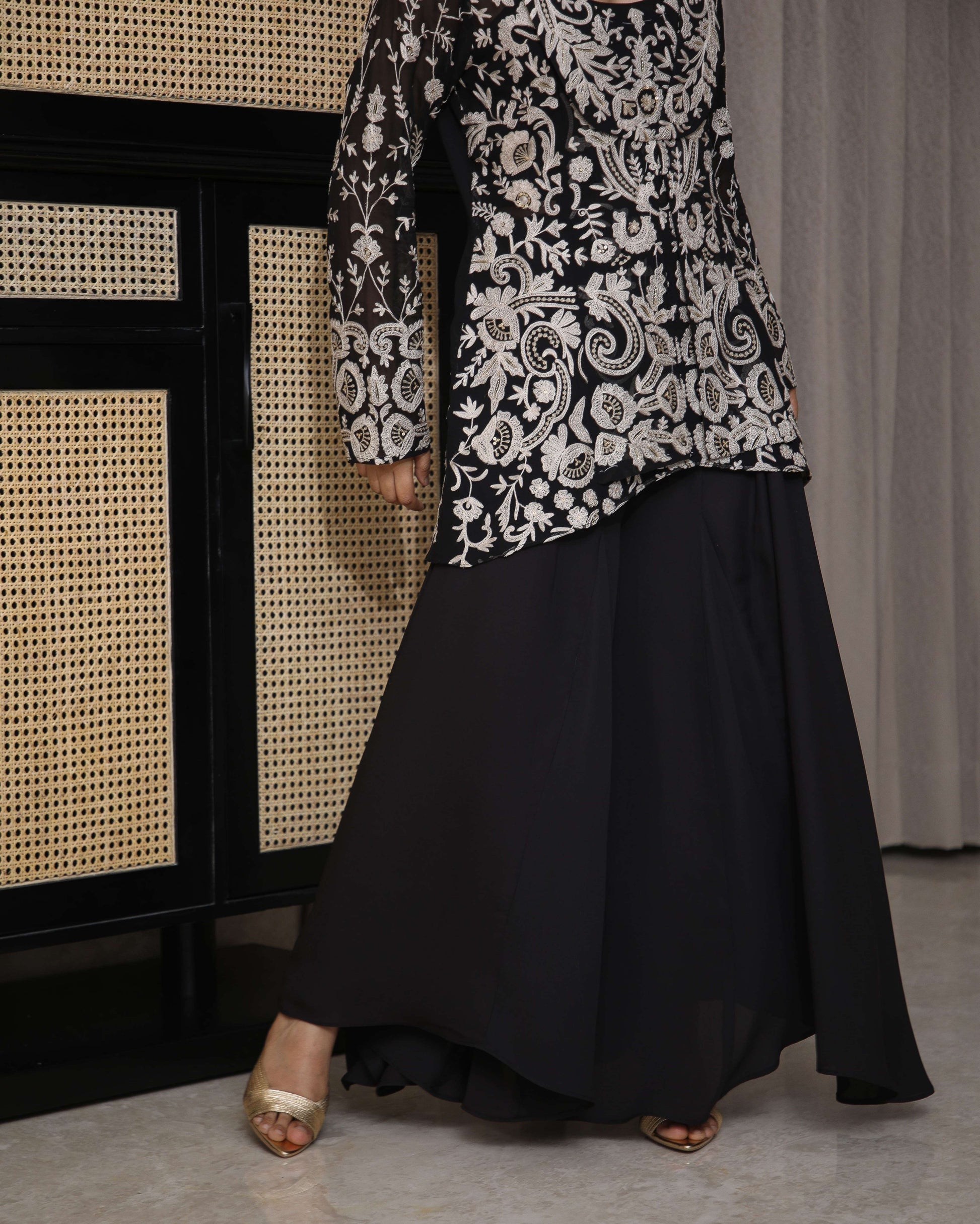 Finely hand-embroidered jacket with thread, zari, sequins, and cutdana, paired with a draped sharara set — festive glamour with refined detail.