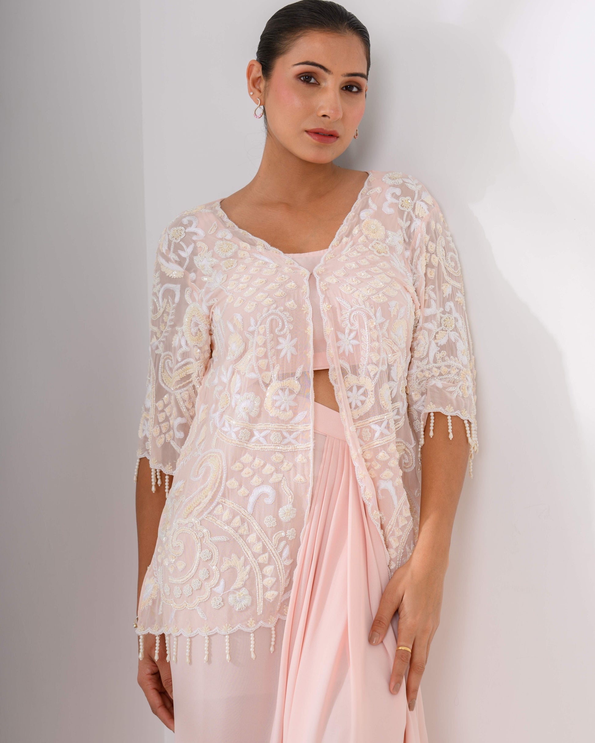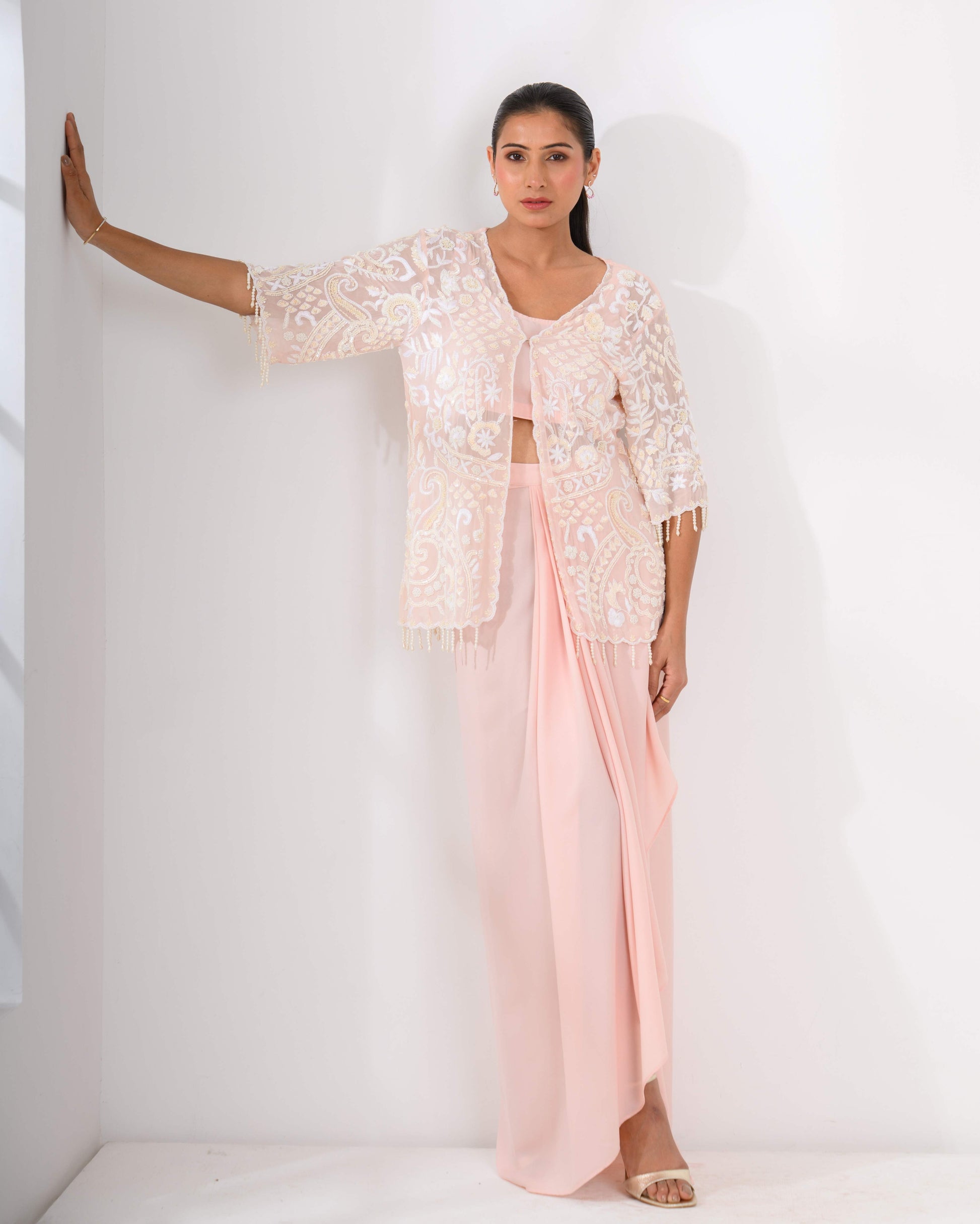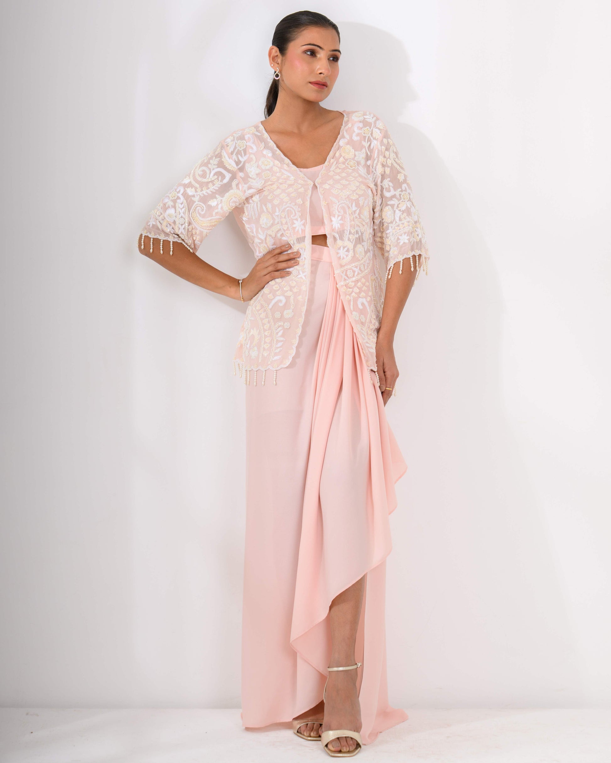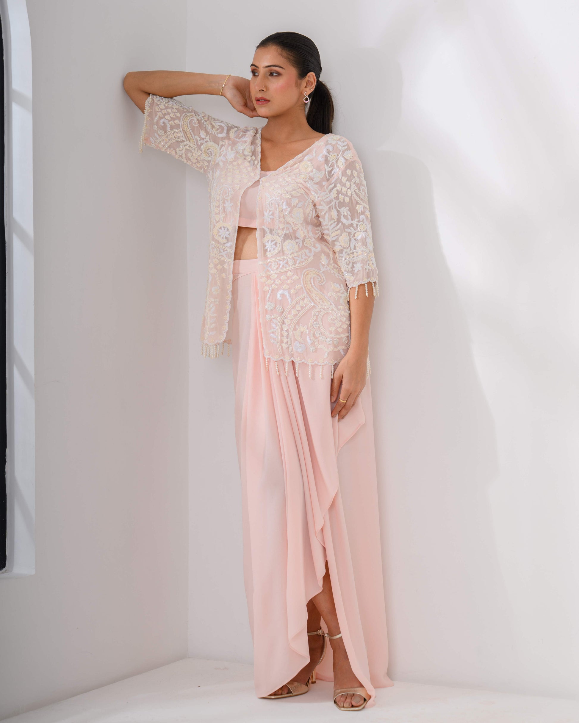 Elegant Jacket Drape Set – A hand-embroidered jacket top paired with a fluid drape skirt. Customizable in more colors.