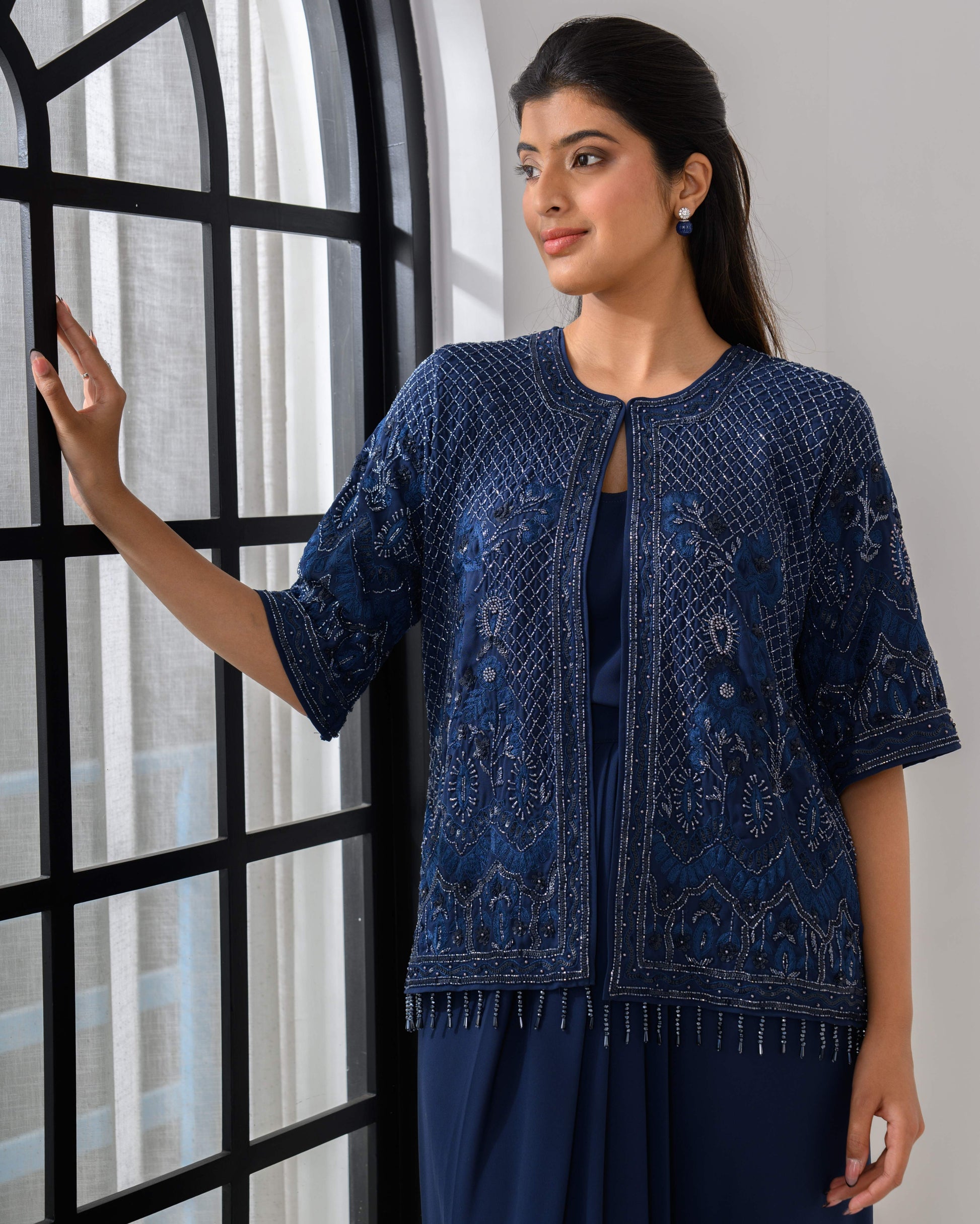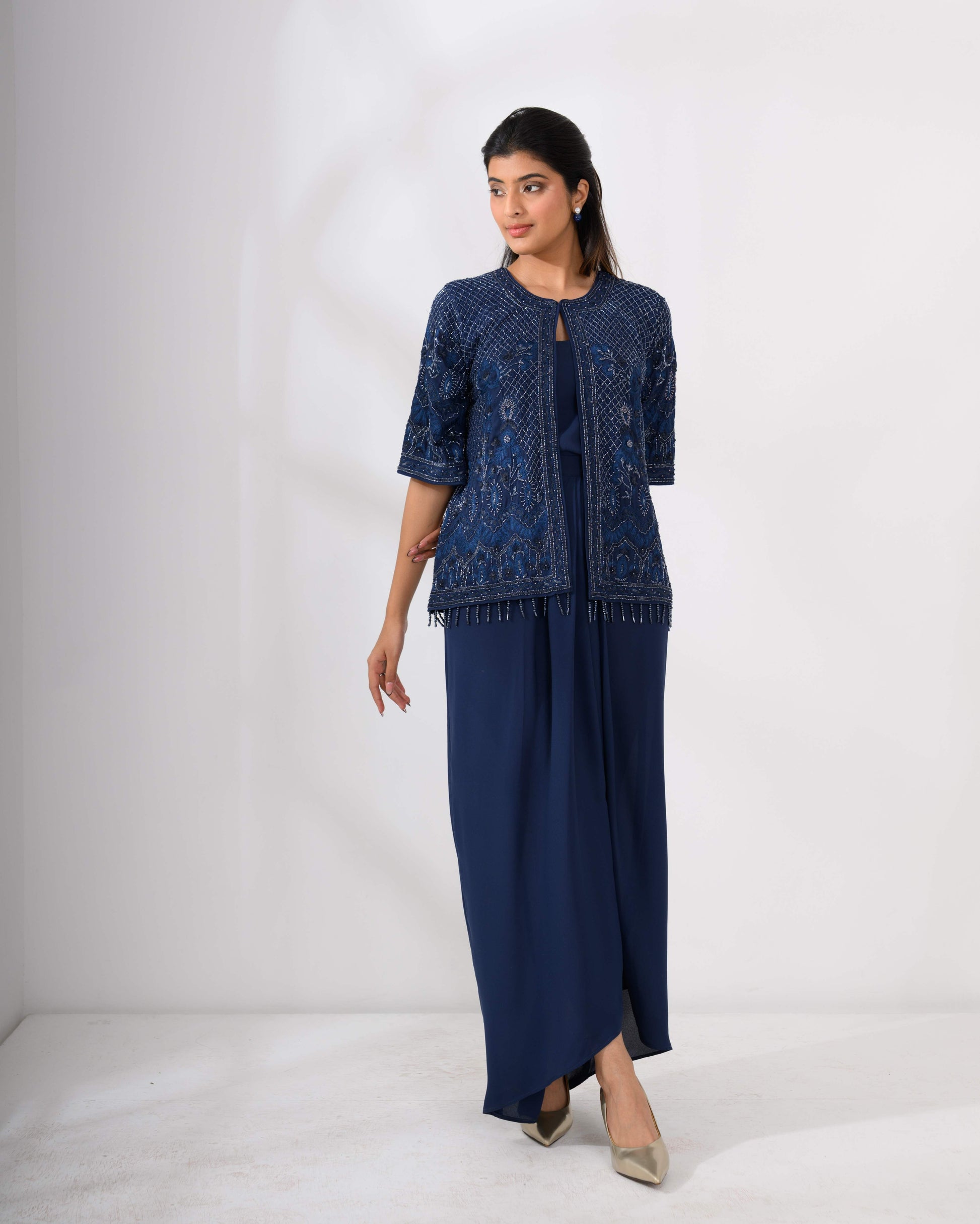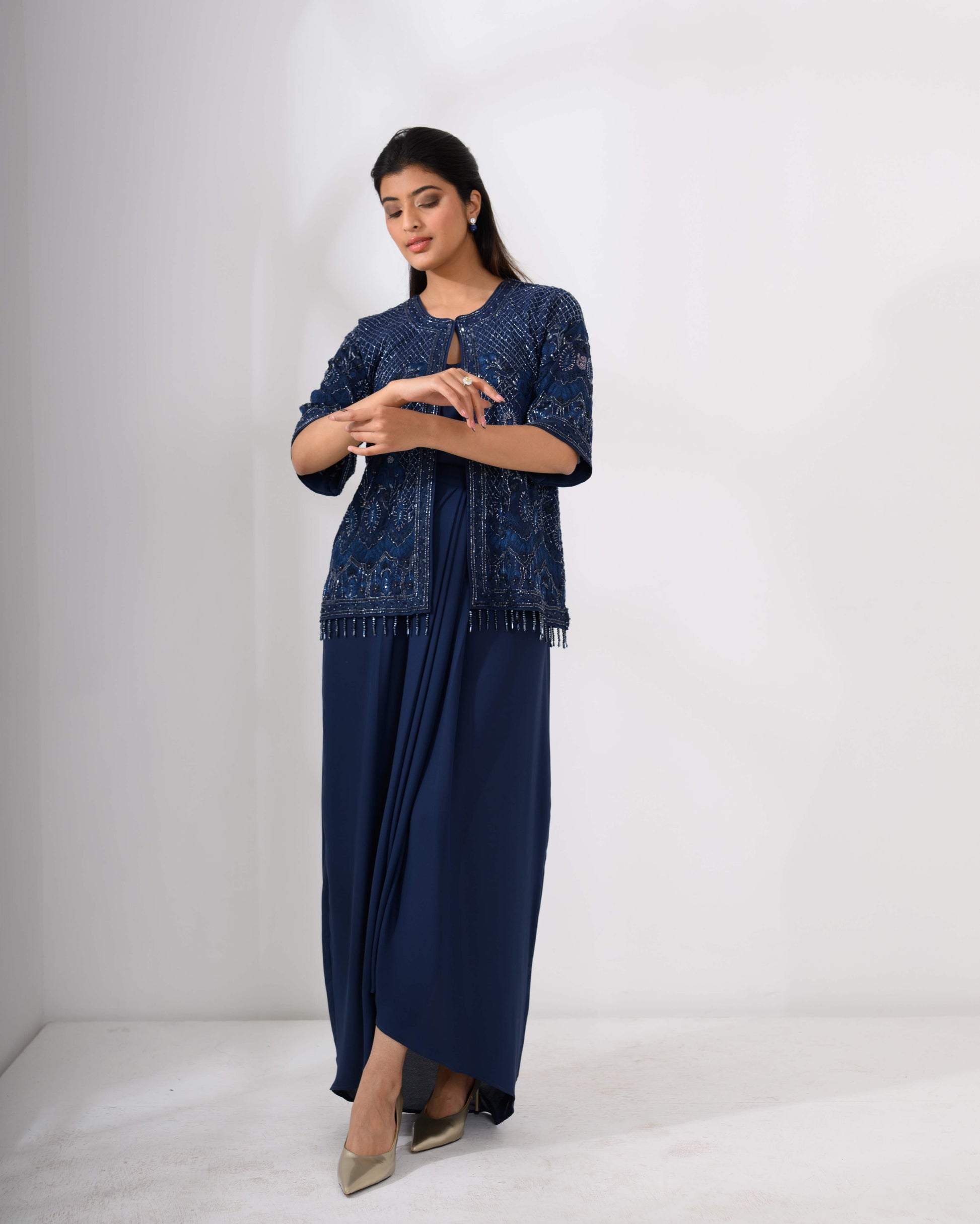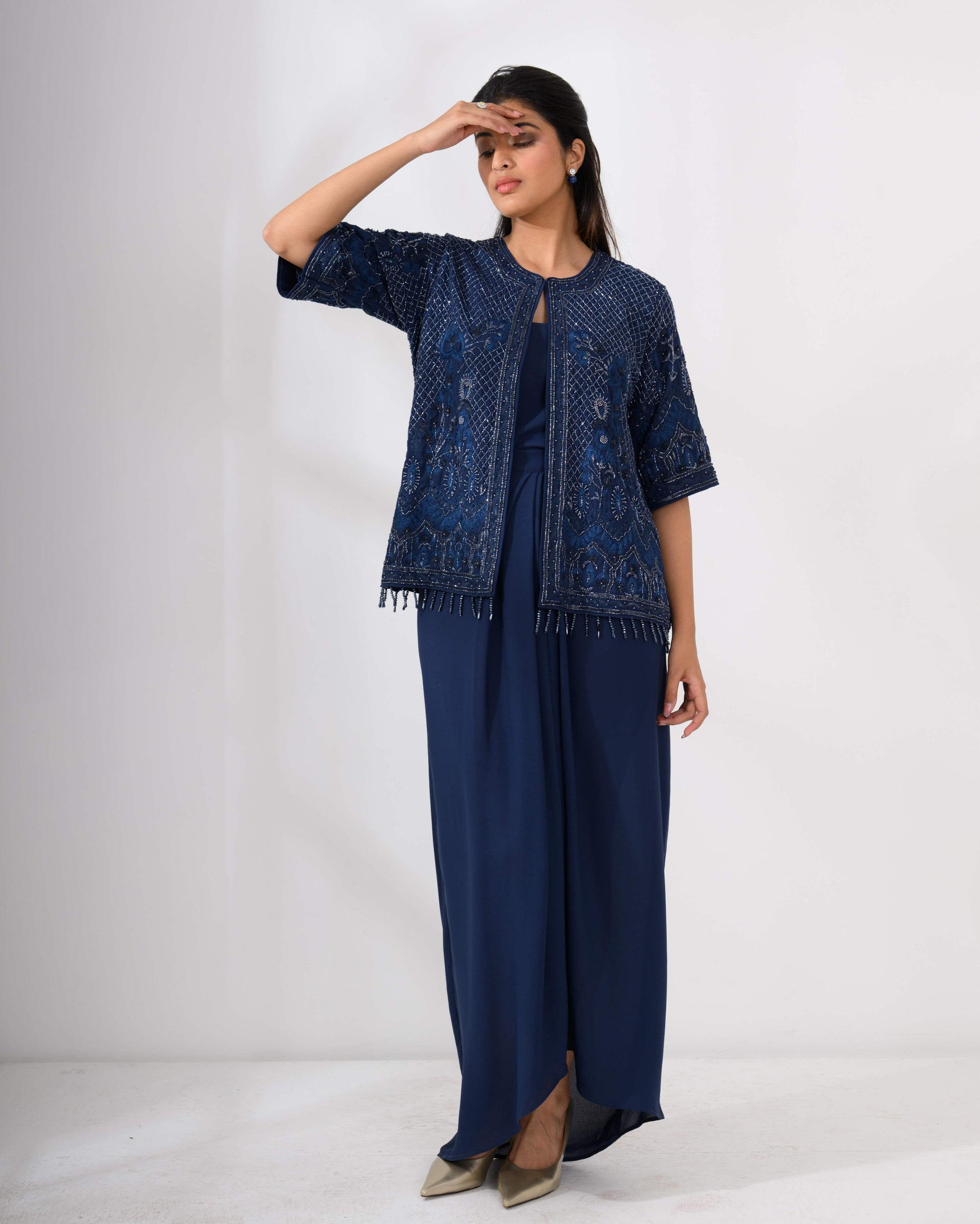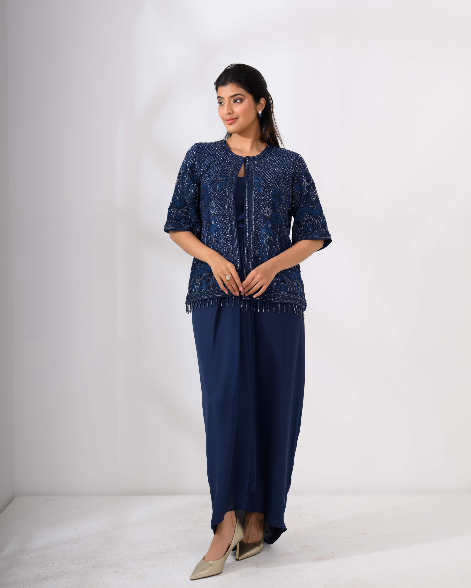 Embroidered Jacket & Drape Skirt Set – Hand embroidered jacket top paired with a draped skirt.