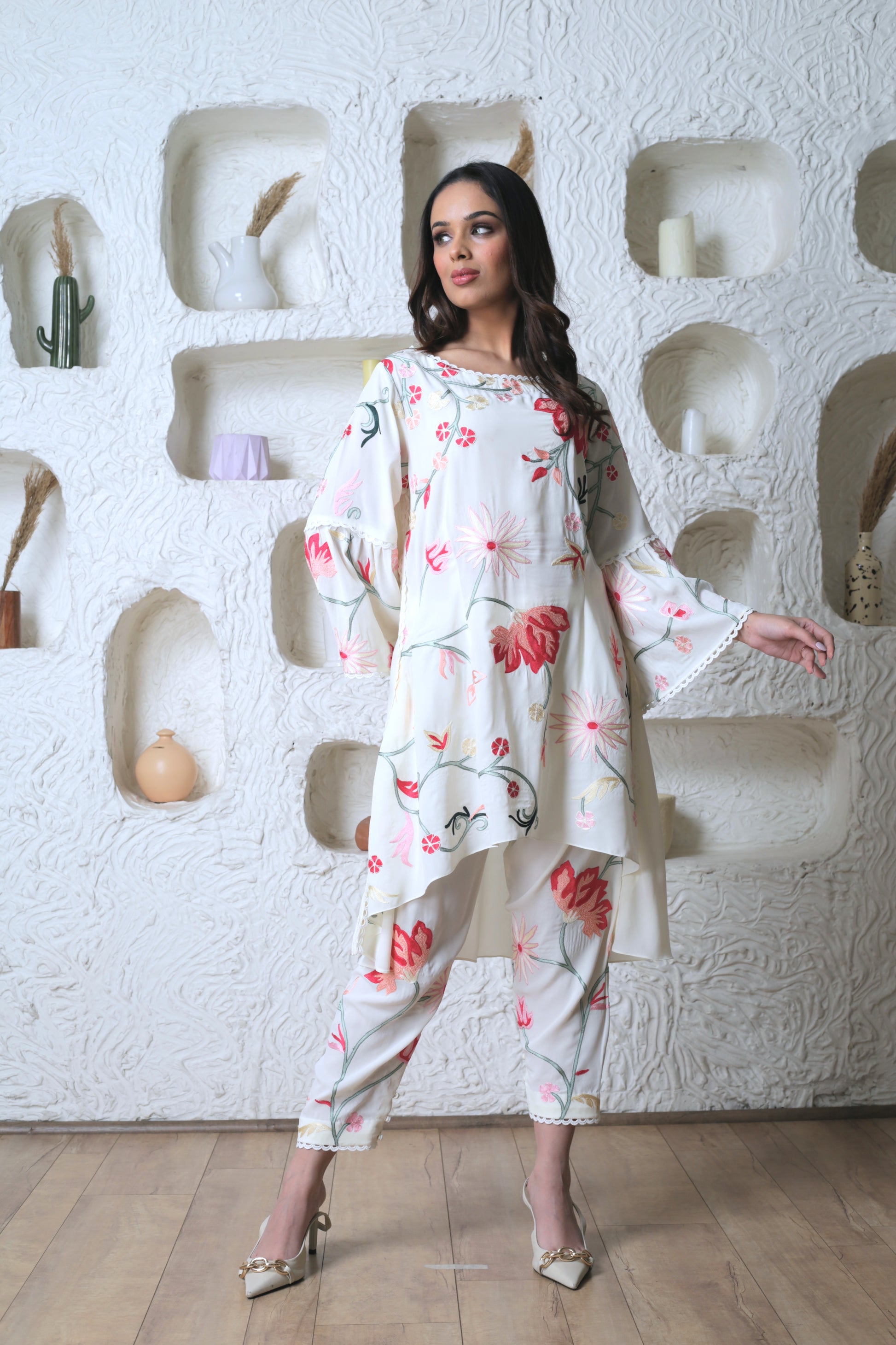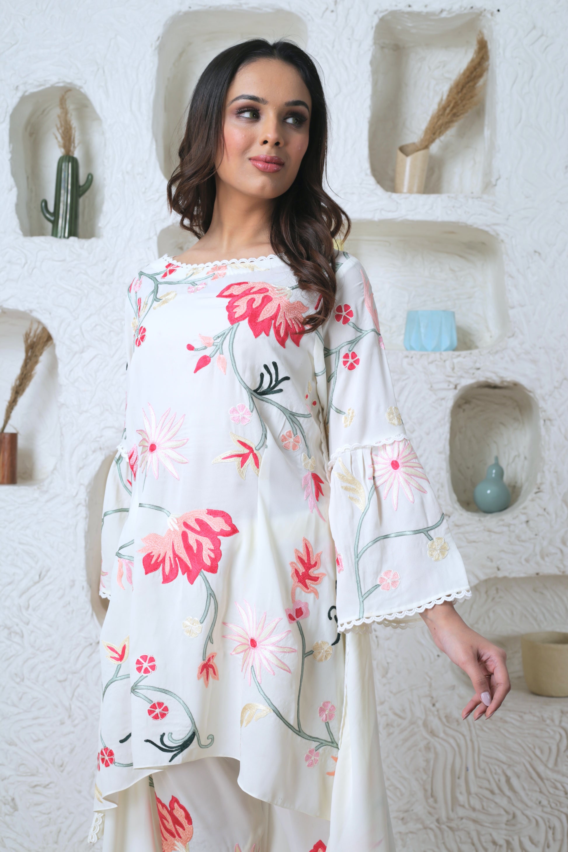 Floral aari-embroidered motif jaal kurta with Pakistani salwar in georgette fabric. Available in colours: Off-white & beige.