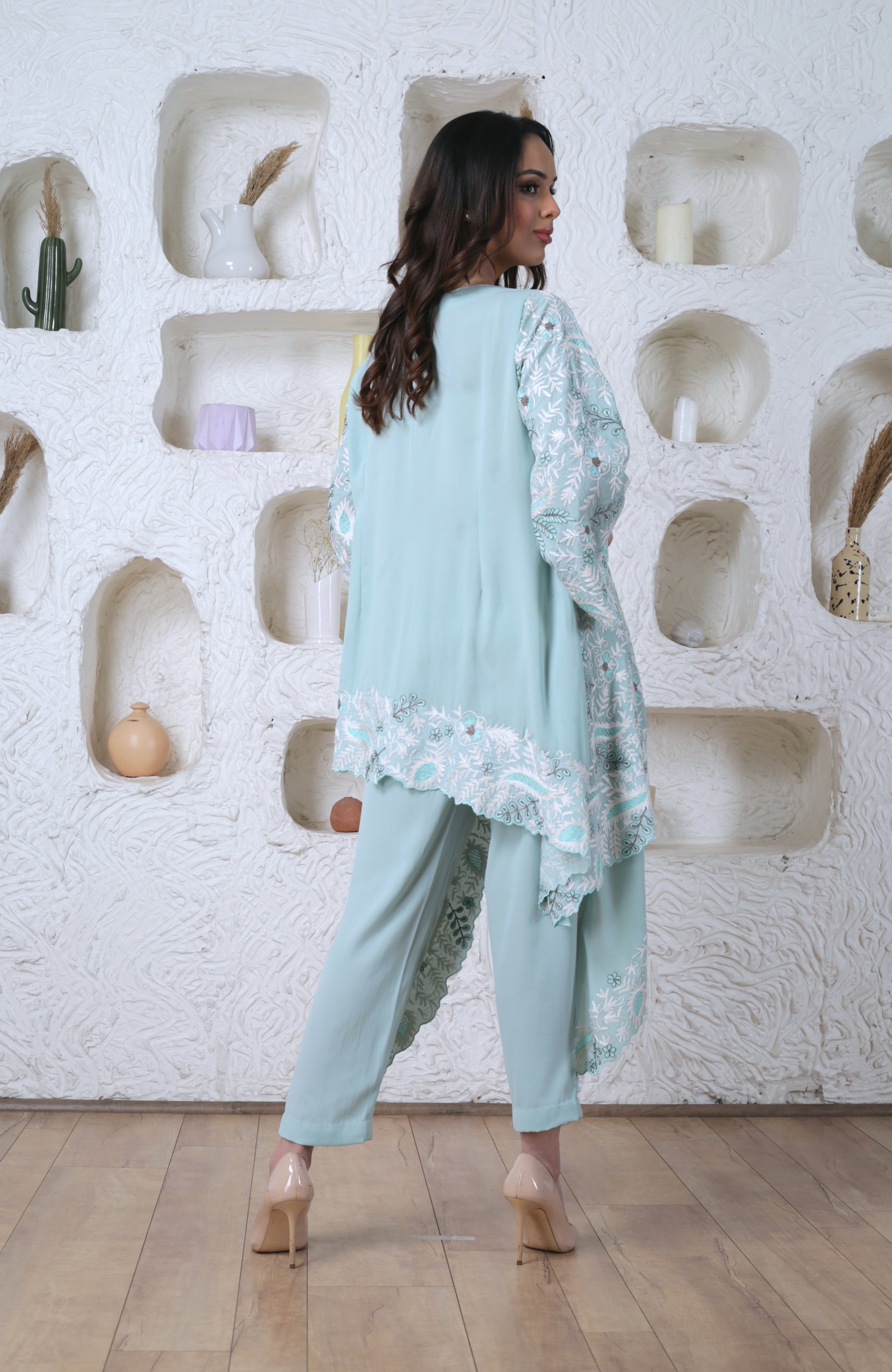 Self and white thread embroidered Asymmetrical top paired with embroidered flap pants.