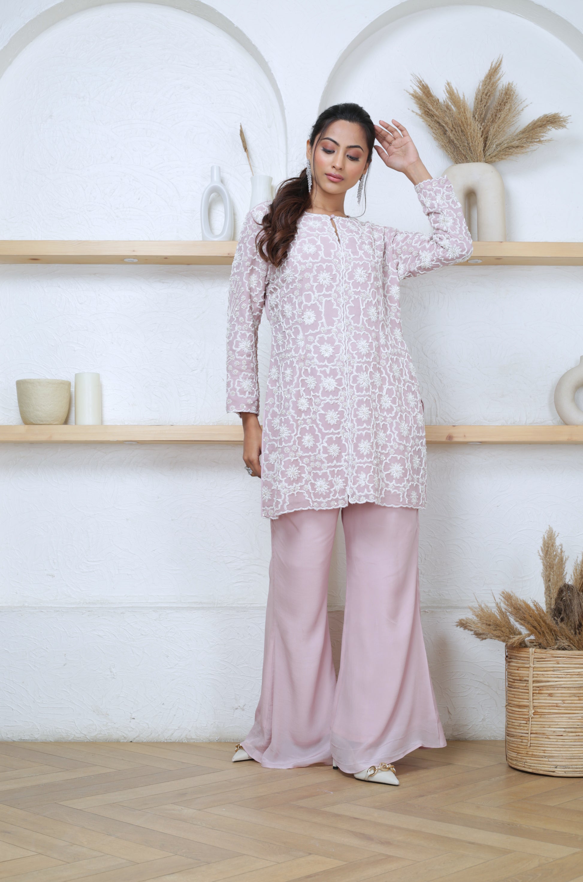 Hand embroidered with pearls, a kurta in georgette fabric paired with flared pants.