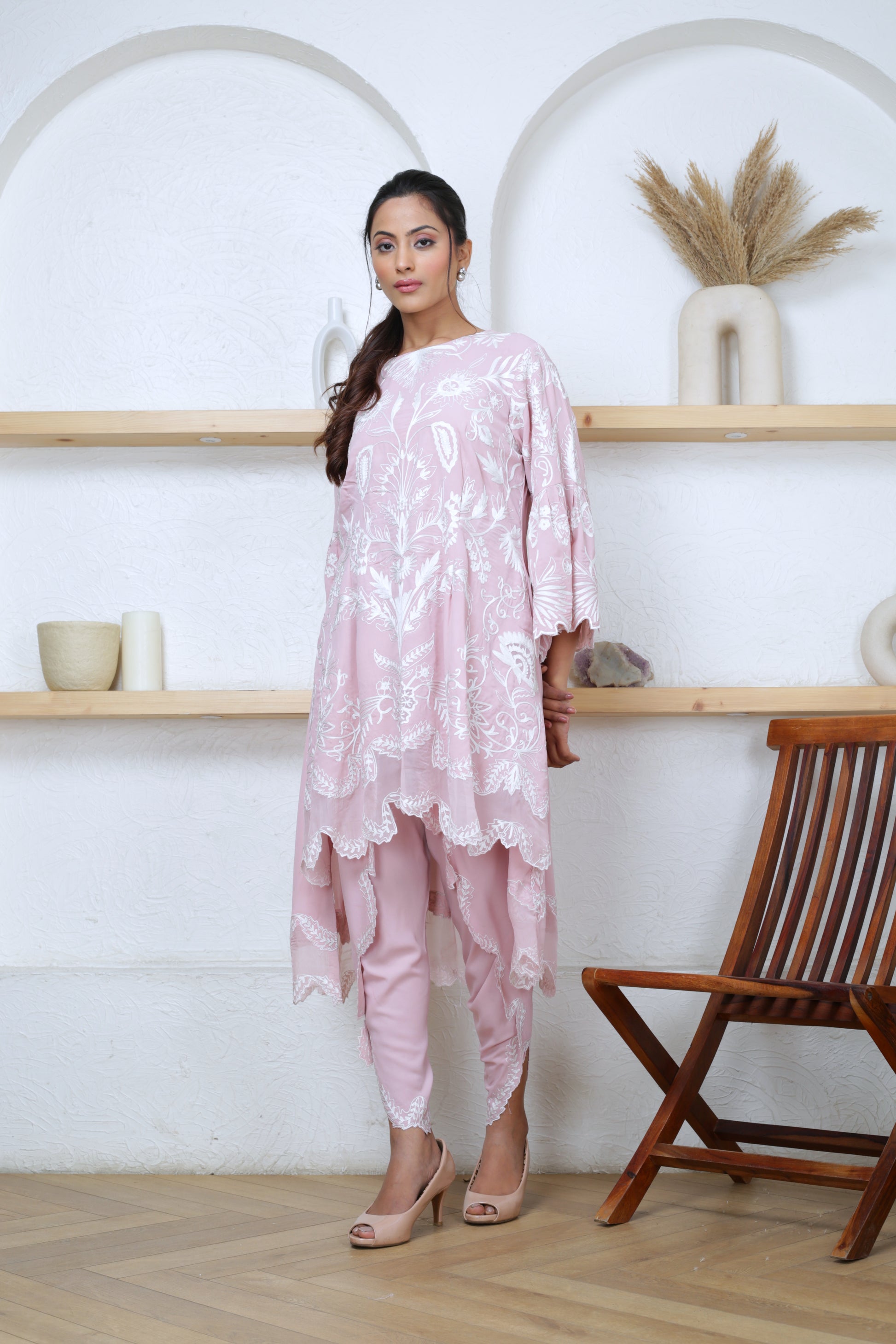 Organza patched work with thread embroidery on the kurta paired with a dhoti in georgette fabric.