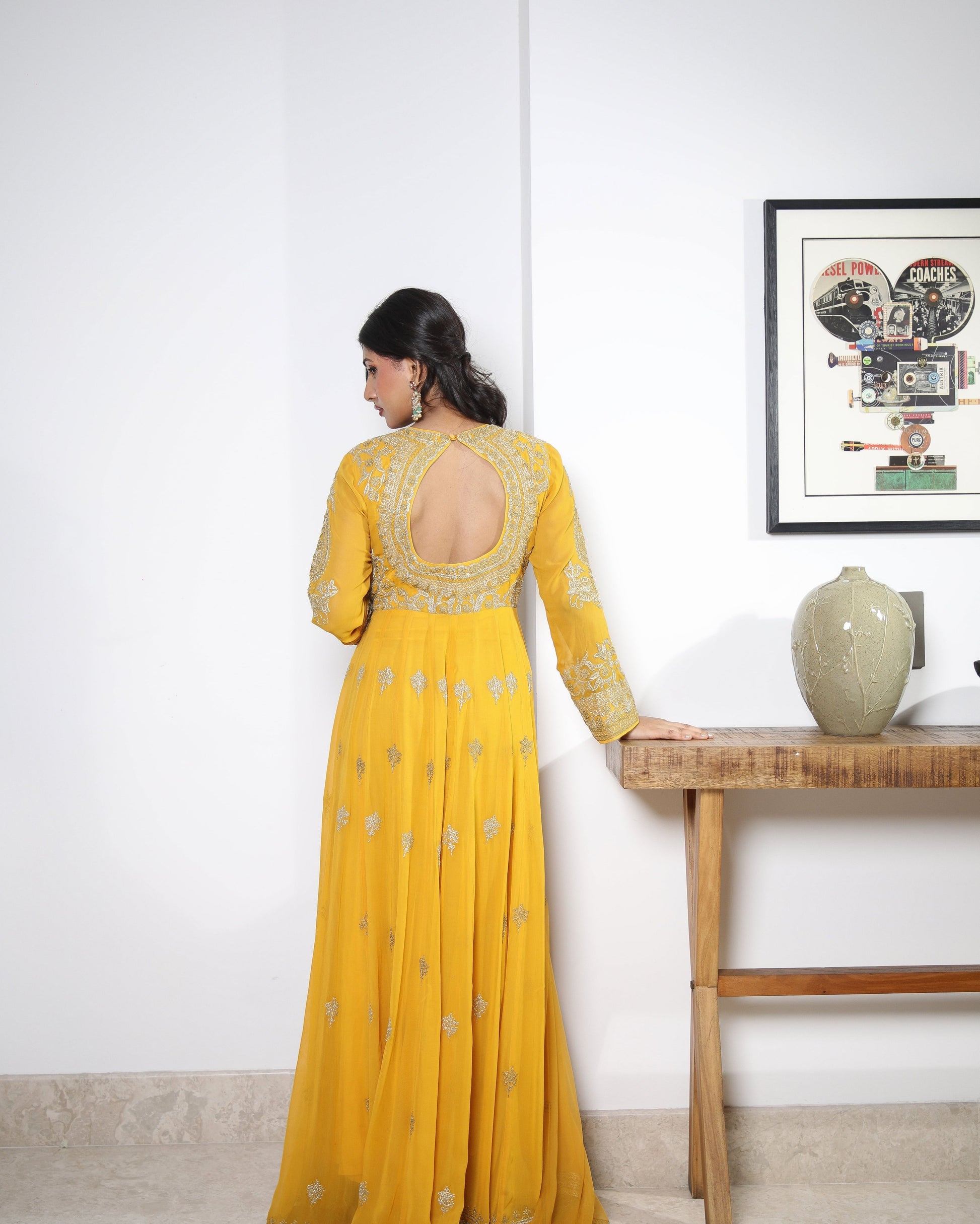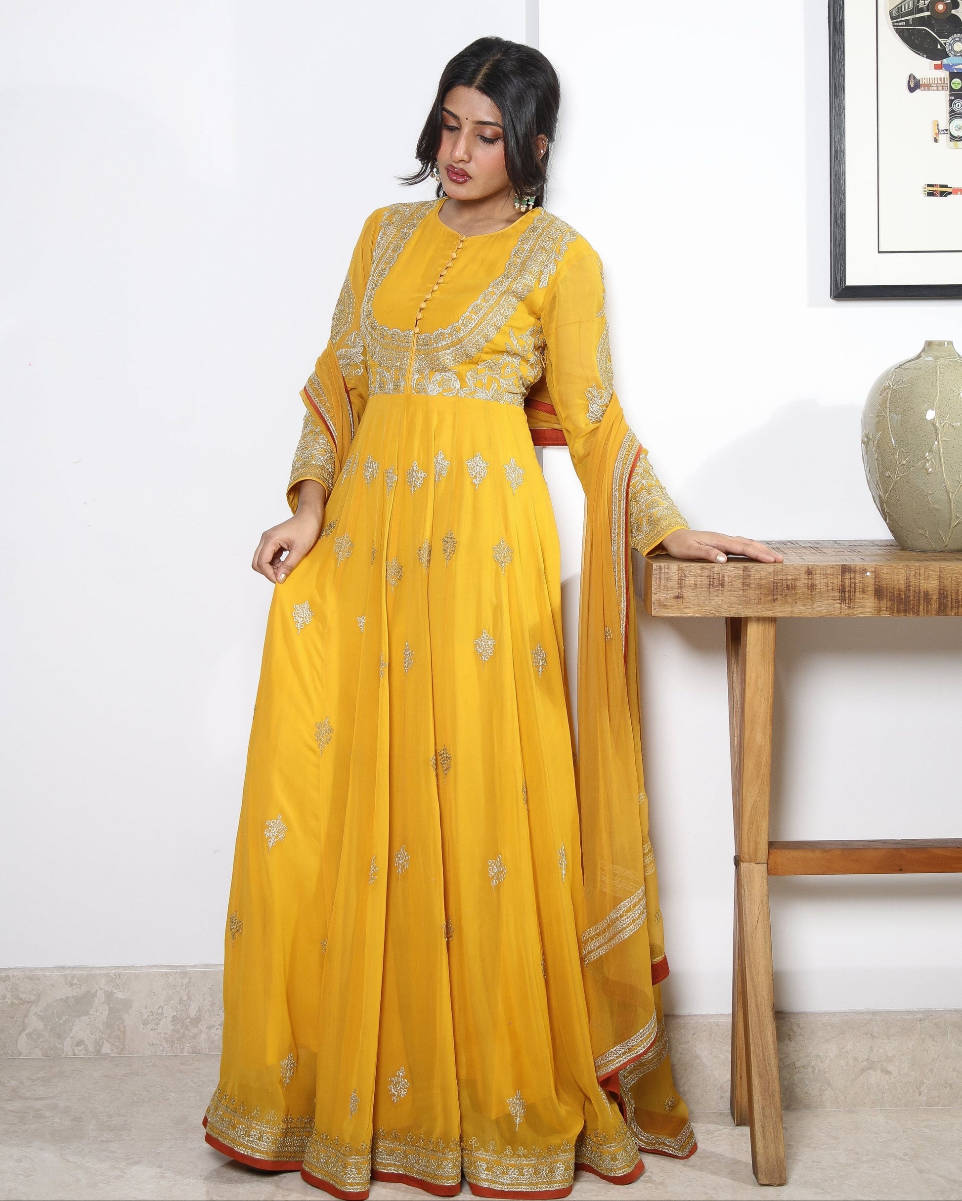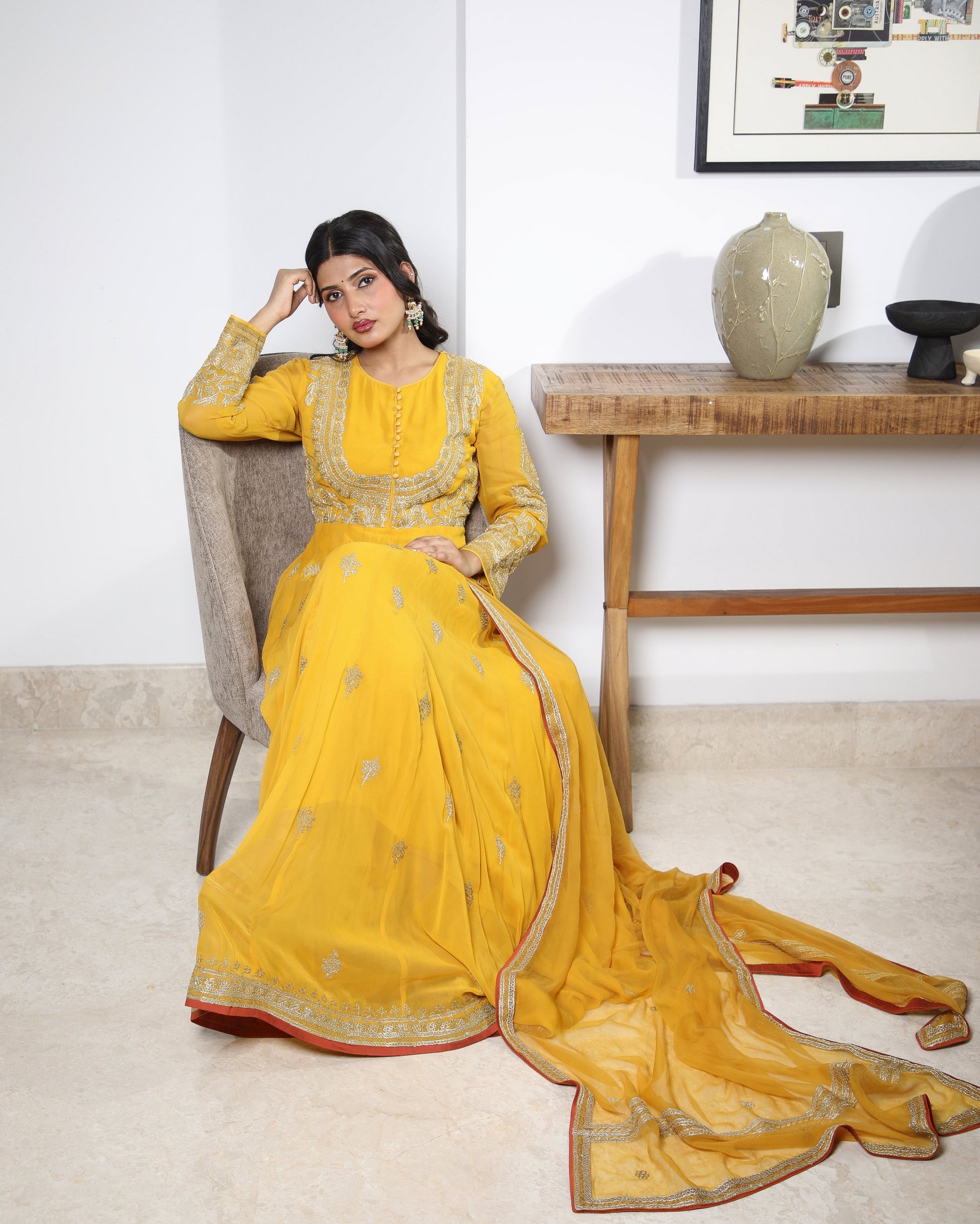 Pure georgette Anarkali adorned with intricate dori embroidery — graceful, detailed, and timeless.
