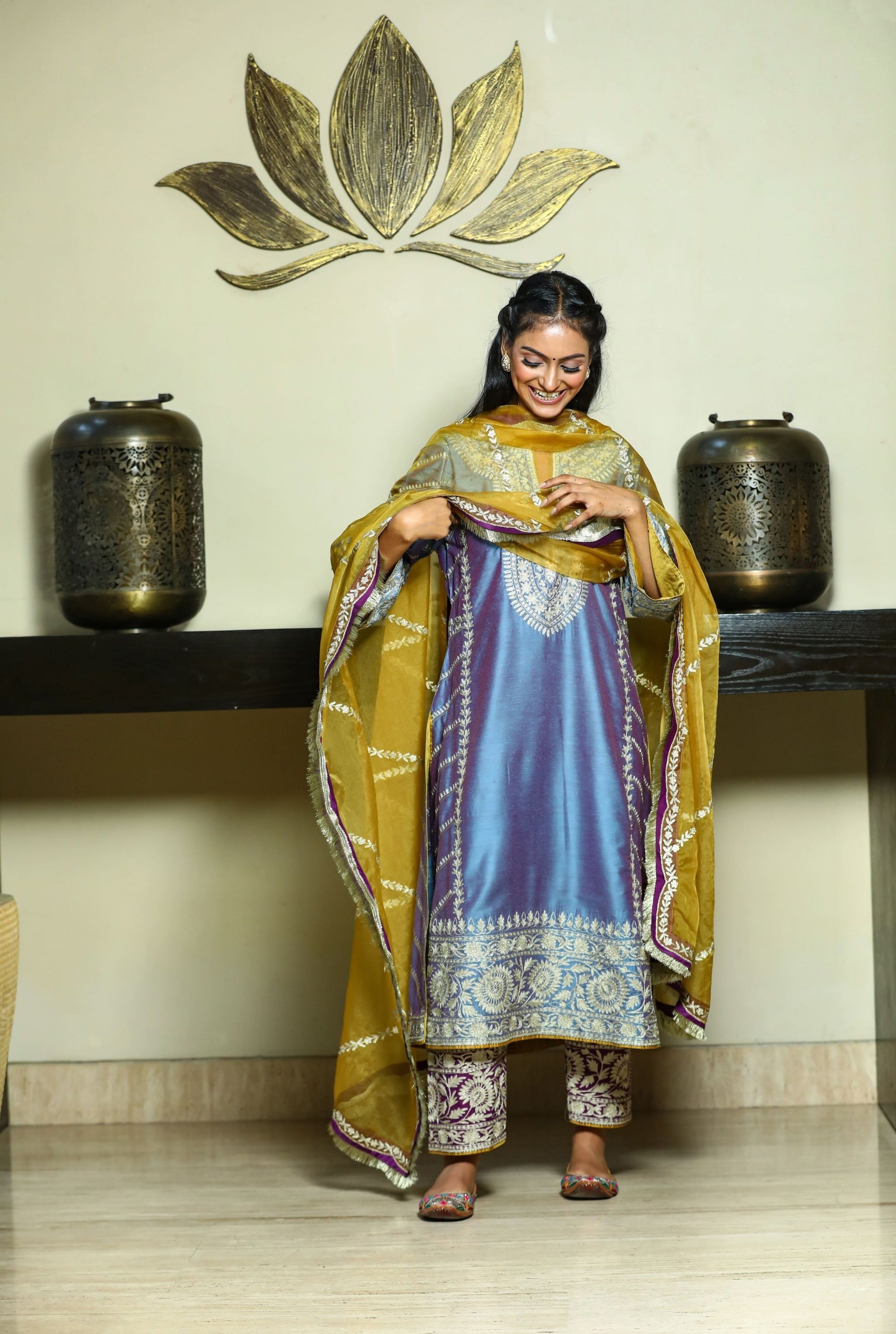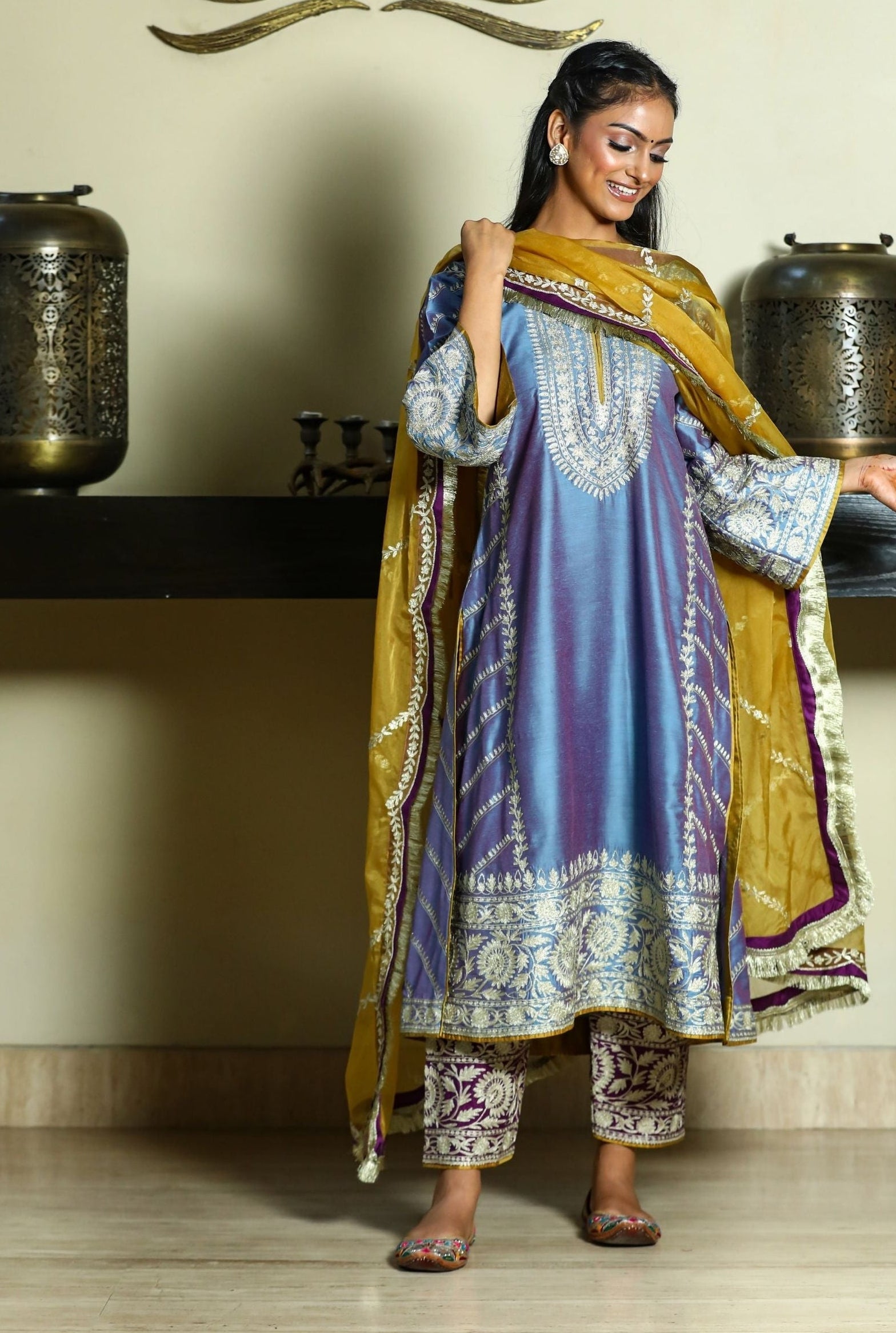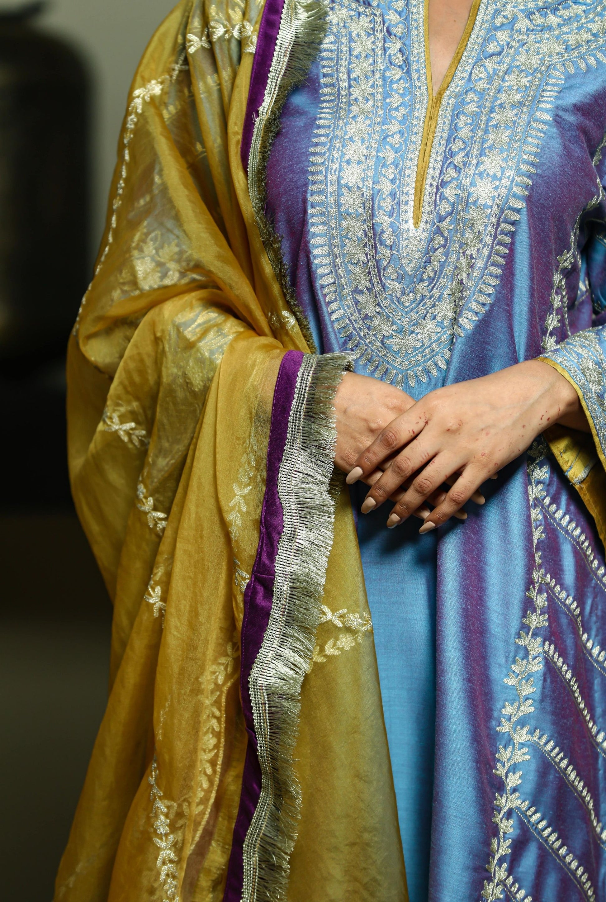 Gold aari-zari embroidered kurta in blue with embroidered purple pakistani salwar paired with an embroidered mustard organza dupatta.