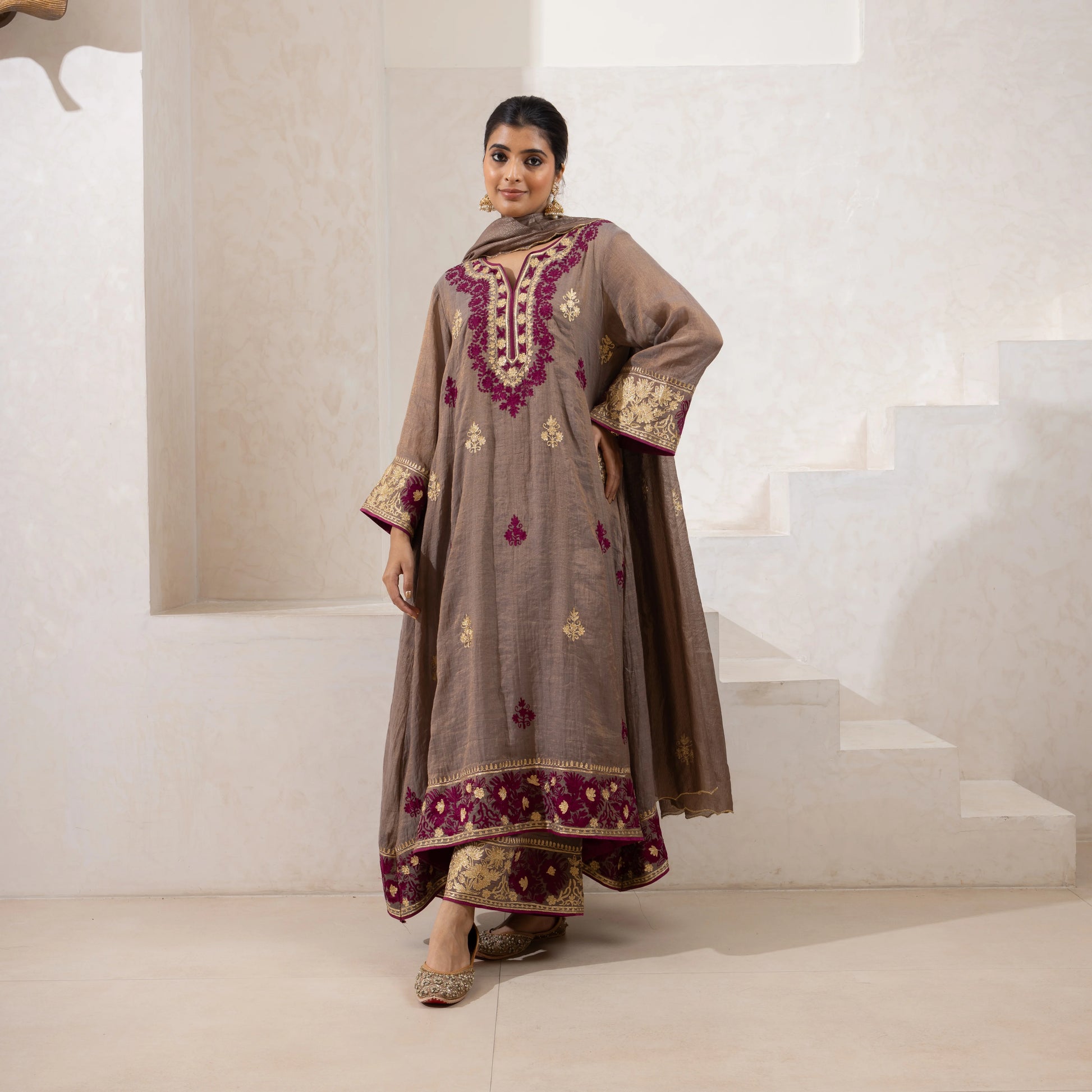 Gota and zari-embroidered kurta set in pure cotton silk, paired with a Pakistani salwar and organza dupatta. Customizable in any color.