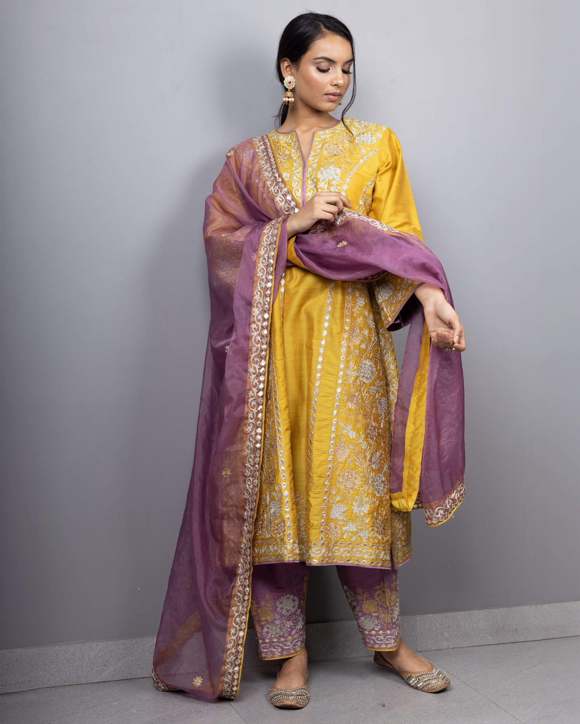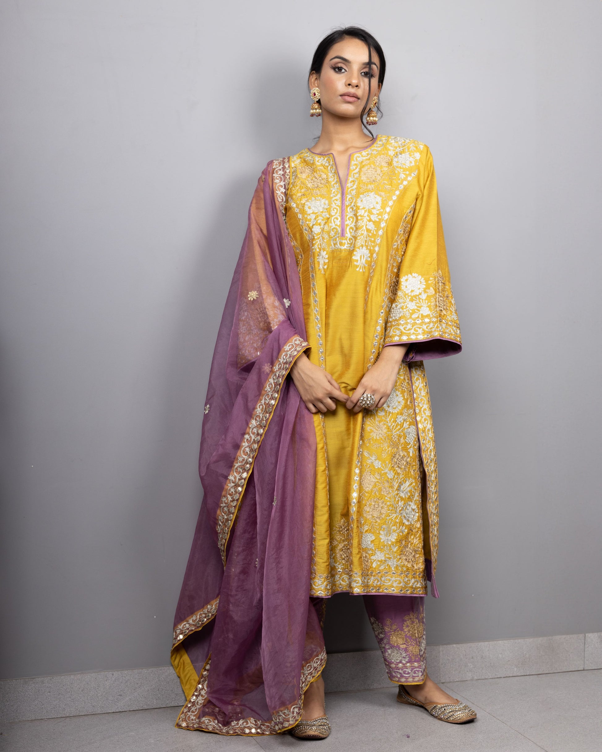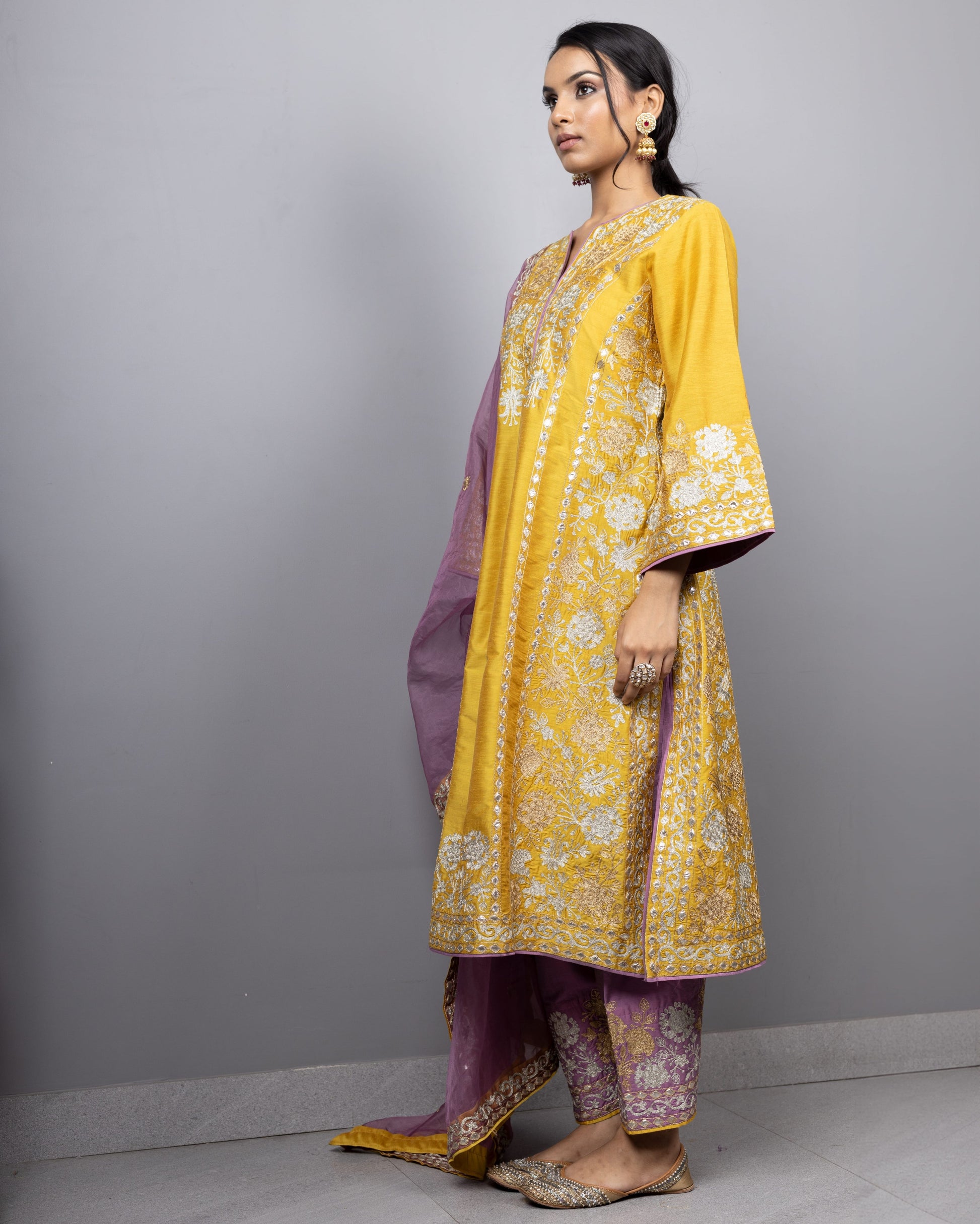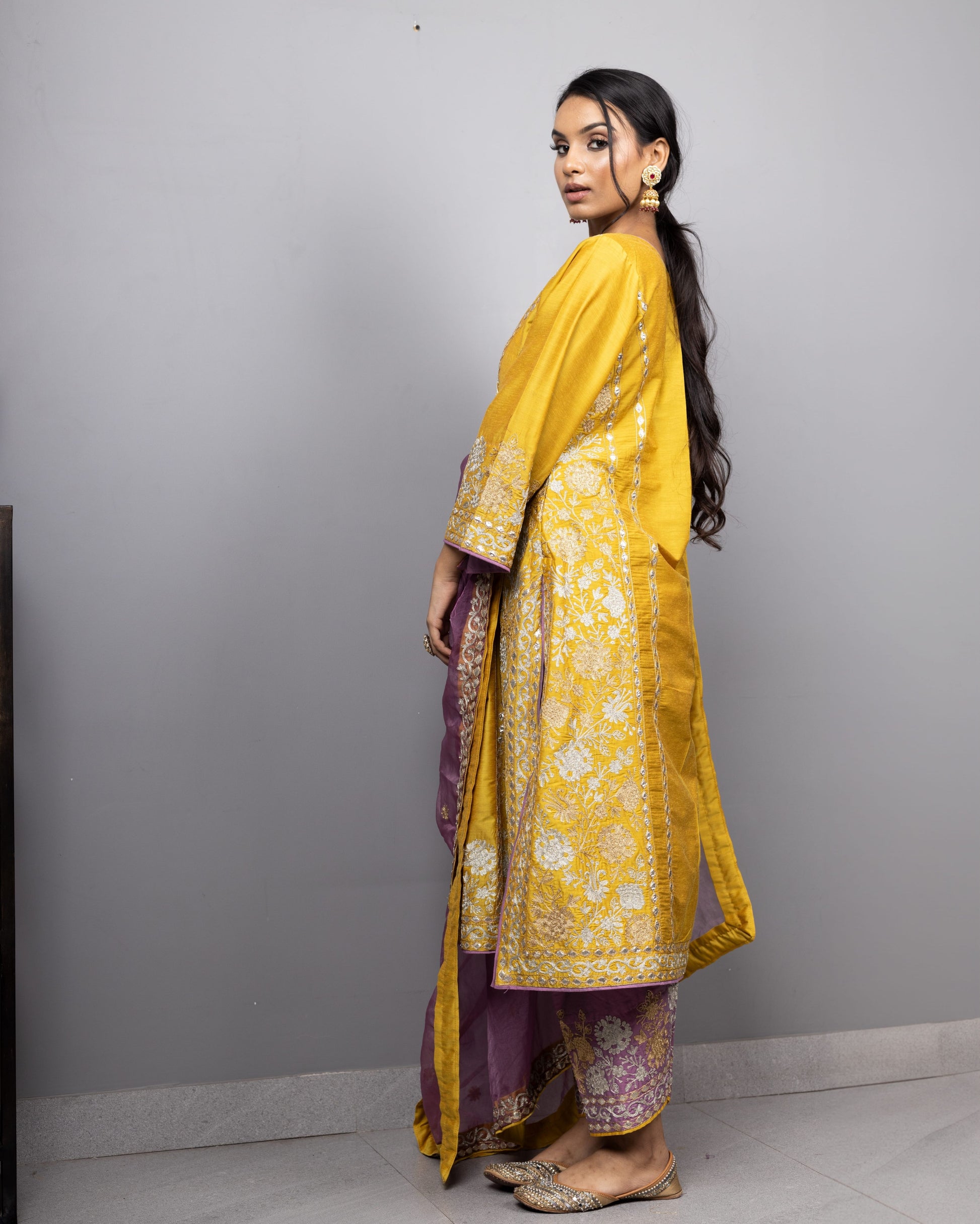 Introducing our gota pati and double toned aari embroidered A-Line kurta paired with an embroidered pakistani salwar and embroidered organza dupatta.