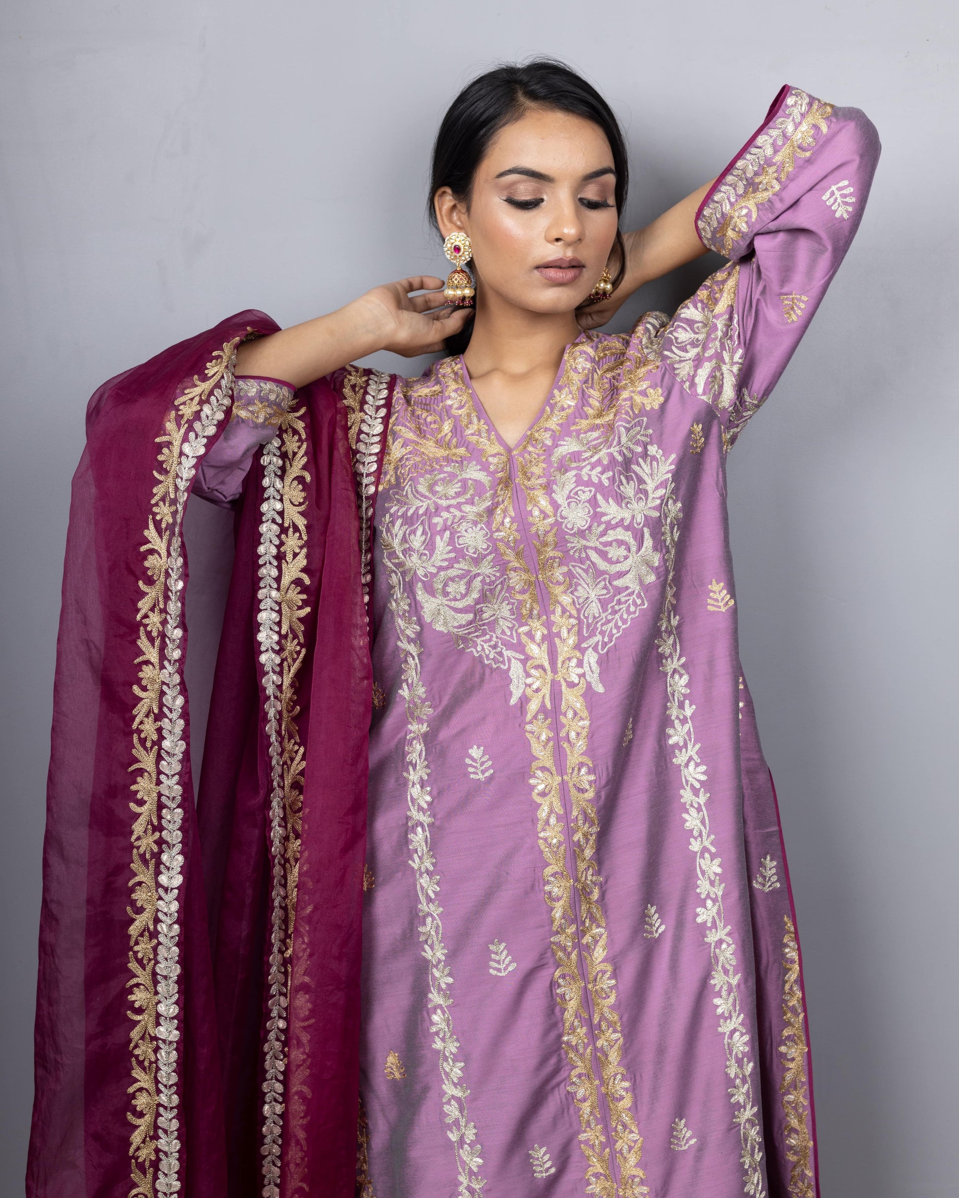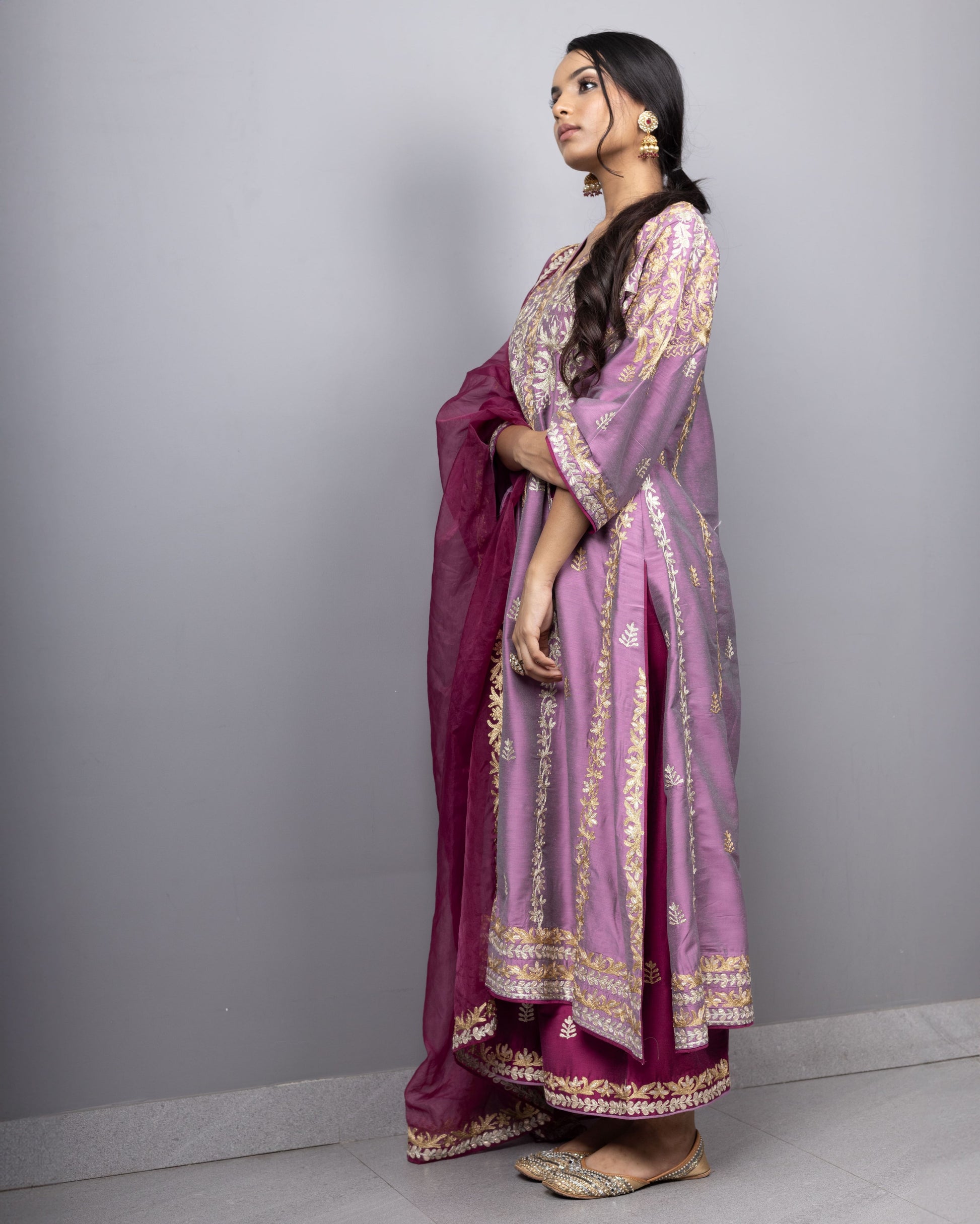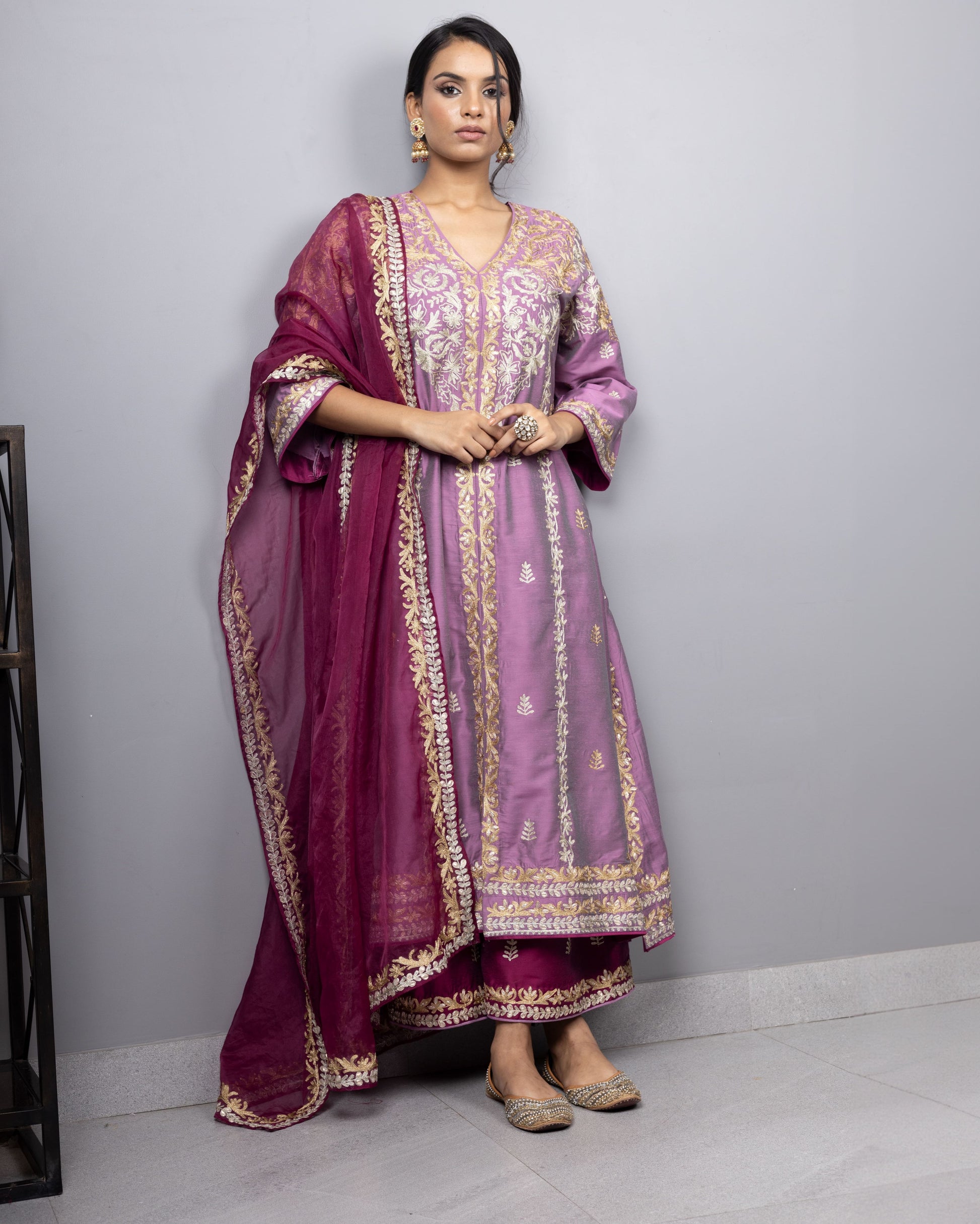 Introducing our gota pati and double toned aari embroidered A-Line kurta paired with an embroidered pakistani salwar and embroidered organza dupatta.