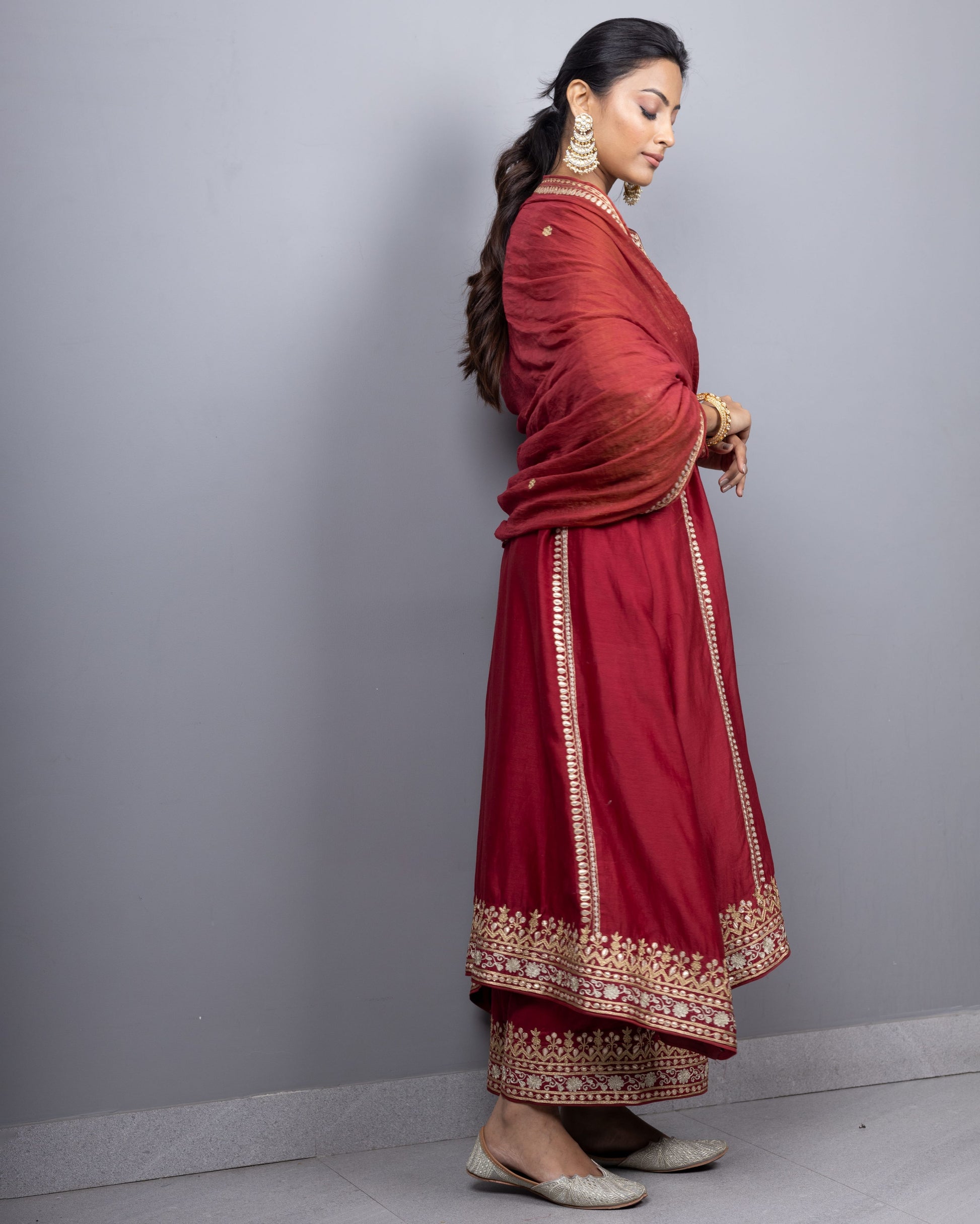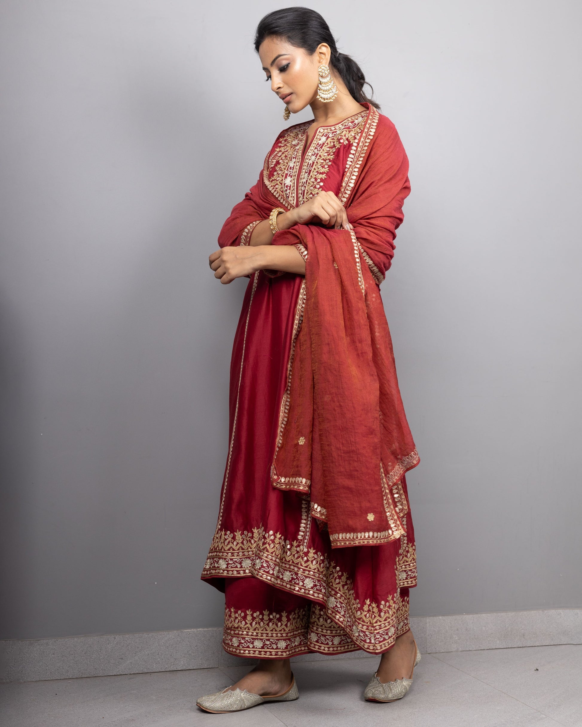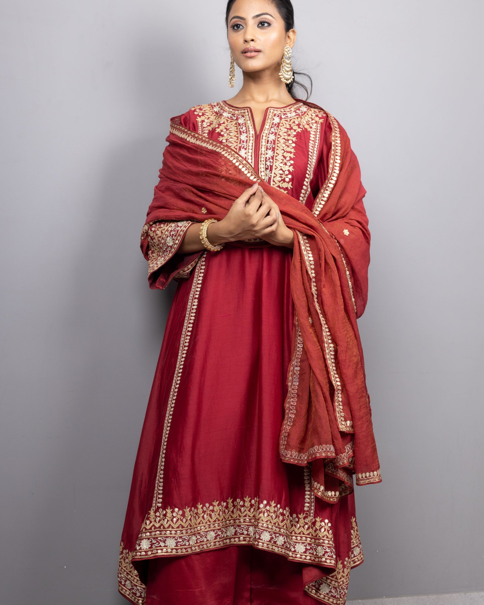 Our gota patti and double toned aari embroidered A-line kurtas with embroidered farshi salwars or pakistani salwars. The outfit on the right is adorned with an embroidered tissue chanderi dupatta.