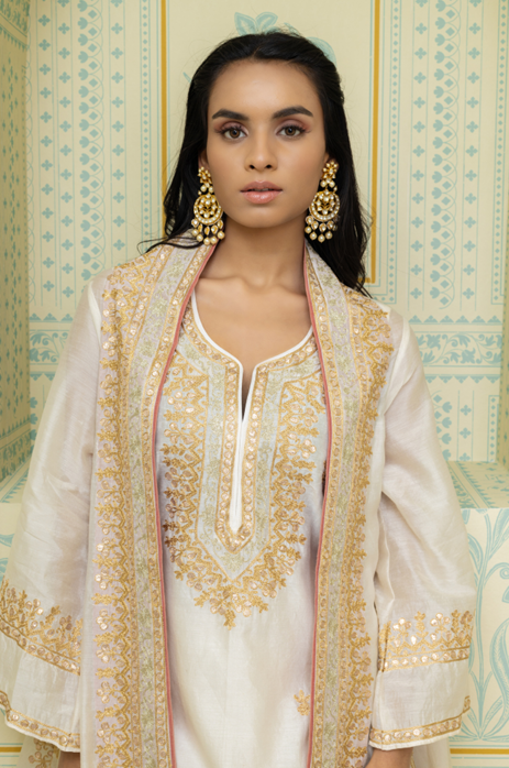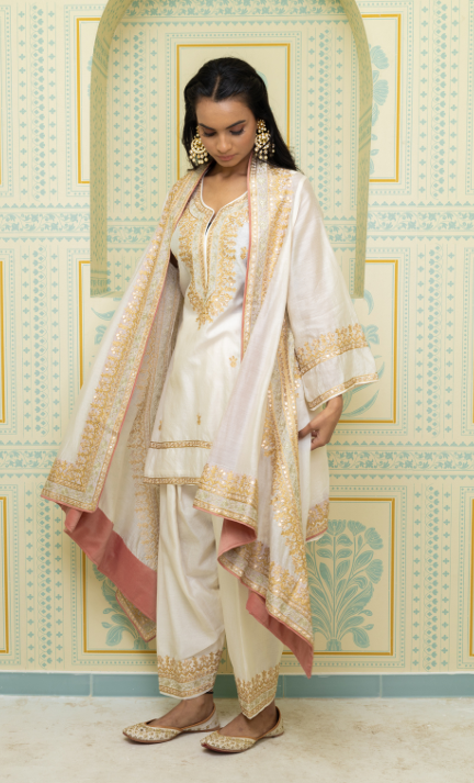 DUPATTA: Gotta pati and Kashmiri aari embroidery in dull gold and light gold