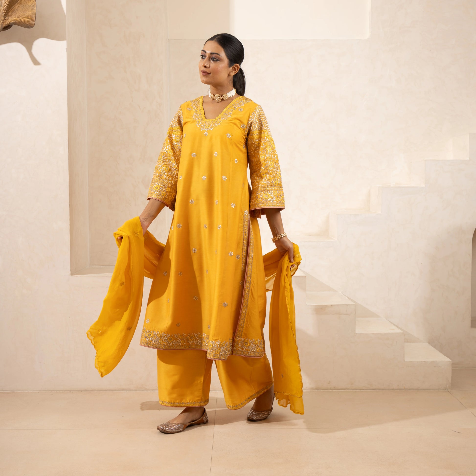 Gotta patti and Dori-embroidered A-line kurta set with