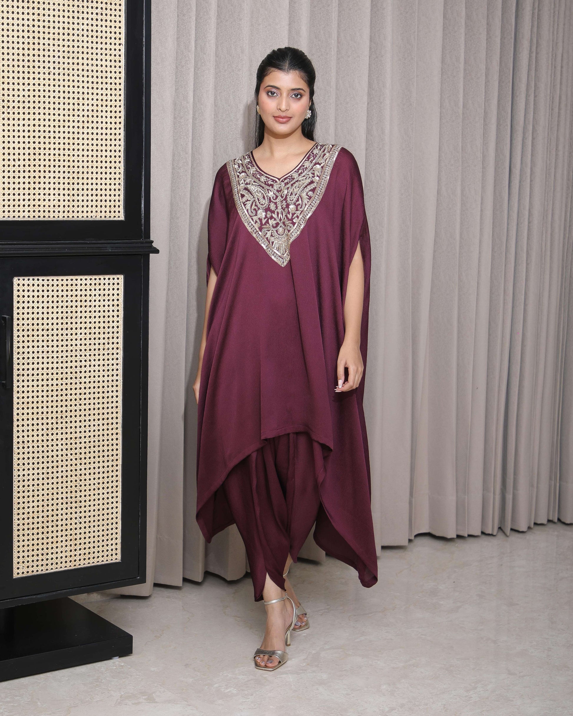 Intricately hand-embroidered draped kaftan sets, styled with fluid drape dhoti — a modern expression of festive elegance.