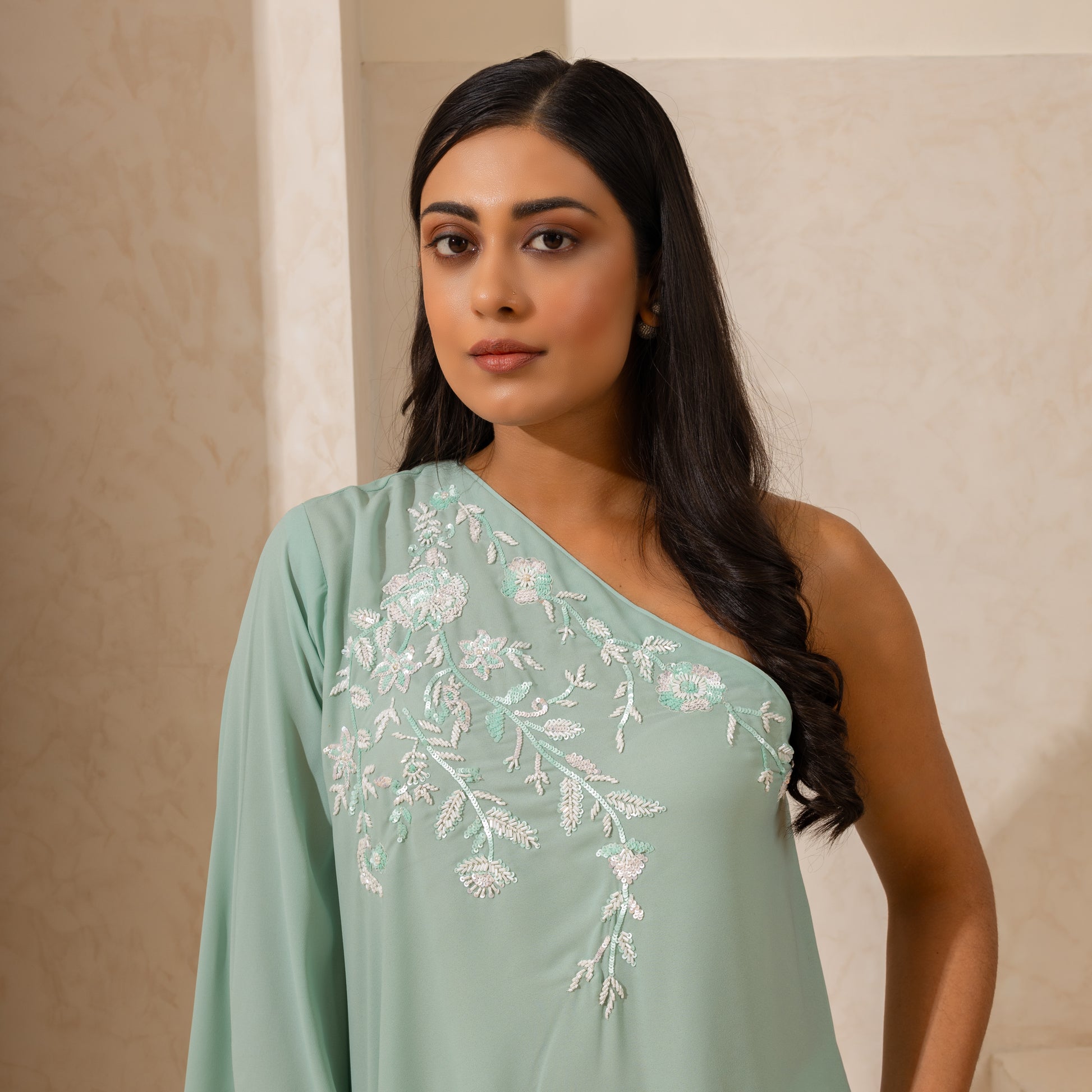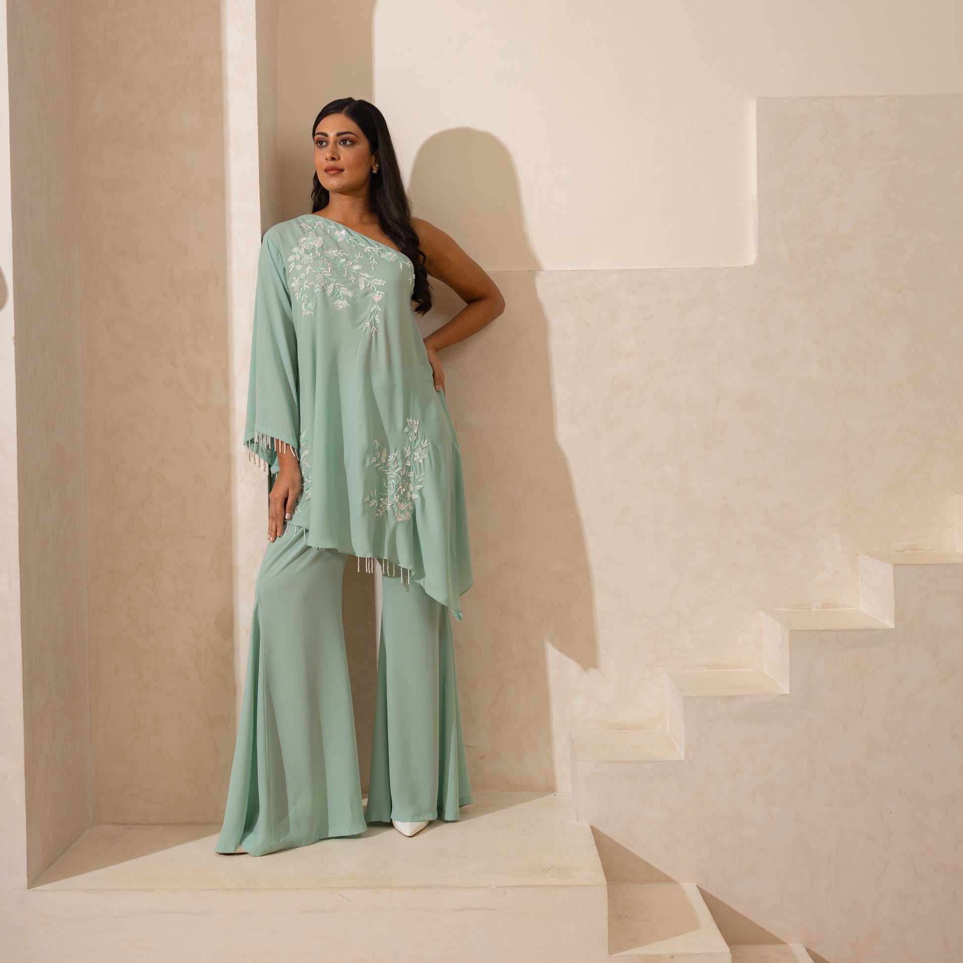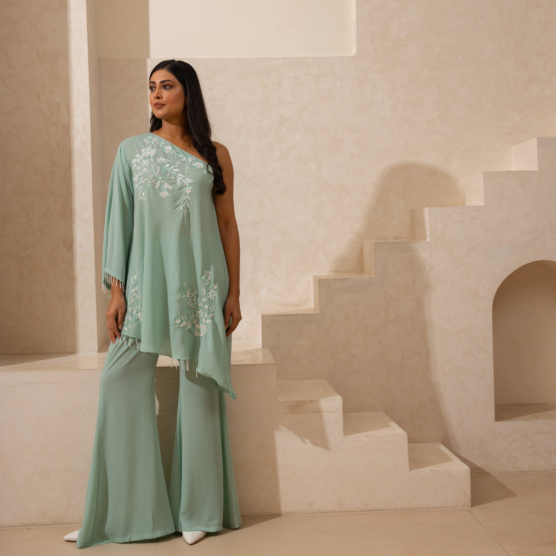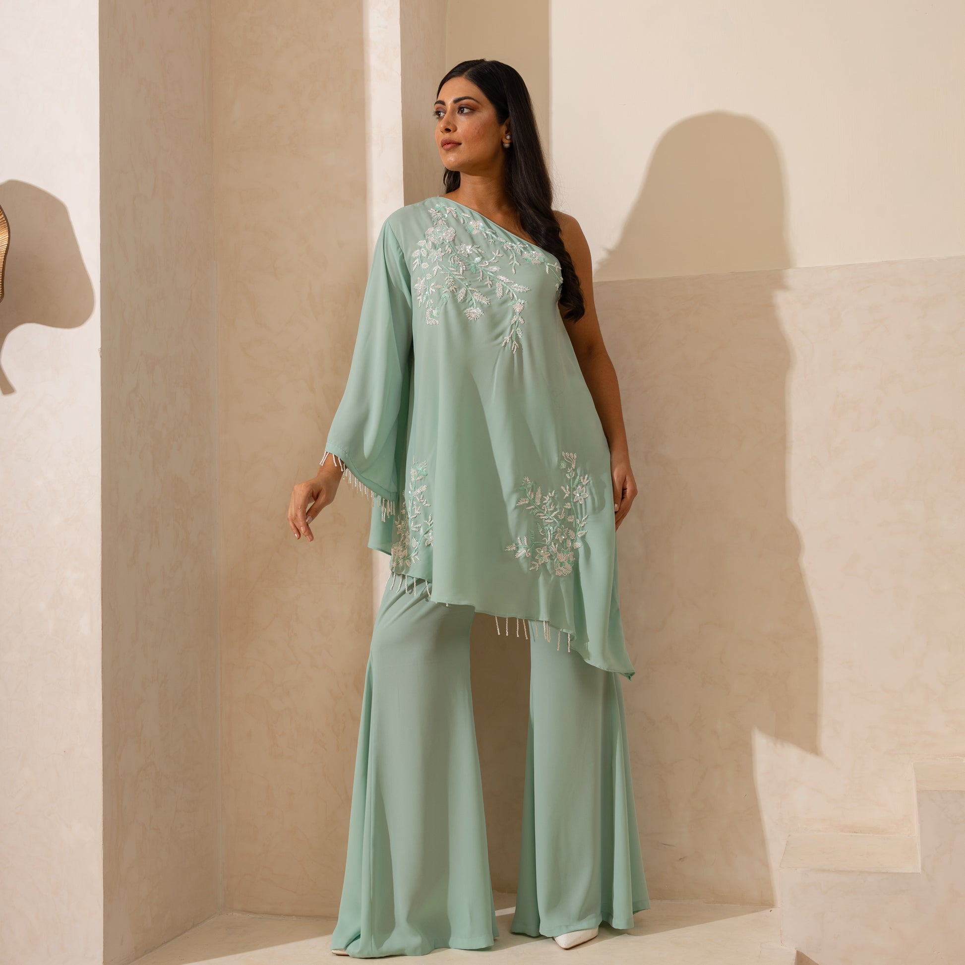 Hand-embroidered sequin set, available in blush pink with customizable color options.