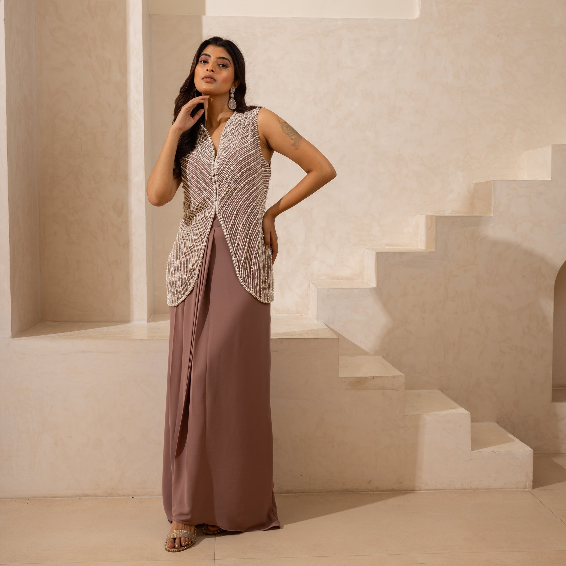 Hand-embroidered top with pearls, paired with a pleated skirt or pants. Customizable in any color.