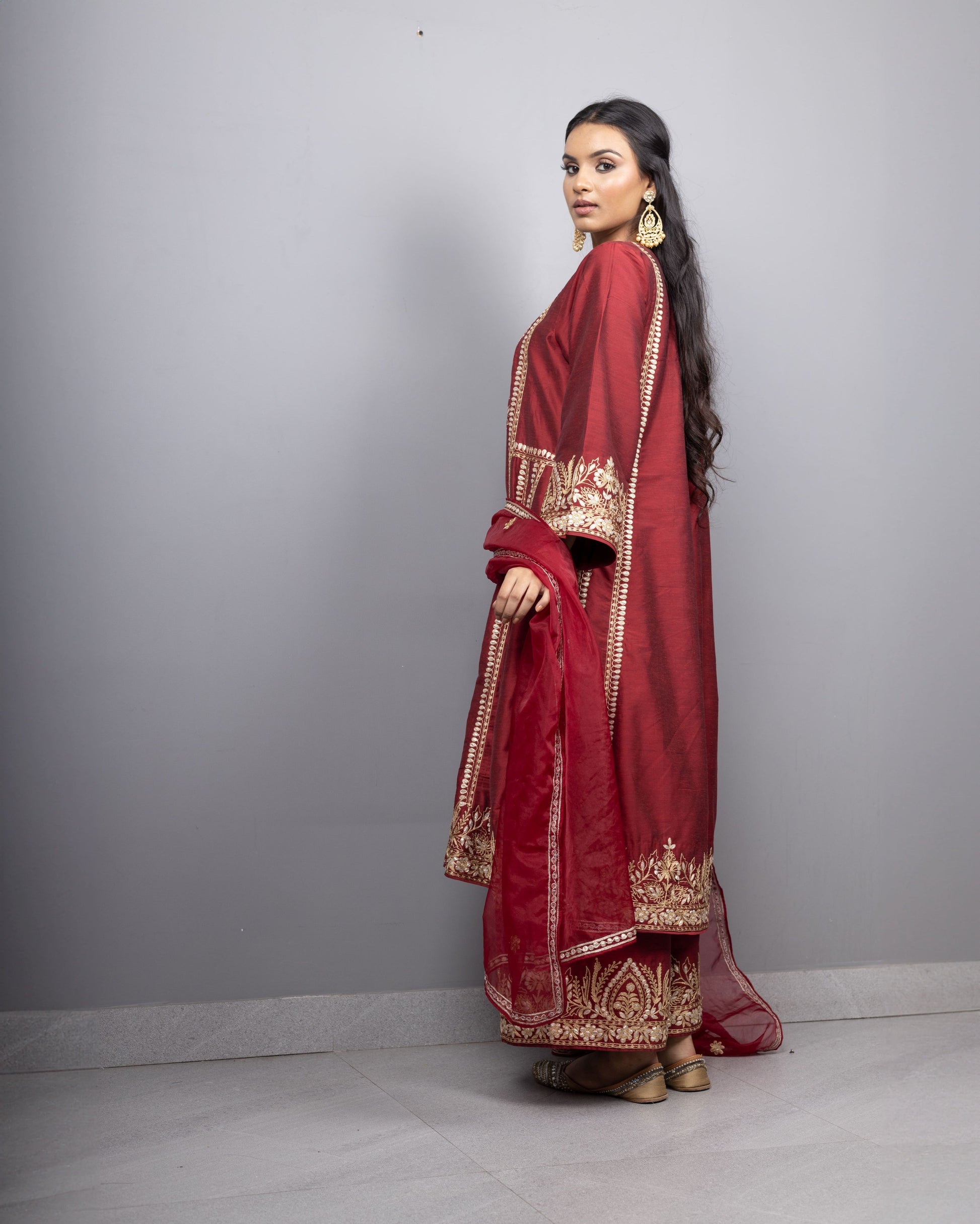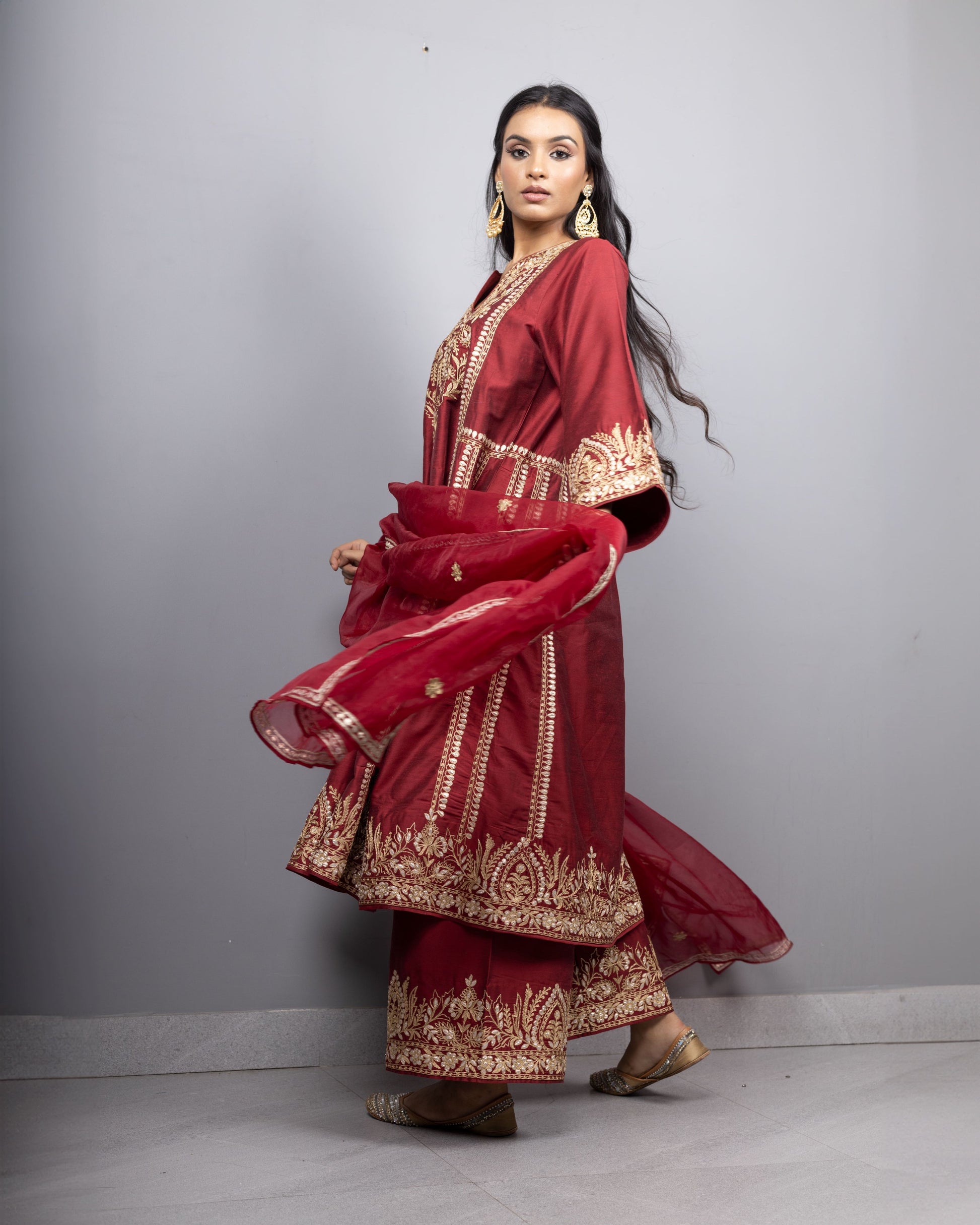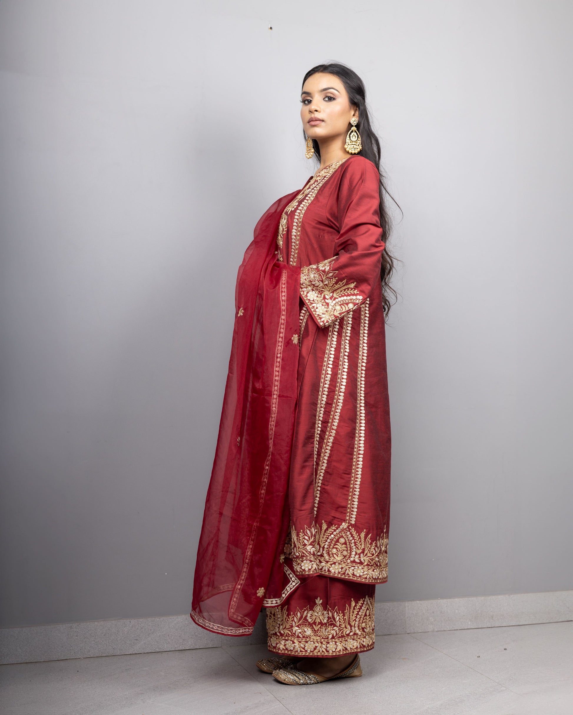 Introducing our double toned aari embroidered kurtas with embroidered farshis adorned with embroidered organza dupatta.