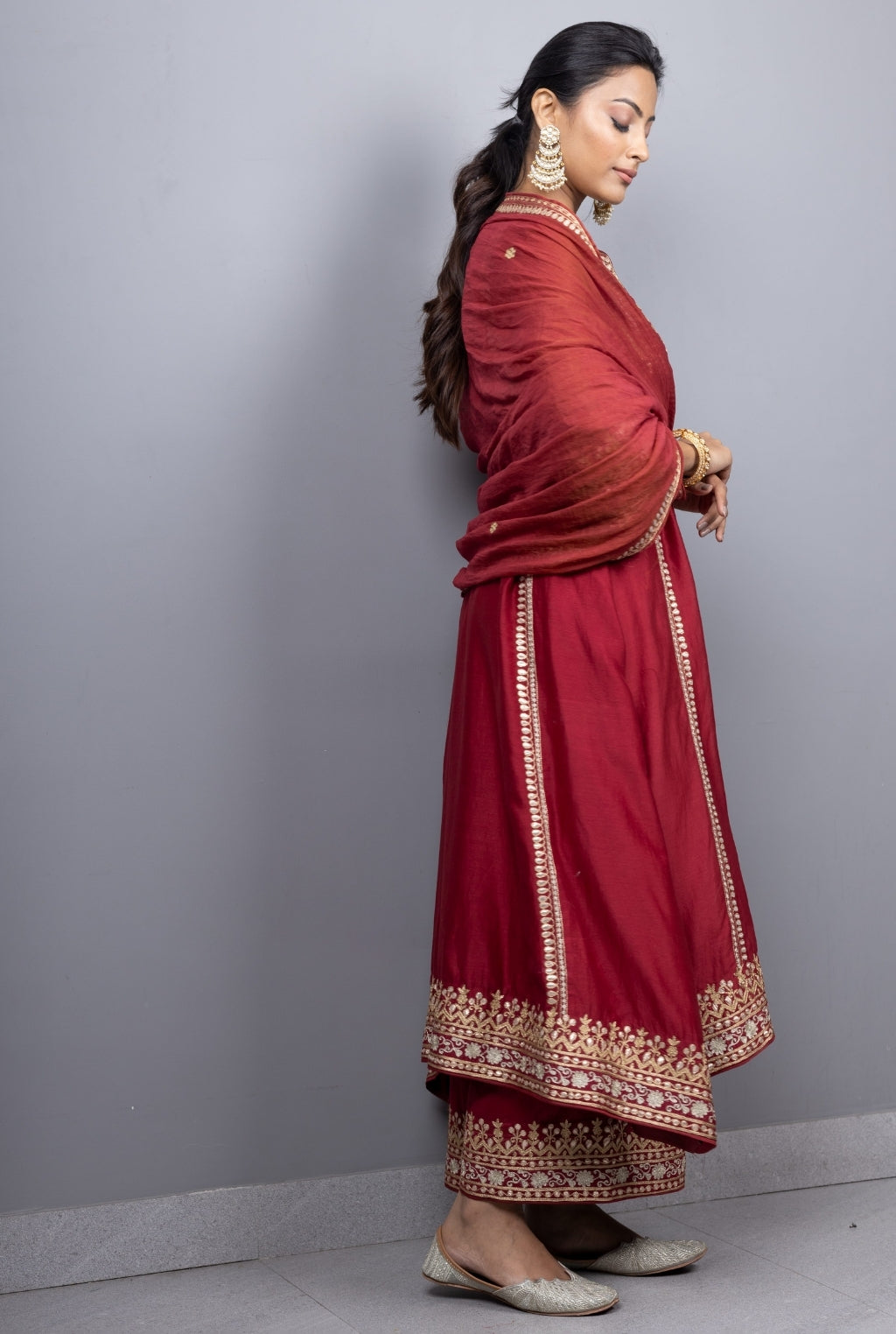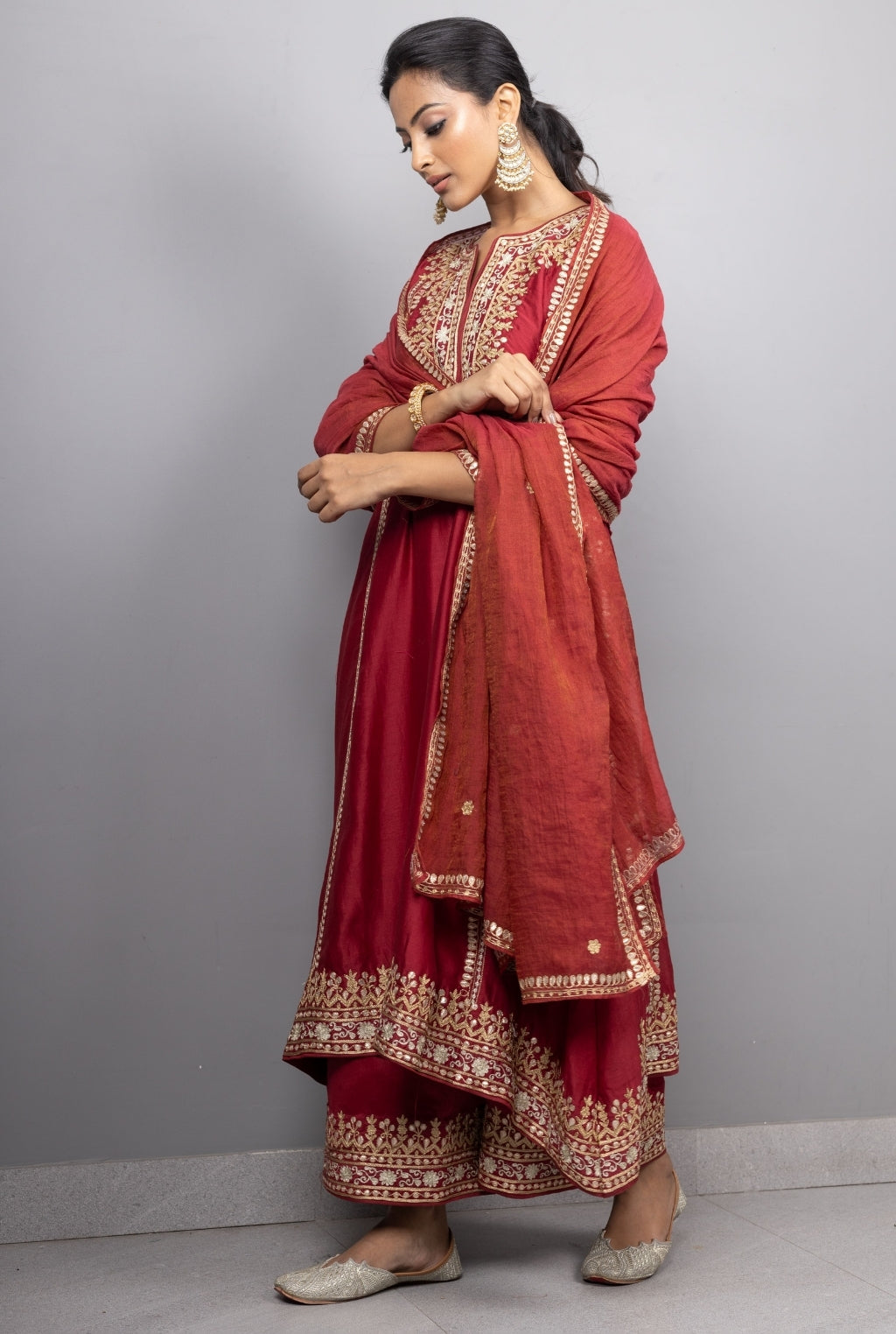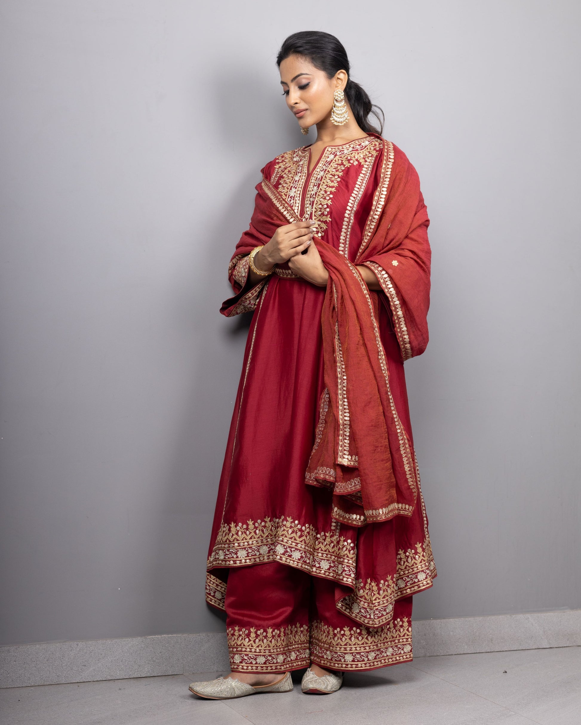 Introducing our double toned aari embroidered kurtas with embroidered farshis adorned with embroidered organza dupatta.