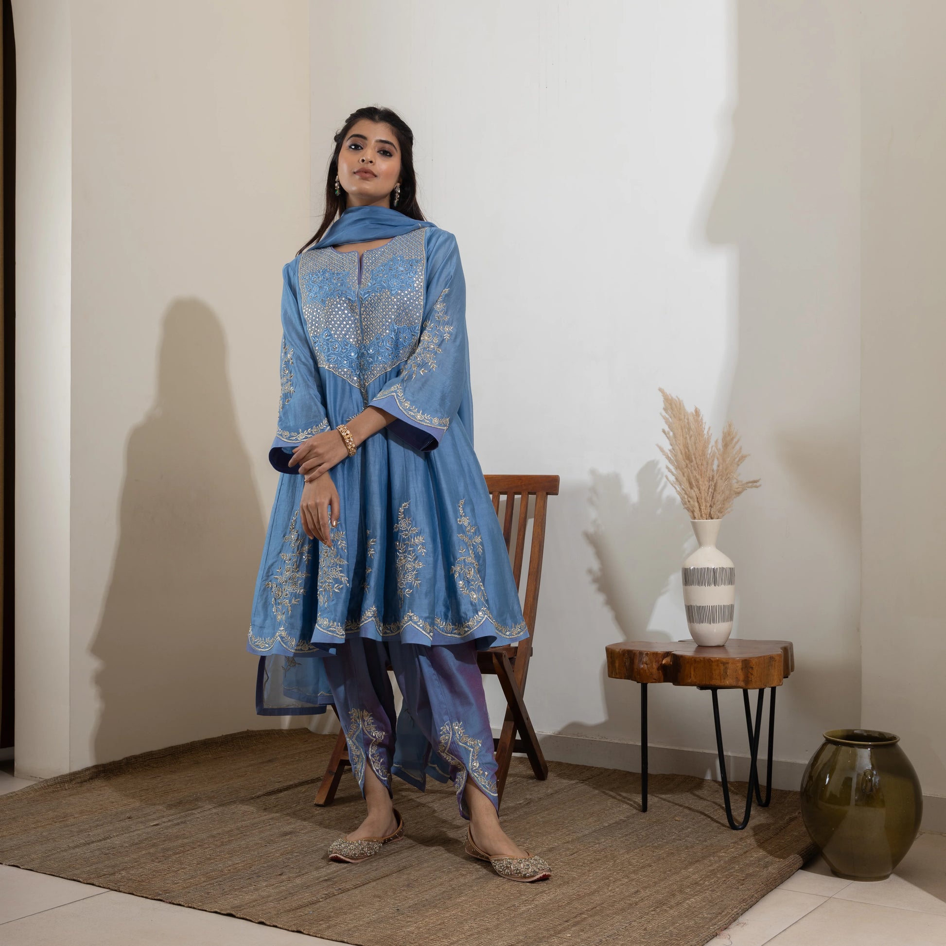 A Chanderi silk short Anarkali featuring Dori, thread, and hand embroidery, paired with a Pakistani salwar and an organza dupatta. Customizable in any color.