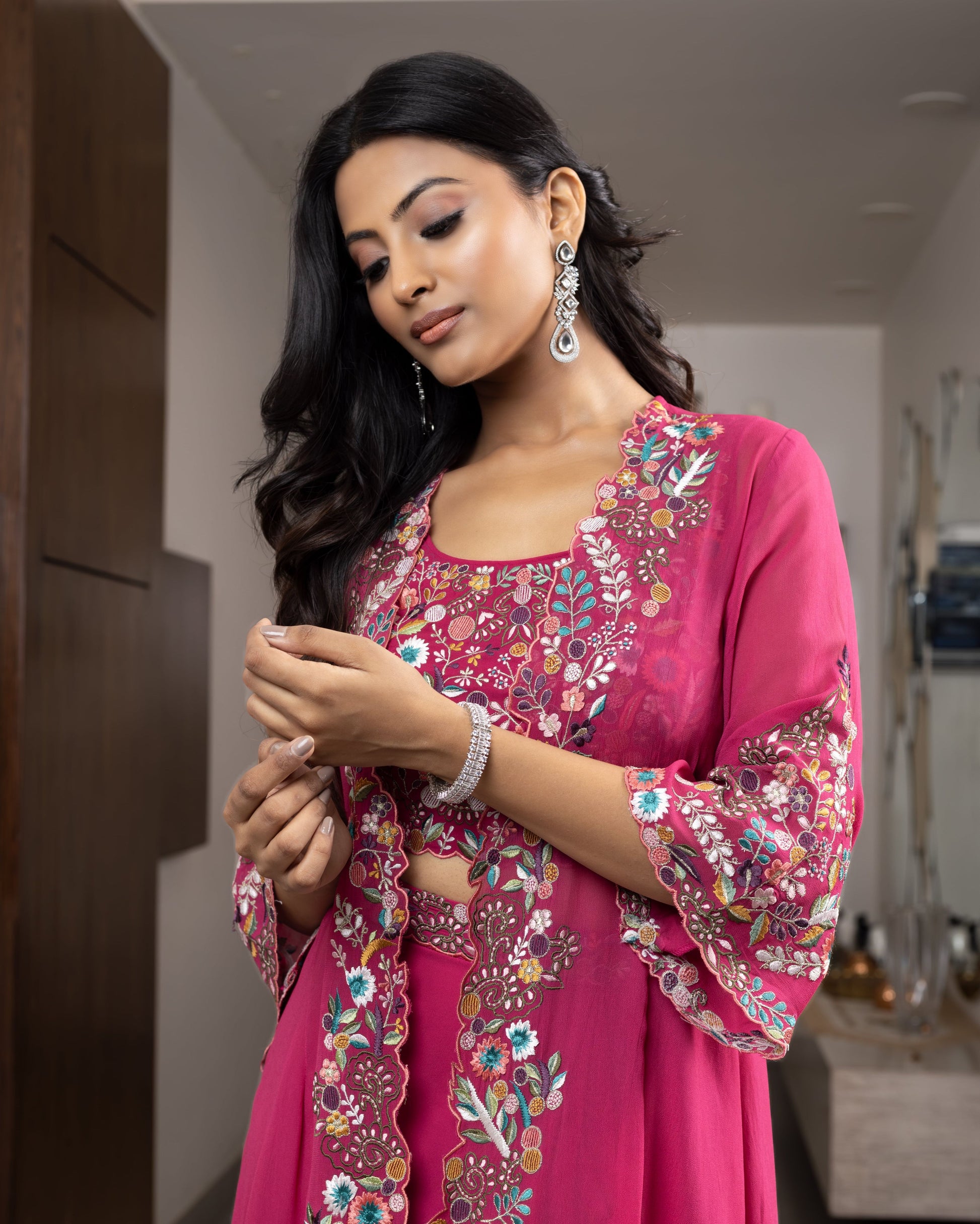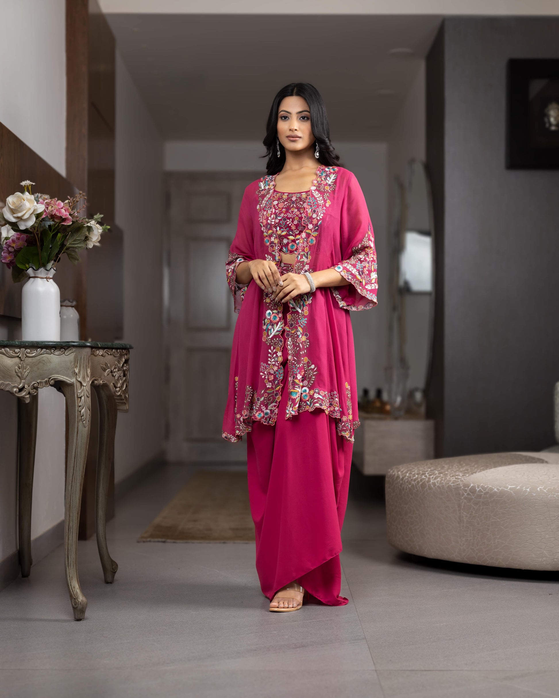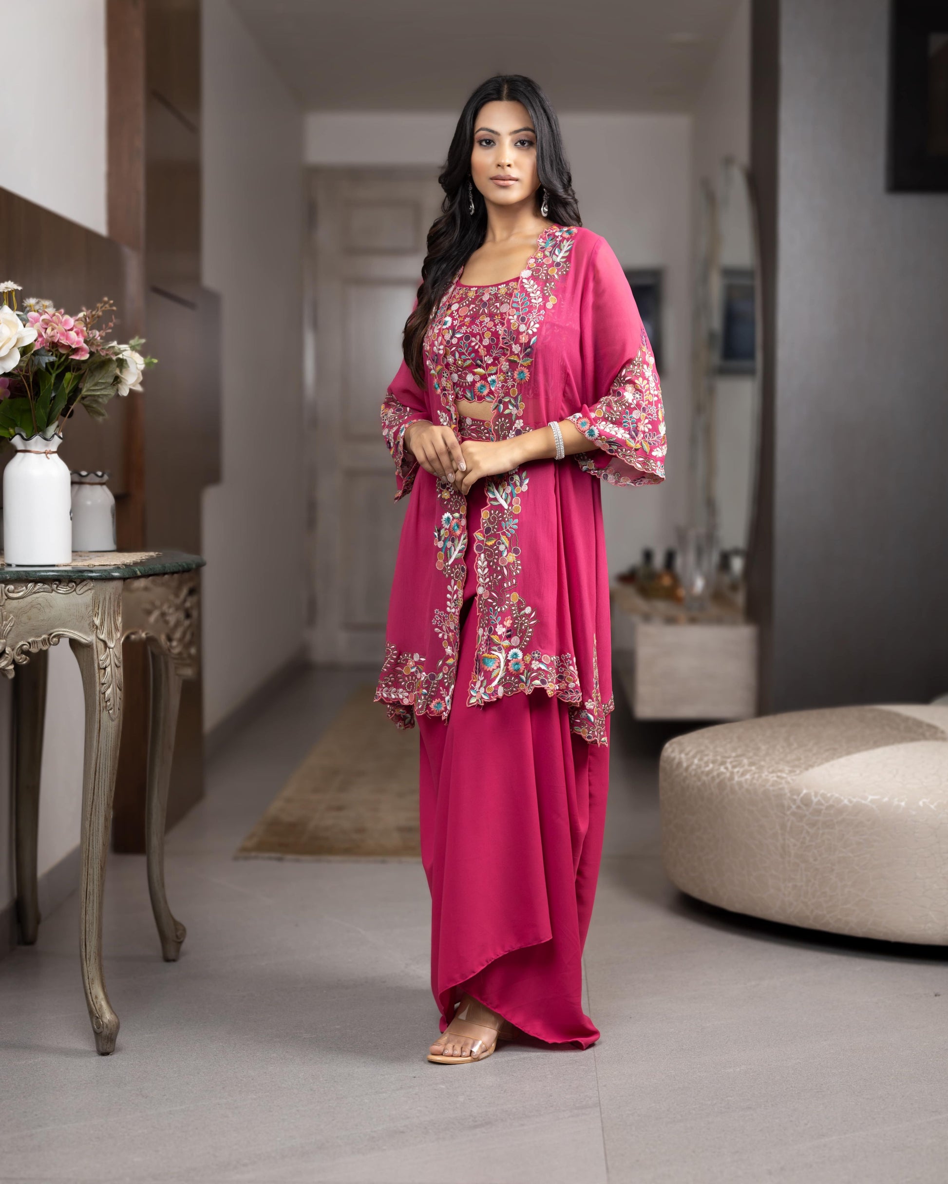Multi-coloured thread embroidered cape jacket with crop top and pleated skirt.