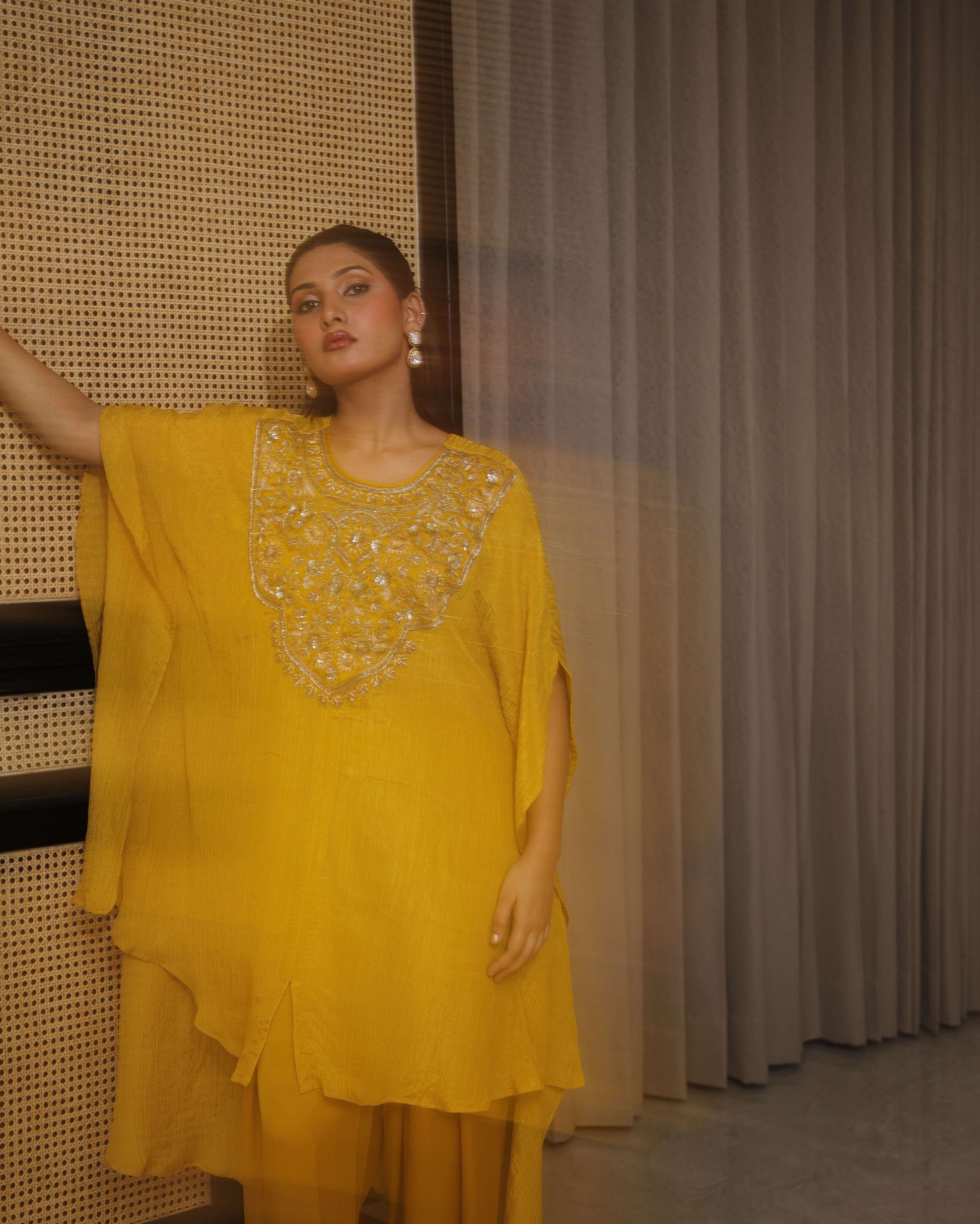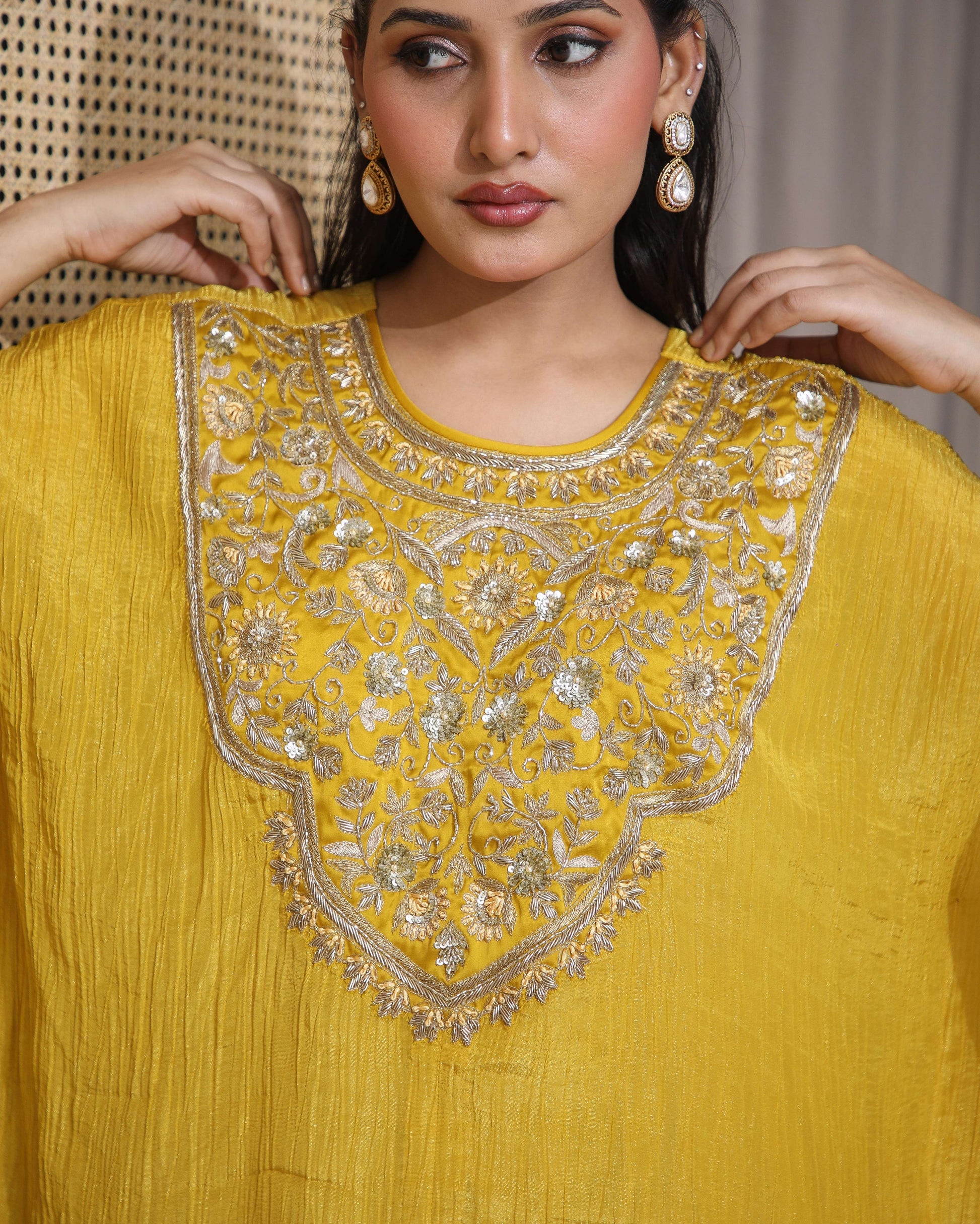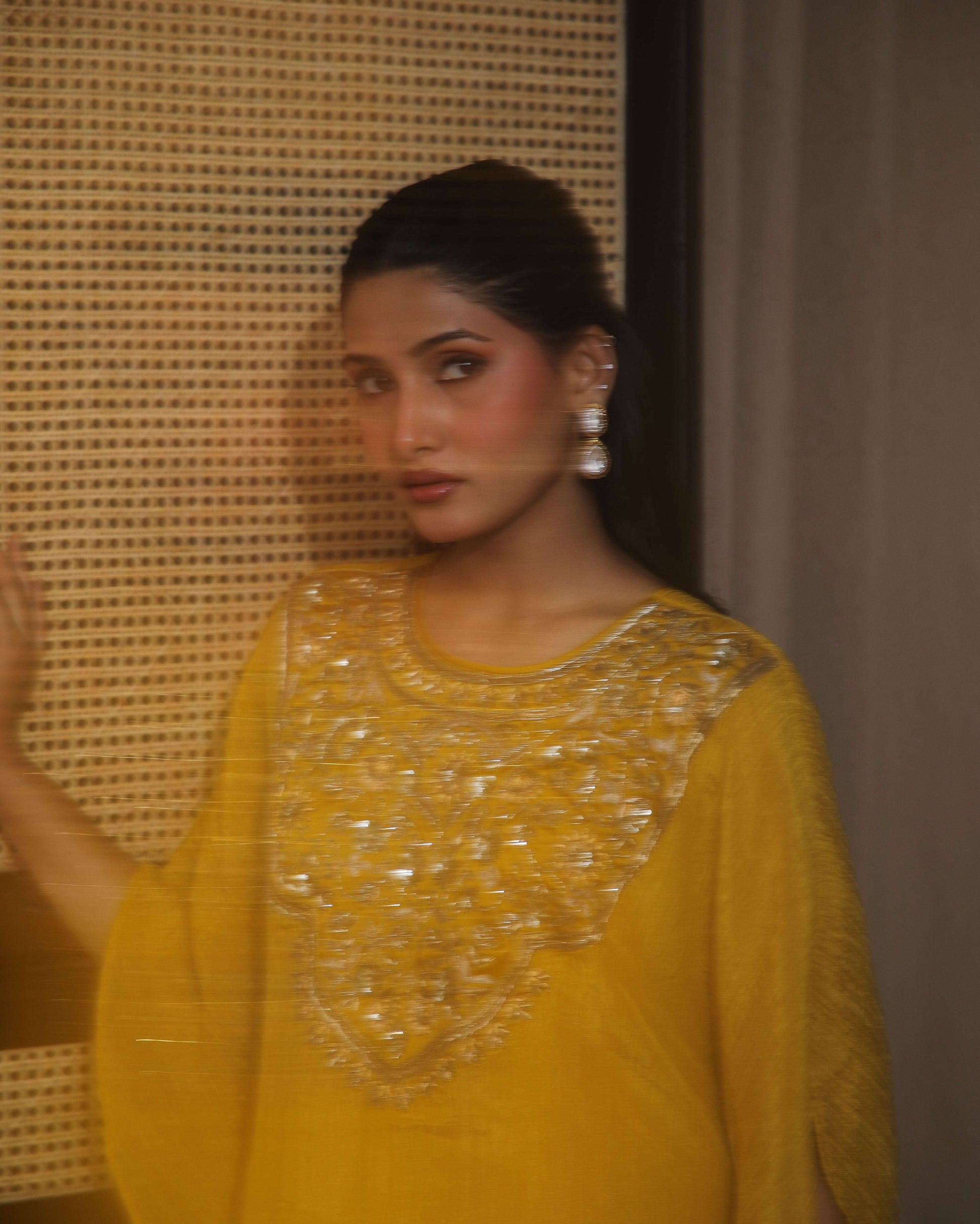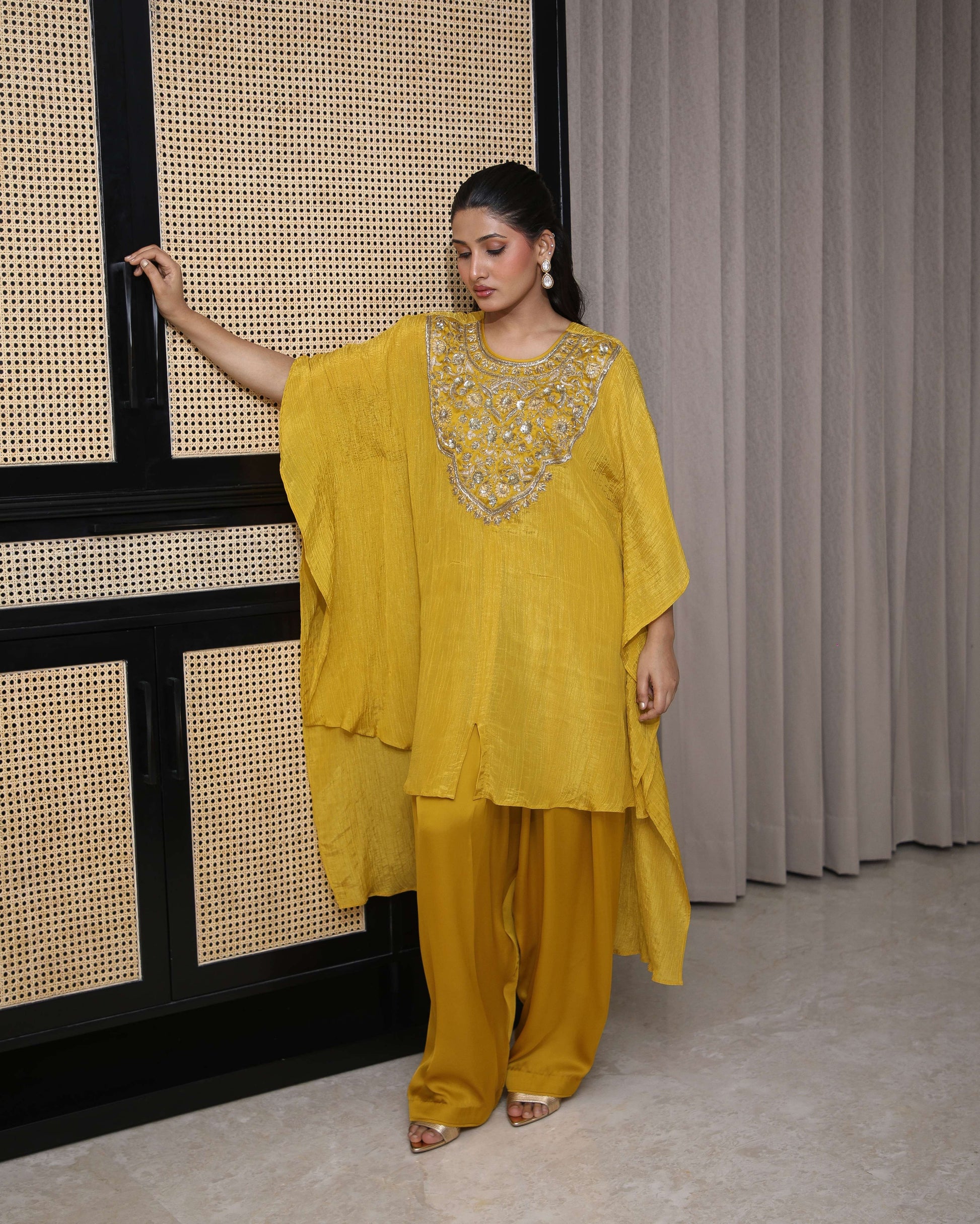 Pure organza tissue kaftan kurta, hand-embroidered to perfection, paired with a satin farshi salwar — graceful and contemporary.