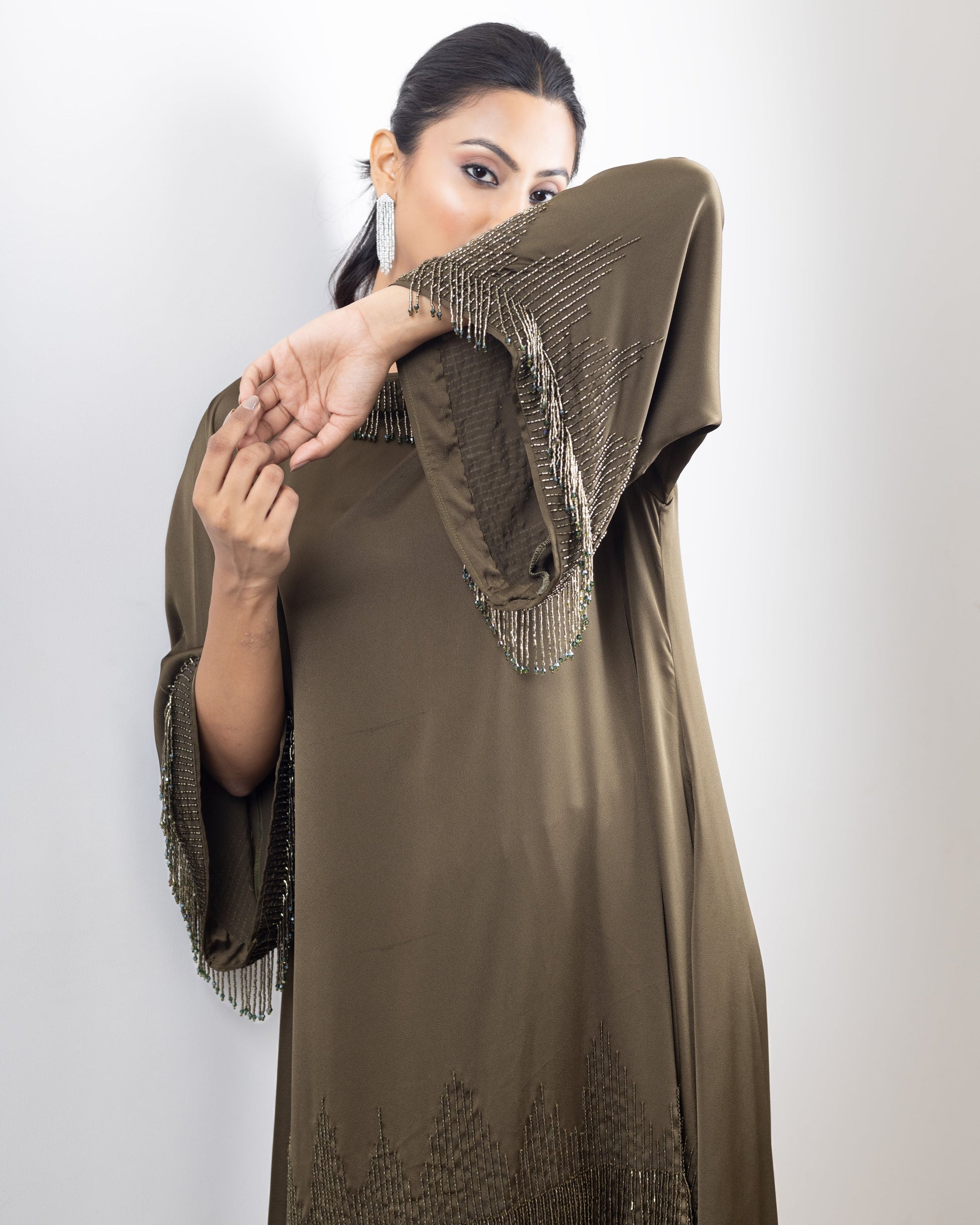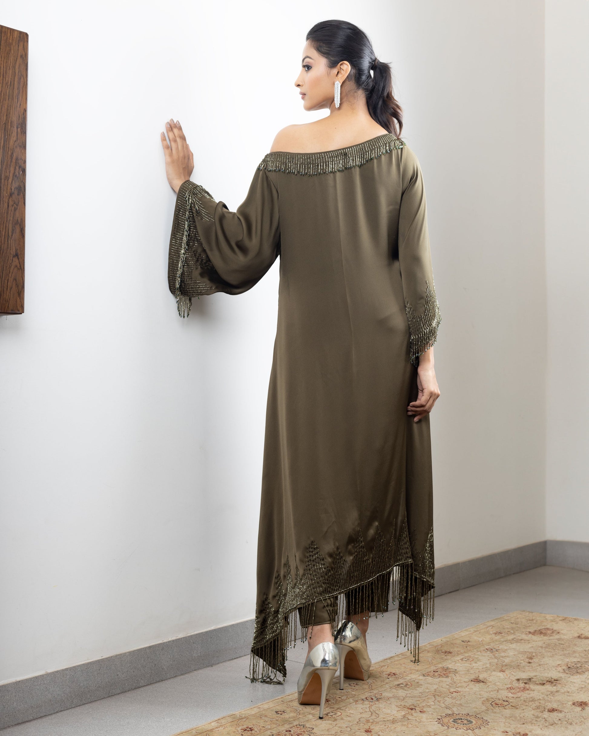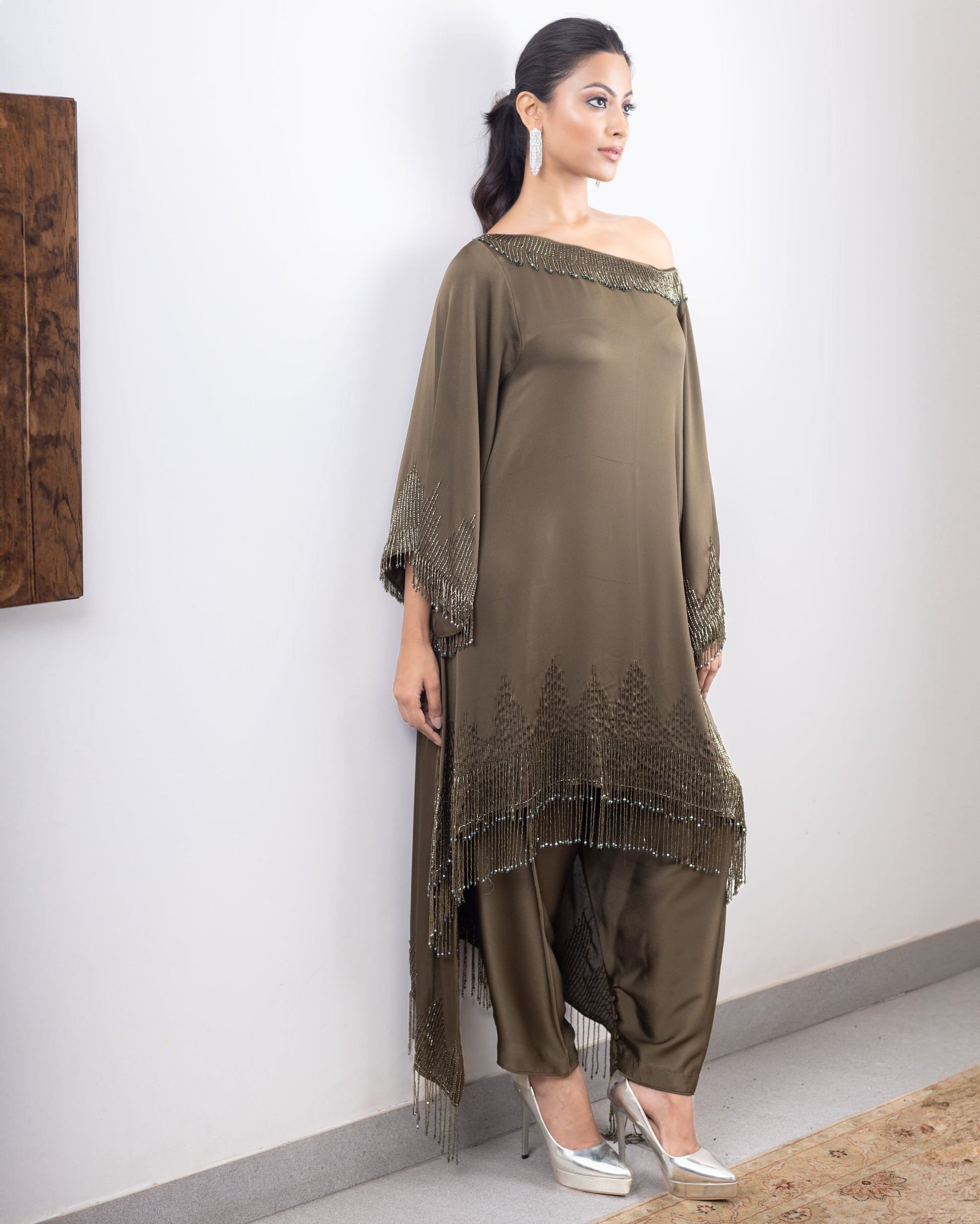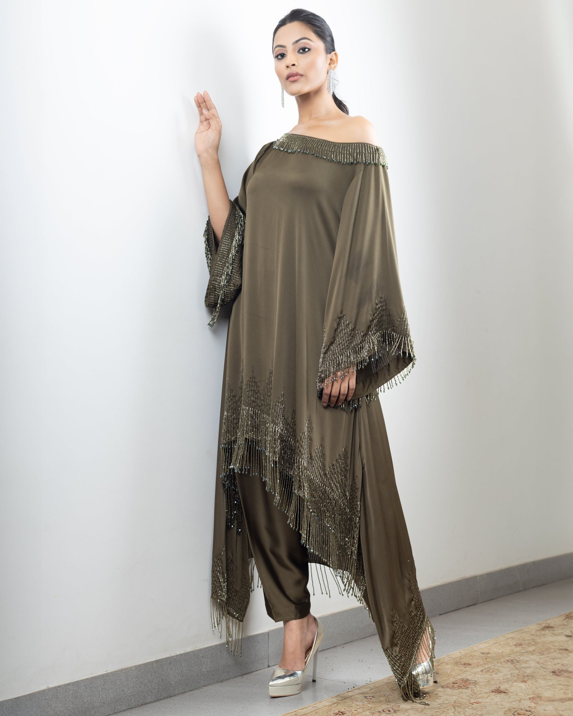 Hand-embroidered assymetrical tassle kurta paired with dhoti or palazzos. Can be customised in more colours.