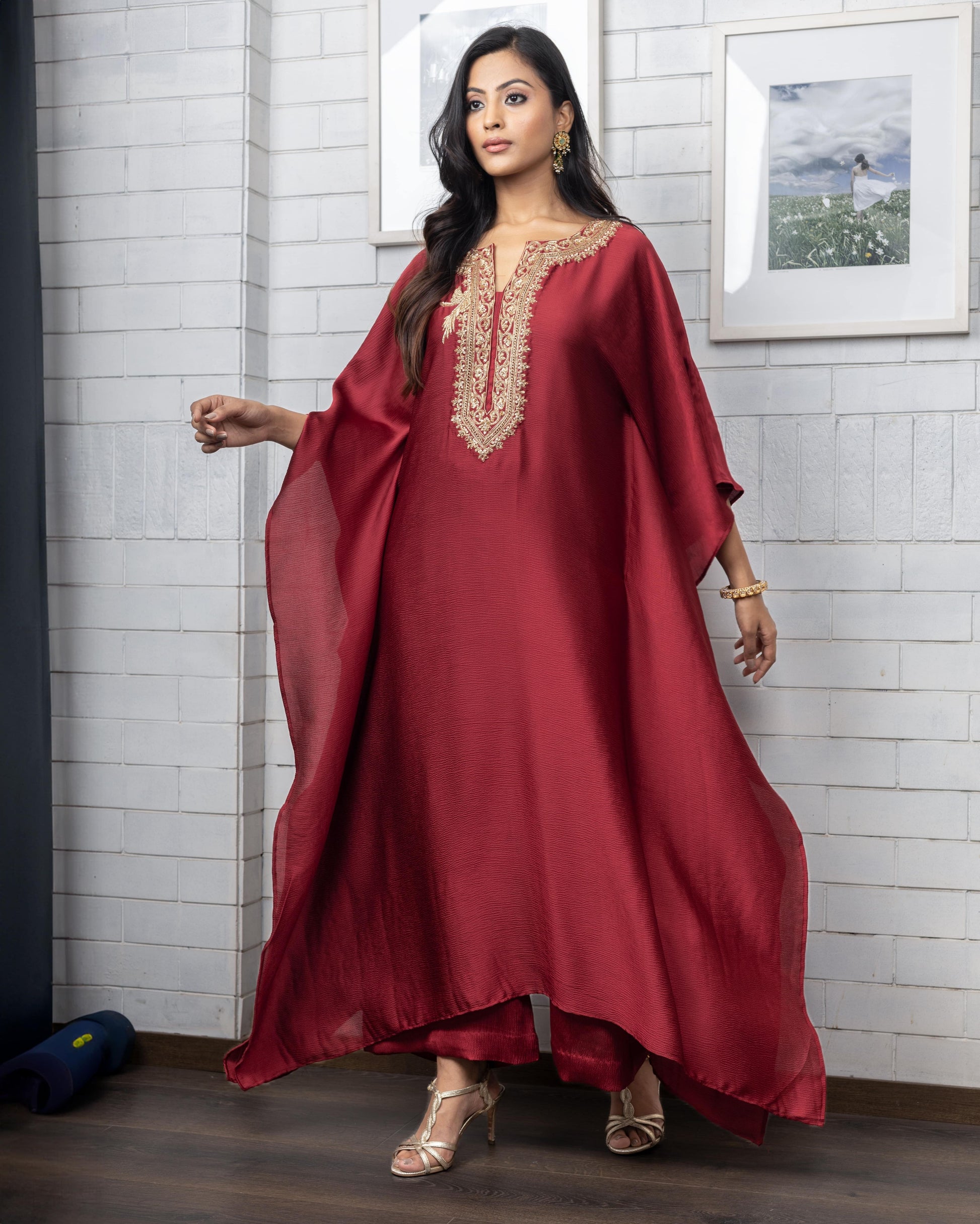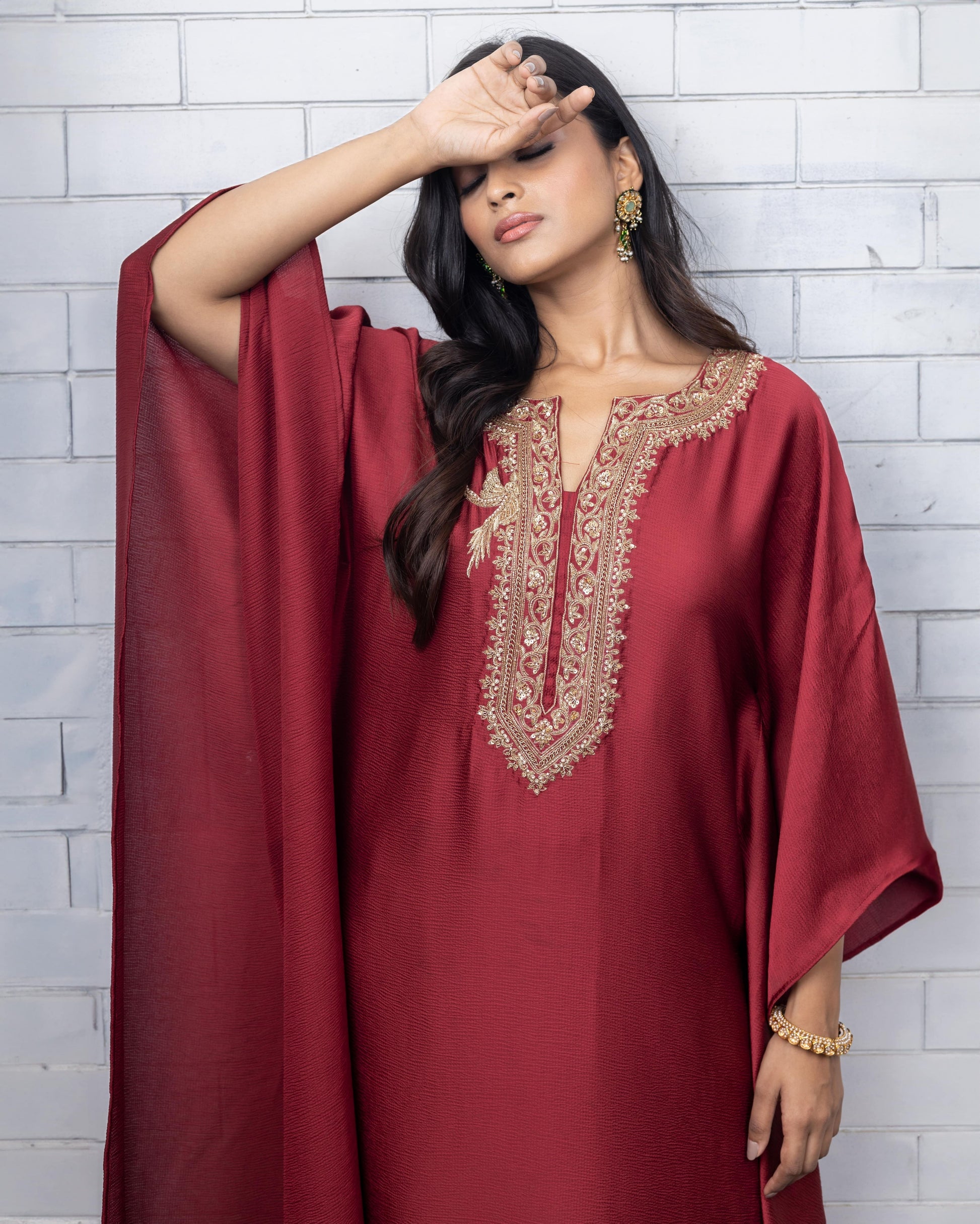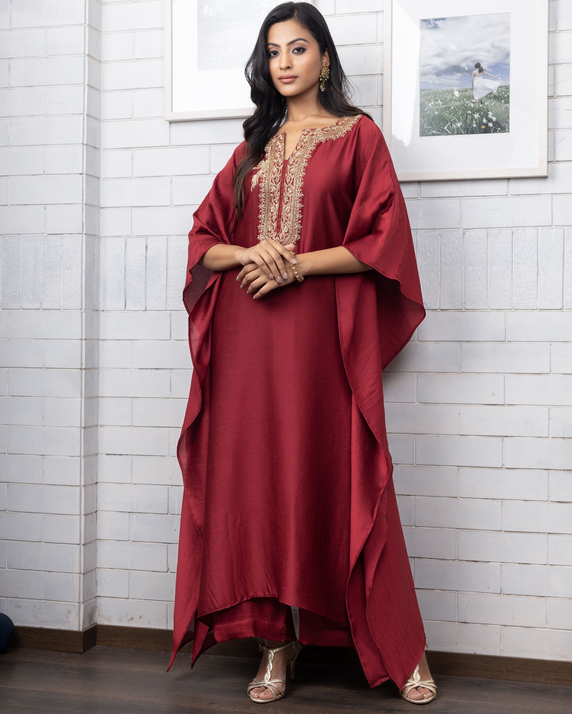 Satin silk kaftan with hand dabka and sequence embroidery which can be paired with dhoti or palazzo. Can be customised in more colours.