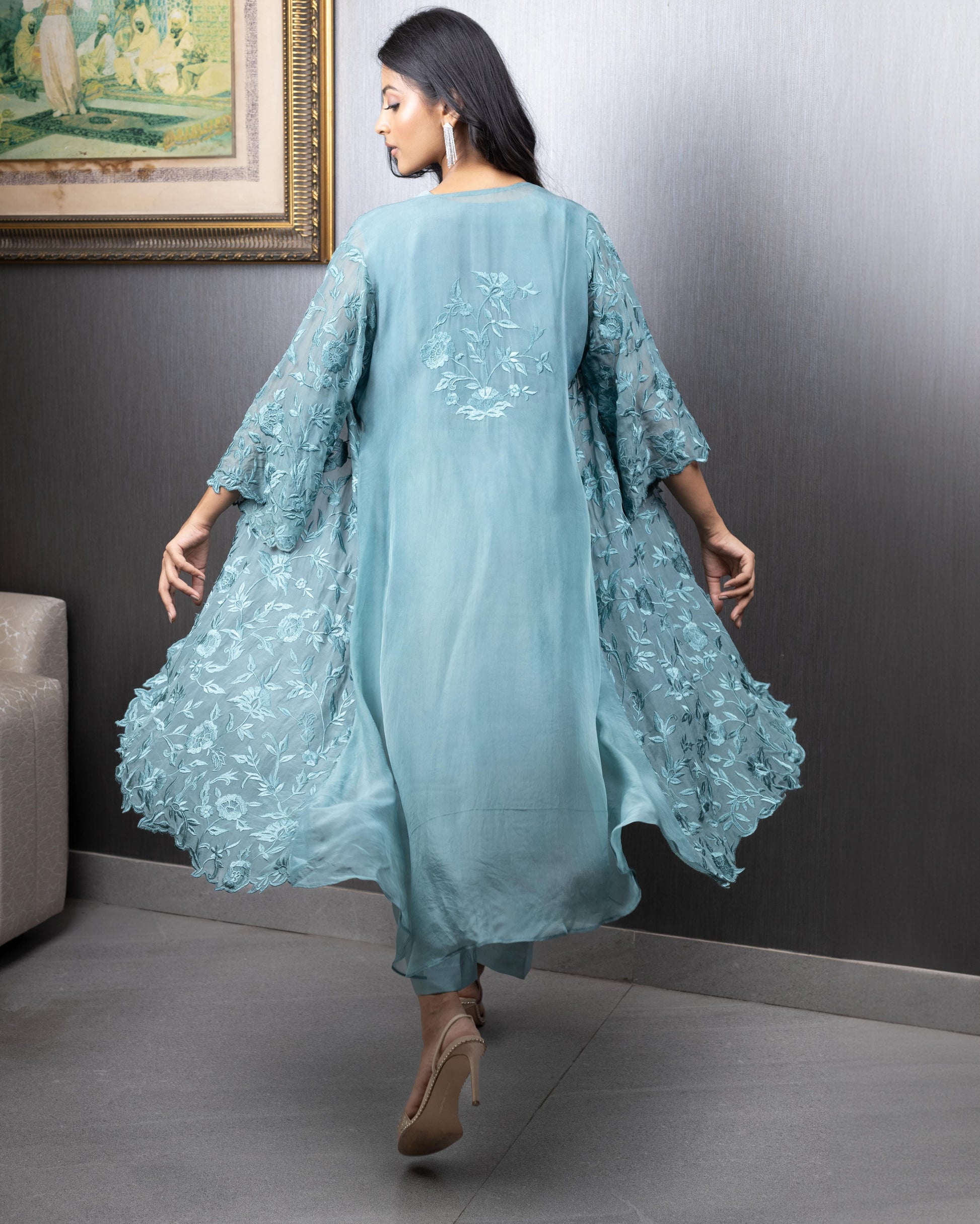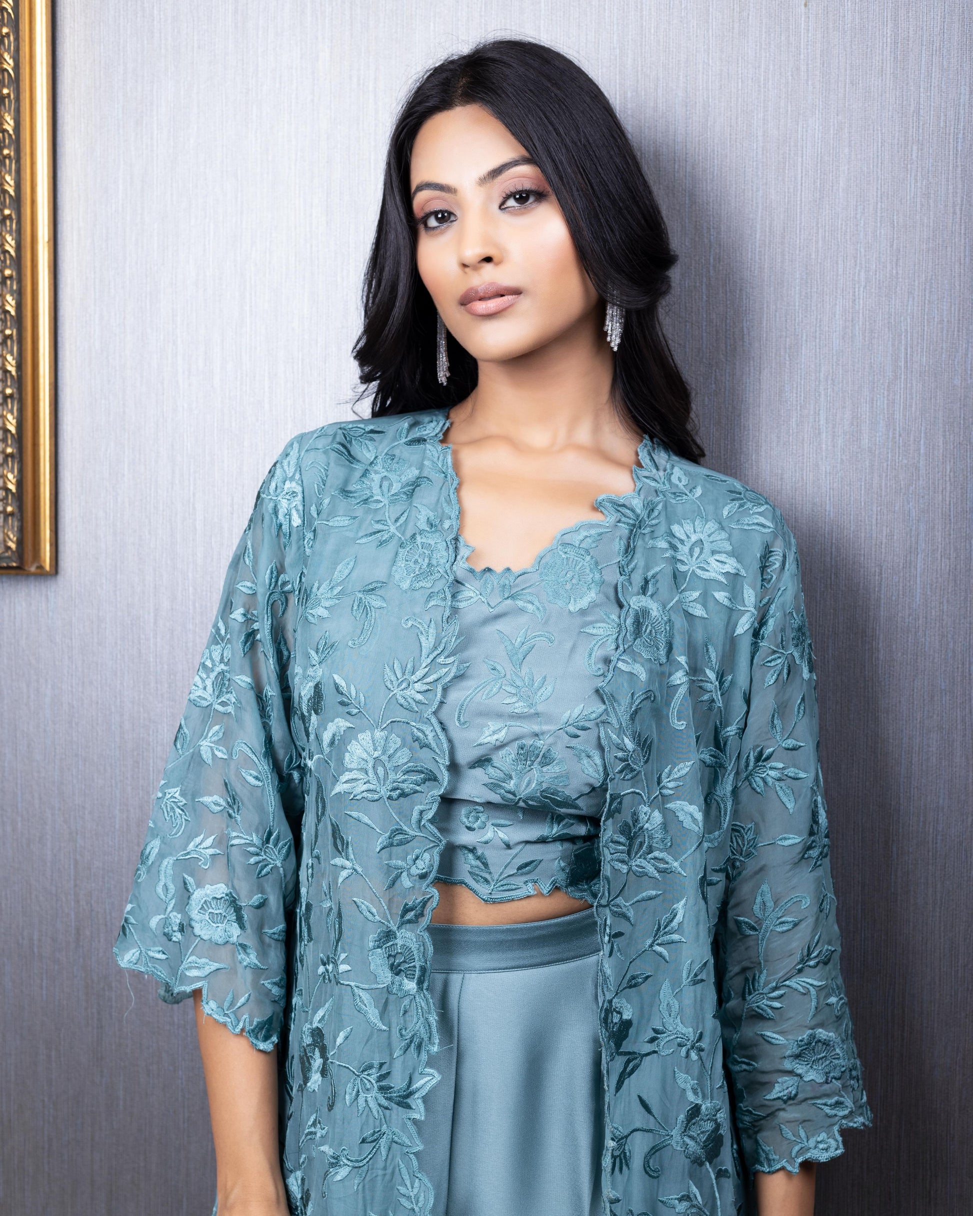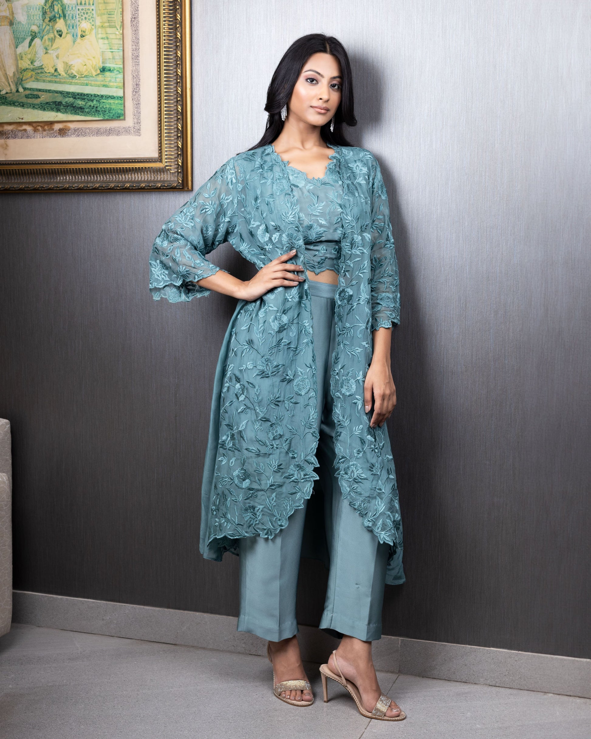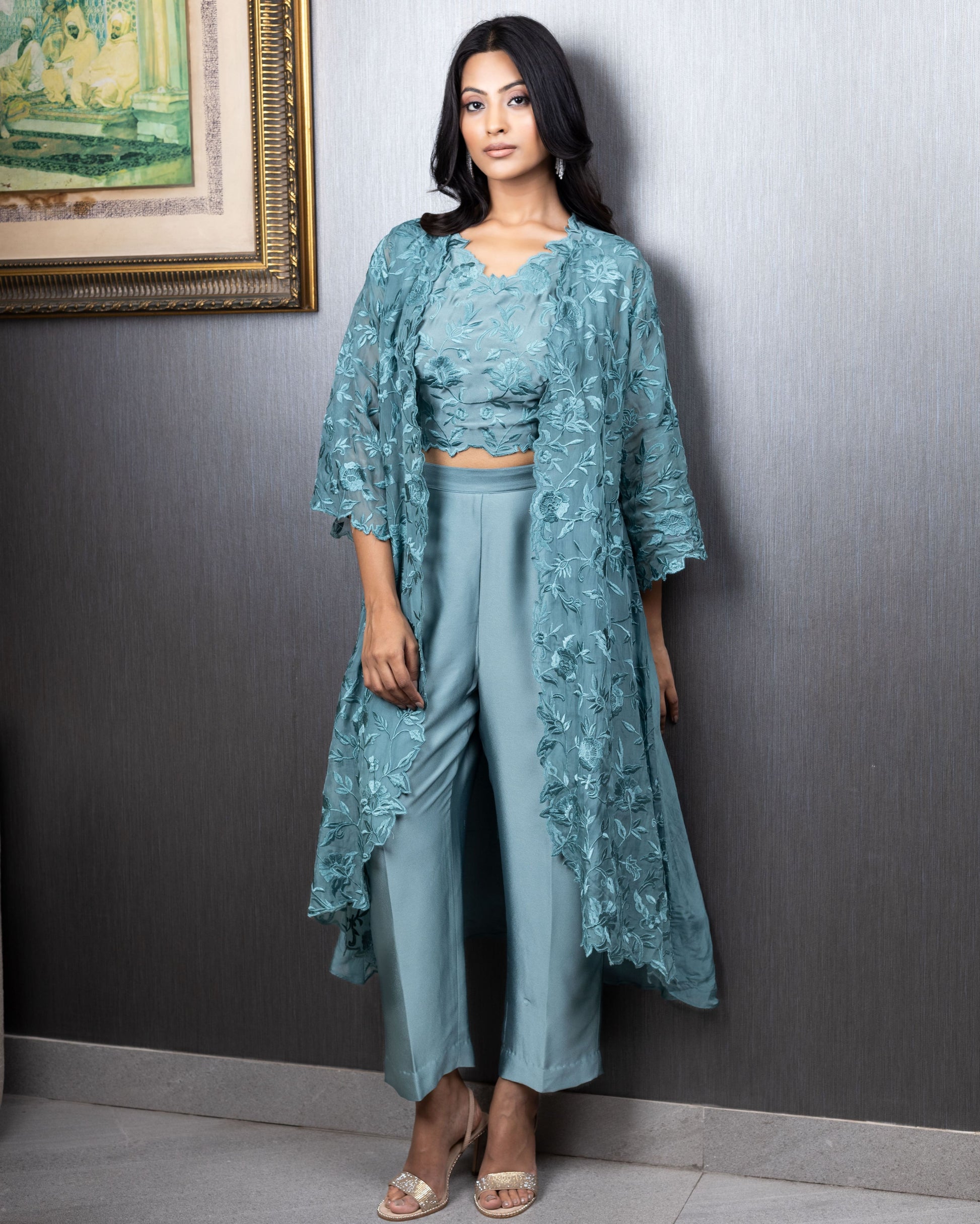 Self-thread embroidered jacket in organza paired with a crop top and flared pants. Can be customised in more colours.