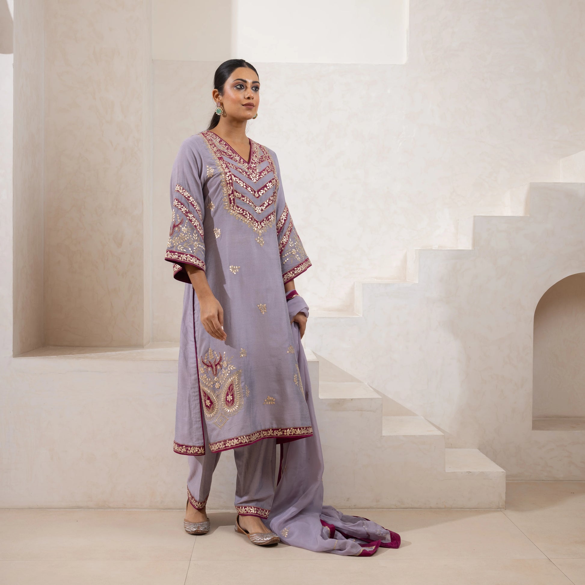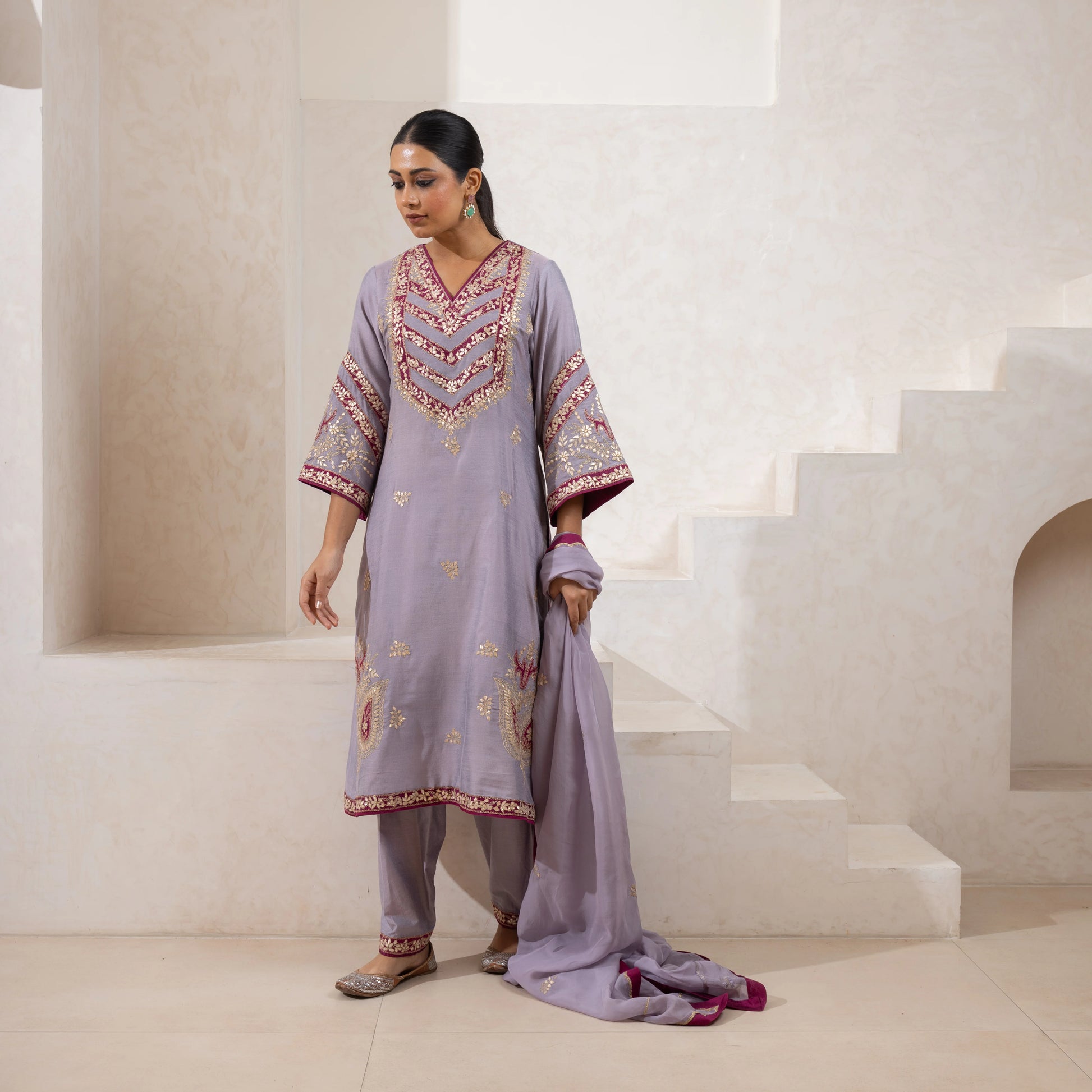 Appliqué and Aari zari-embroidered kurta set in pure cotton silk, paired with an embroidered Farshi and an organza dupatta. Customizable in any color.