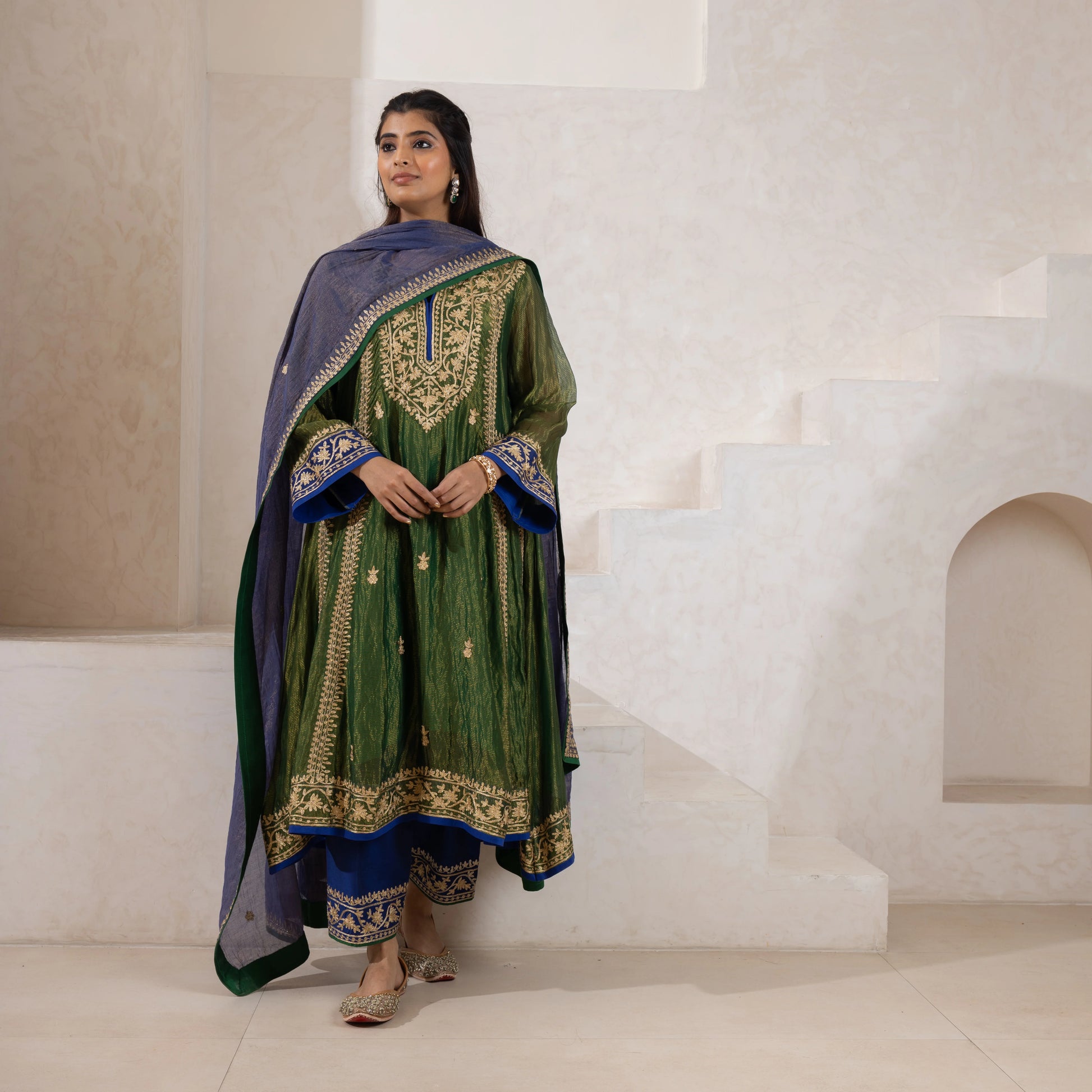 Emerald green Chanderi silk kurta set with gold Aari zari embroidery, paired with embroidered Farshis and a Banarasi tissue gold-striped dupatta.