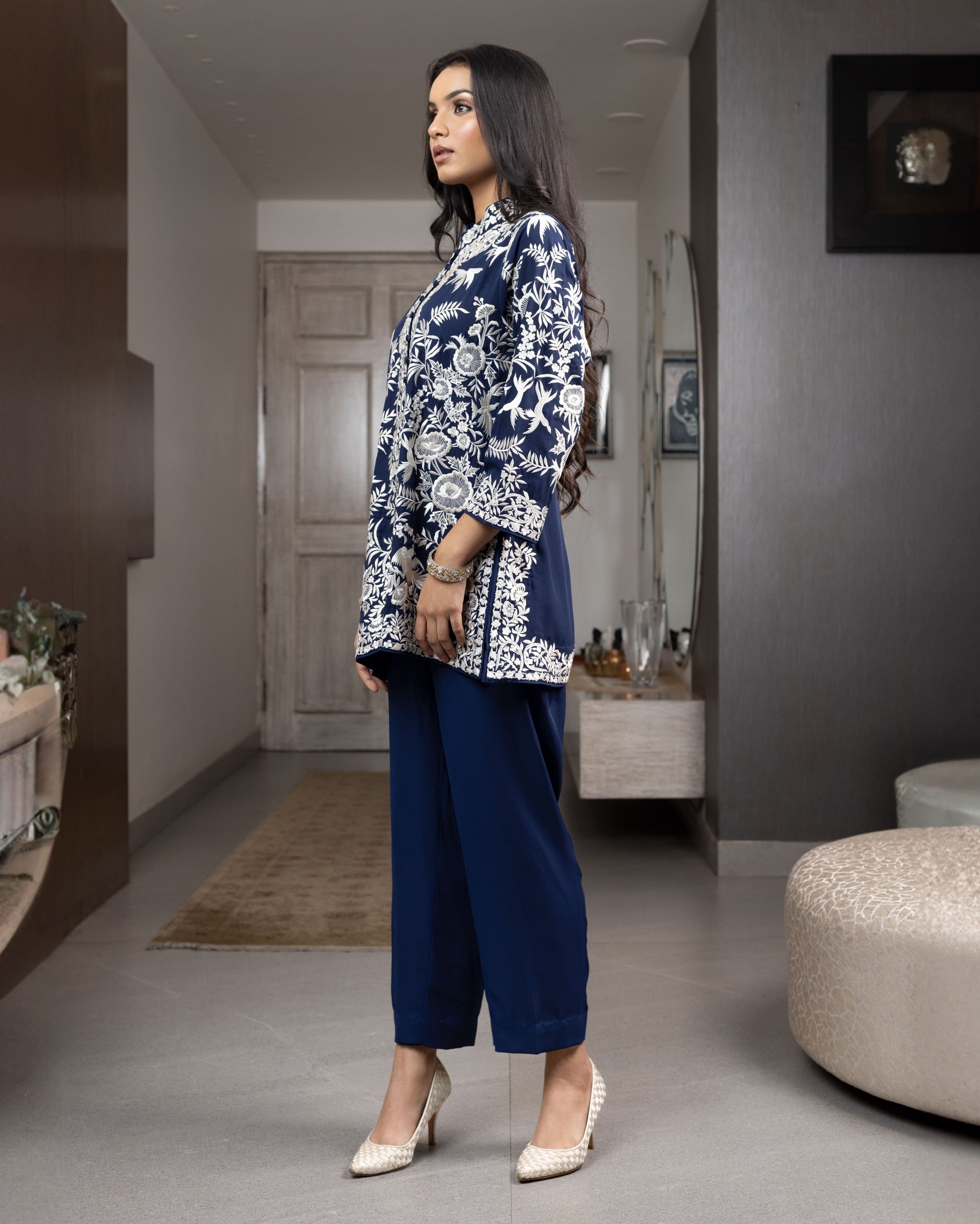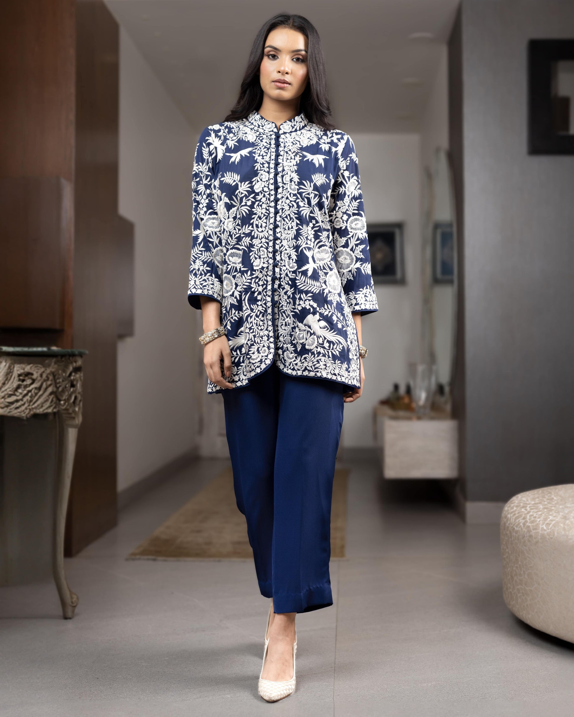 Parsi gara embroidered kurta jacket with straight pants, can also be paired with a dhoti.