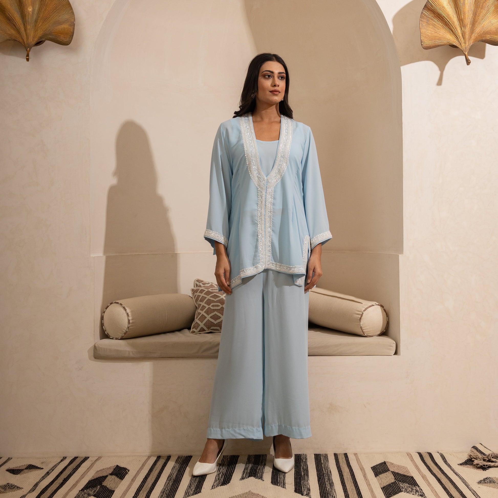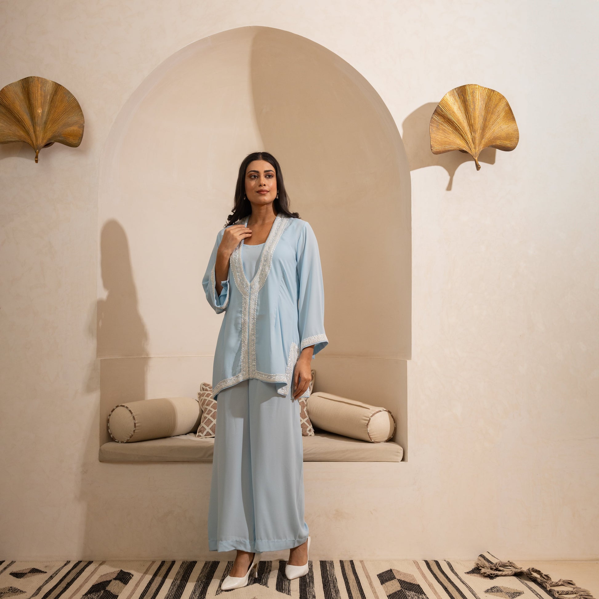 Pearl hand-embroidered coord set, available in powder blue with customizable color options.