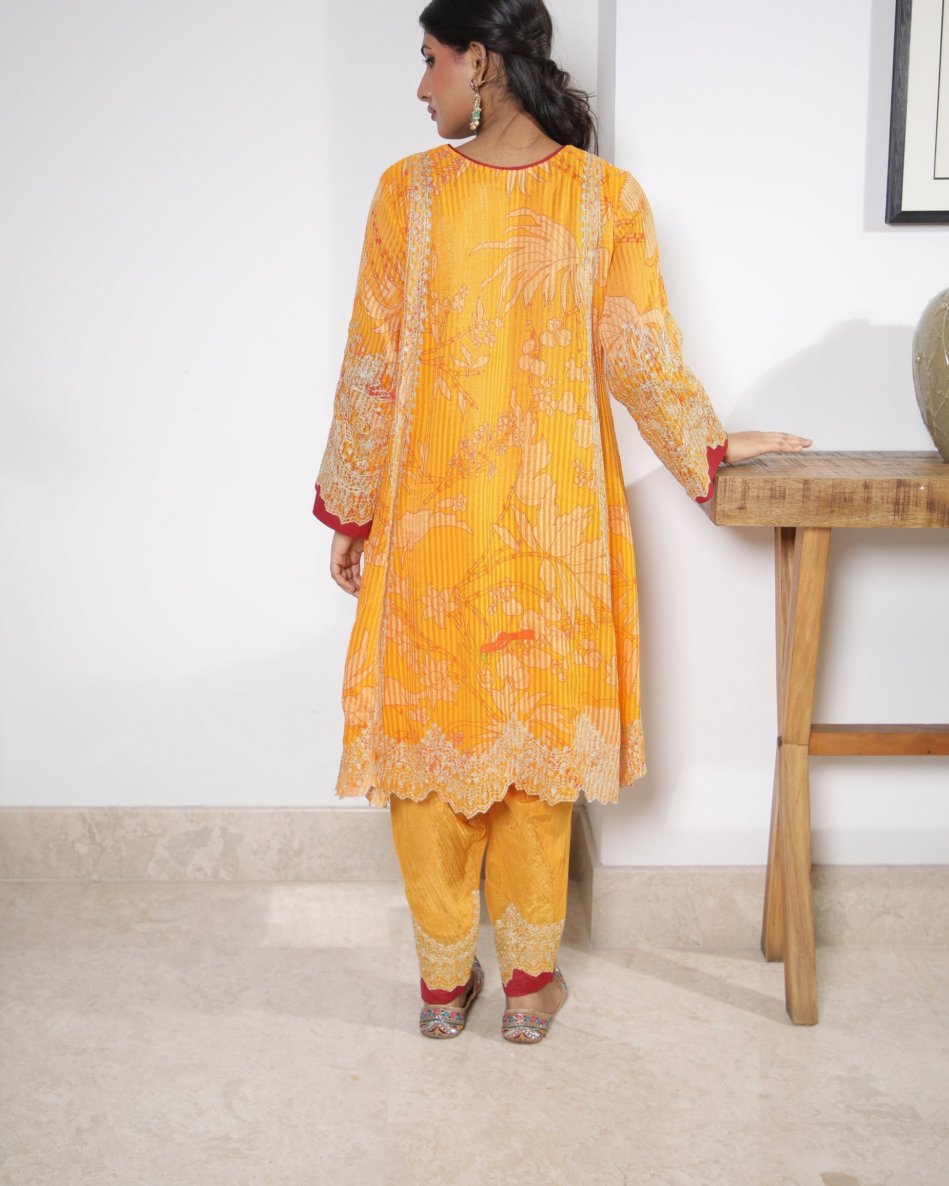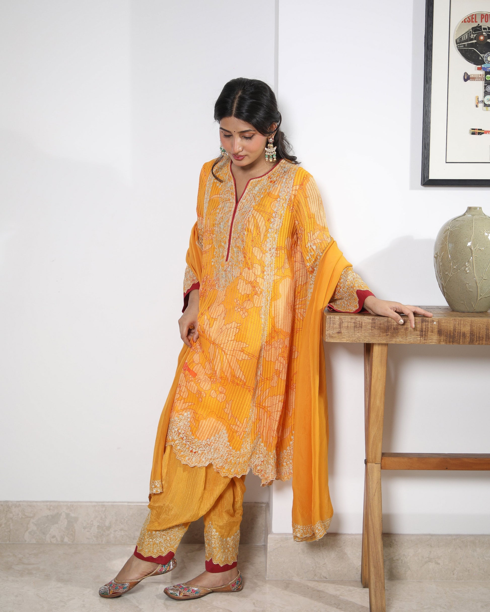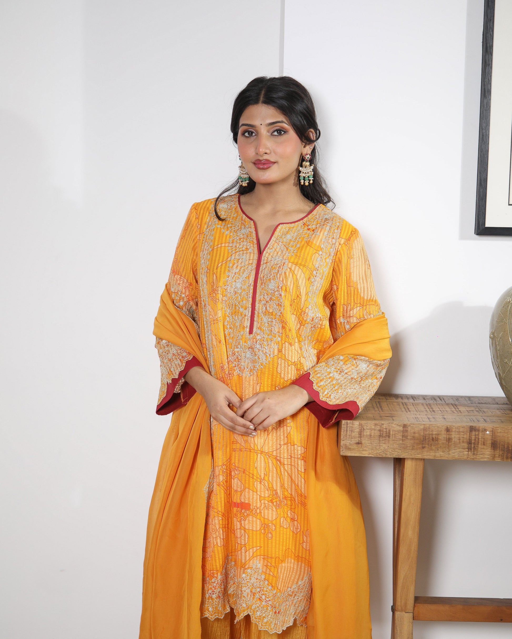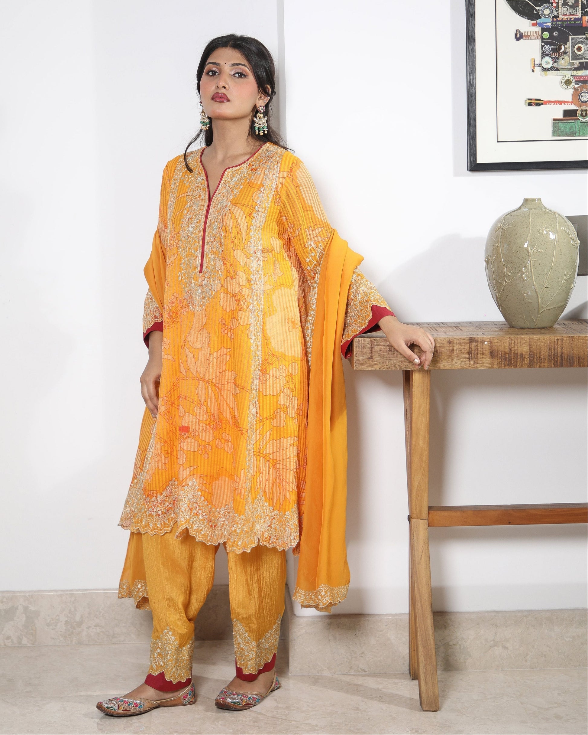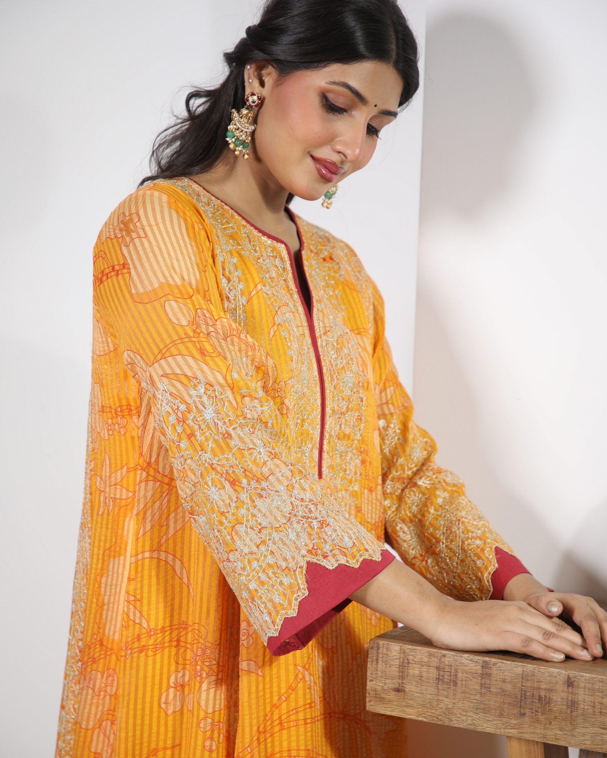 Limited edition printed tissue gota sets, finished with delicate single aari-zari embroidery — festive and exclusive.