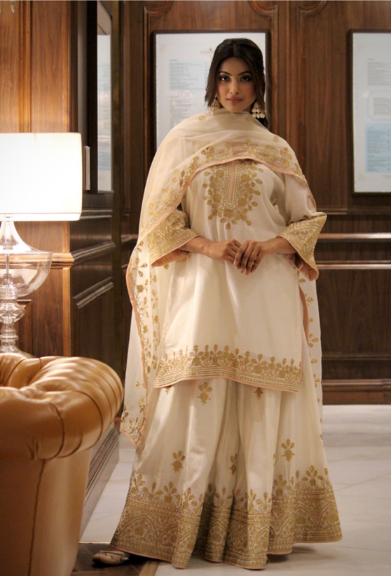 Off white and gold aari zari embroidered kurta and sharara set paired with organza dupatta