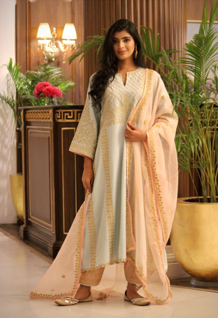 paired with embroidered Pakistani salwar and duppatta.