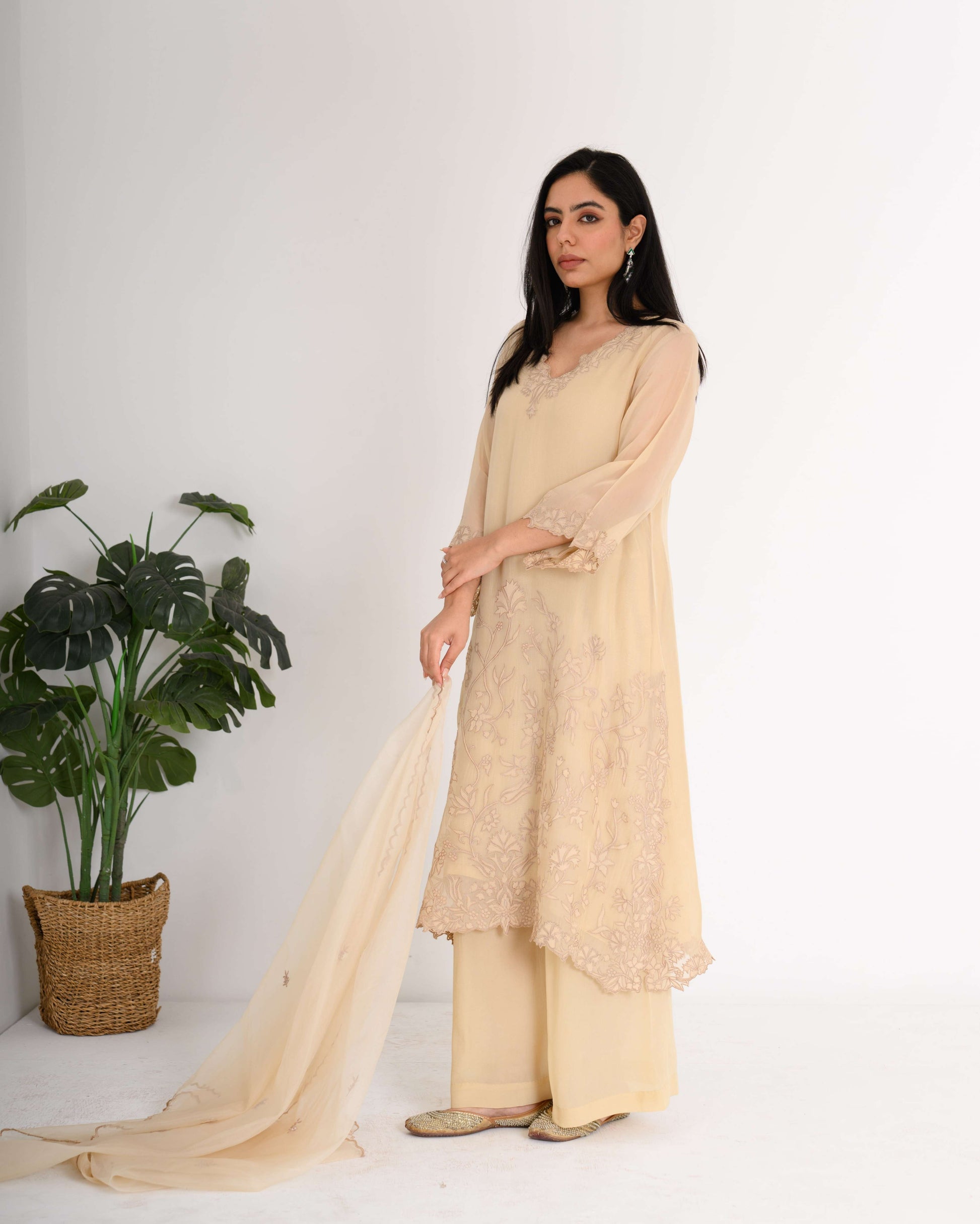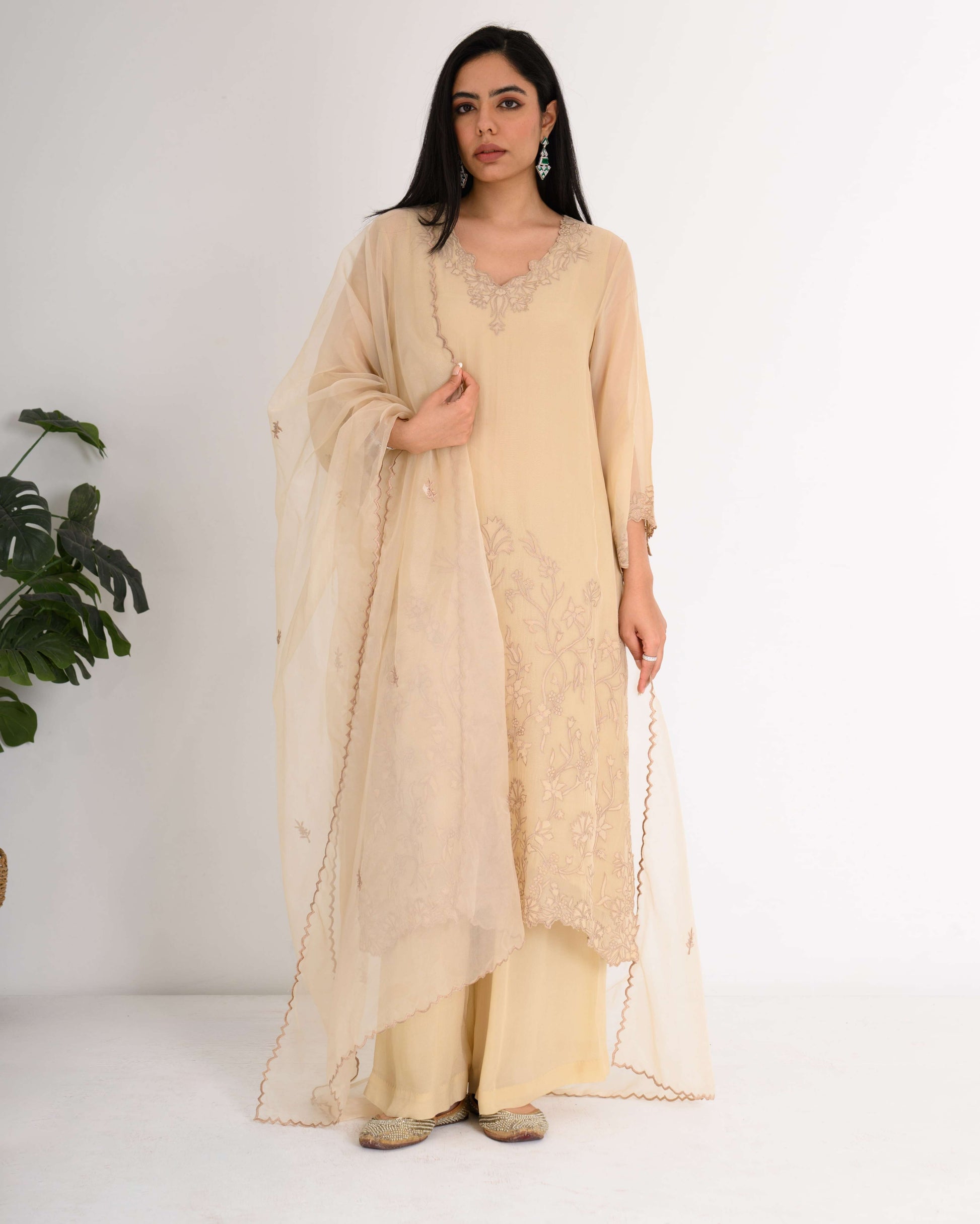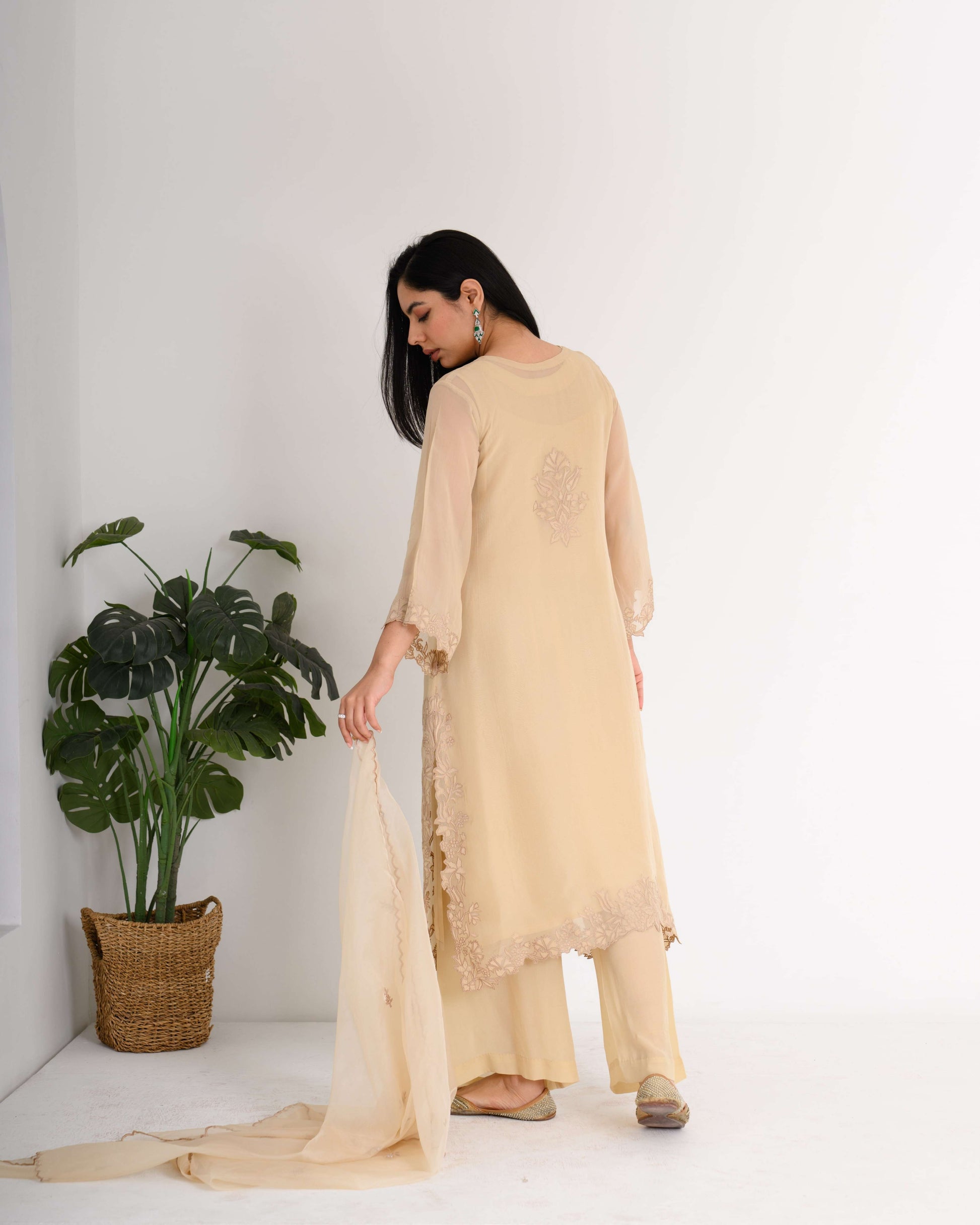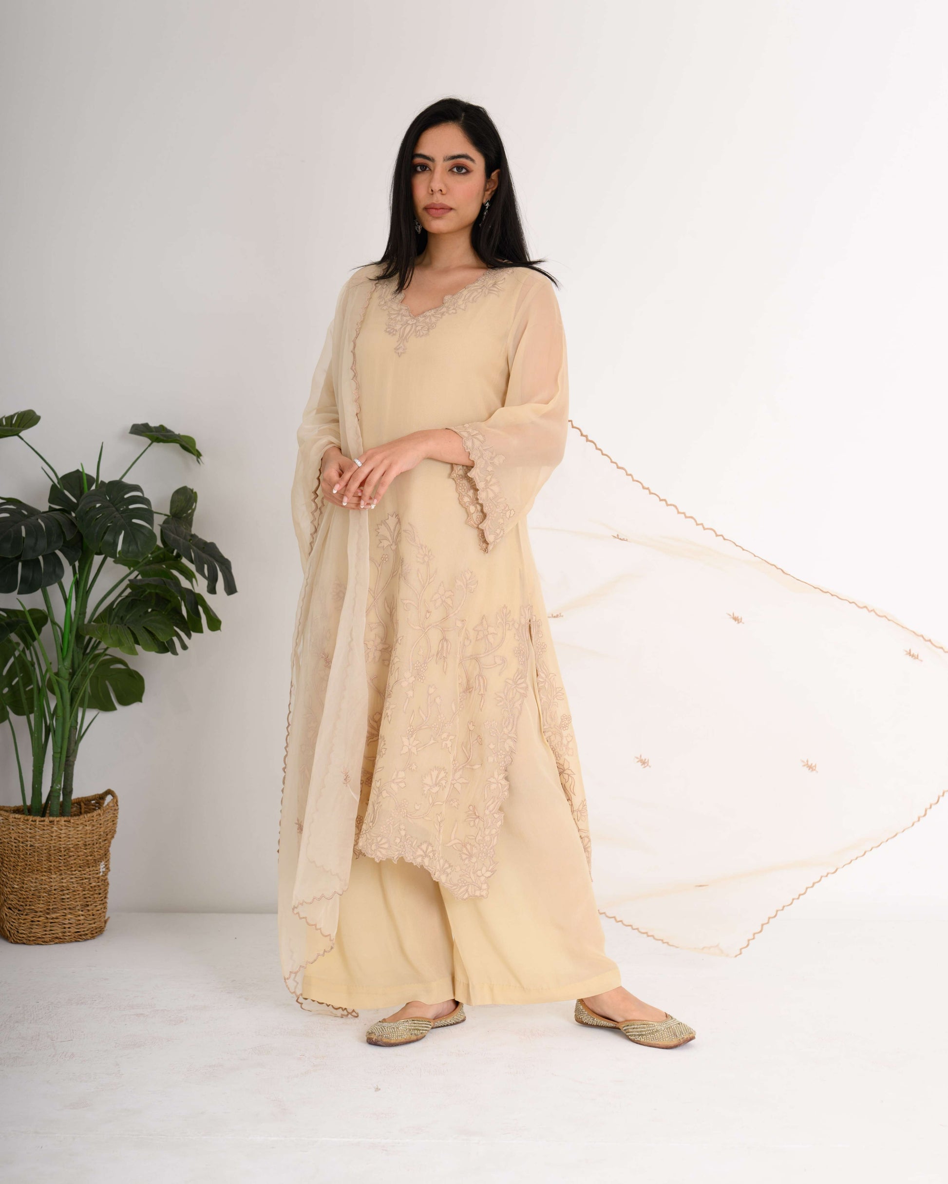 Appliqué Organza Kurta Set– Crafted in pure butter organza with intricate appliqué embroidery, paired with an embroidered organza dupatta.